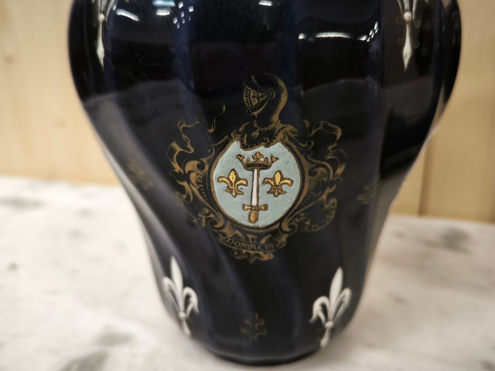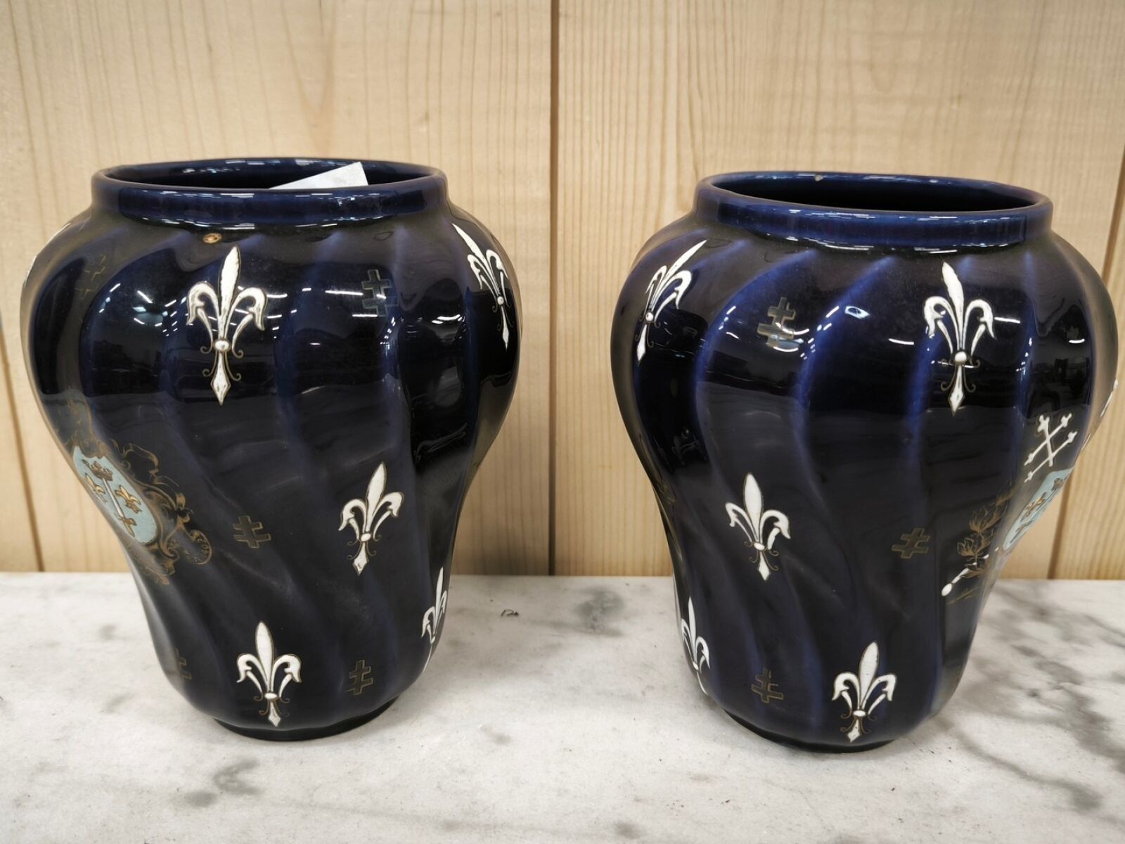 A pair of blue enamelled earthenware planters decorated with a coat of arms, fleurs-de-lis and a Lorraine cross.