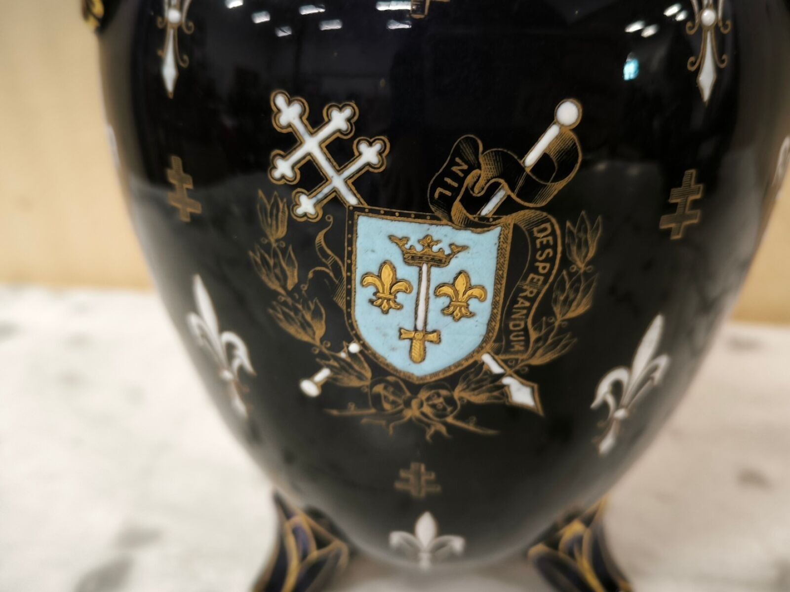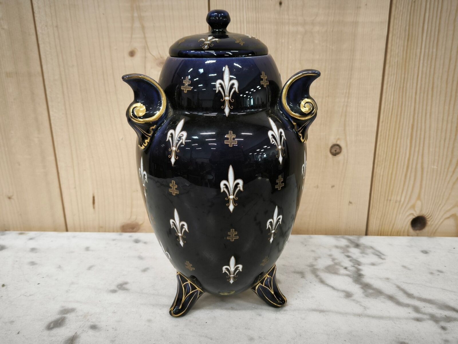 An enamelled earthenware covered pot with a blue background decorated with a coat of arms, fleurs de Lys and a Lorraine cross.