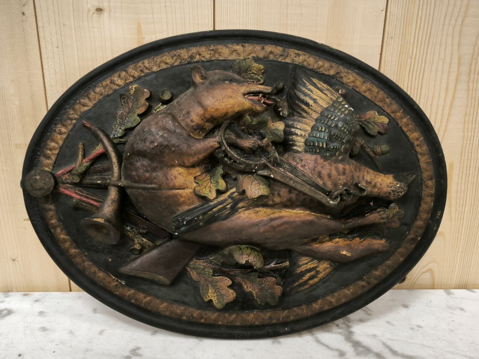 Polychrome painted plaster medallion depicting a still life with hunting trophies, hunting horn, gun, game, fox, etc...