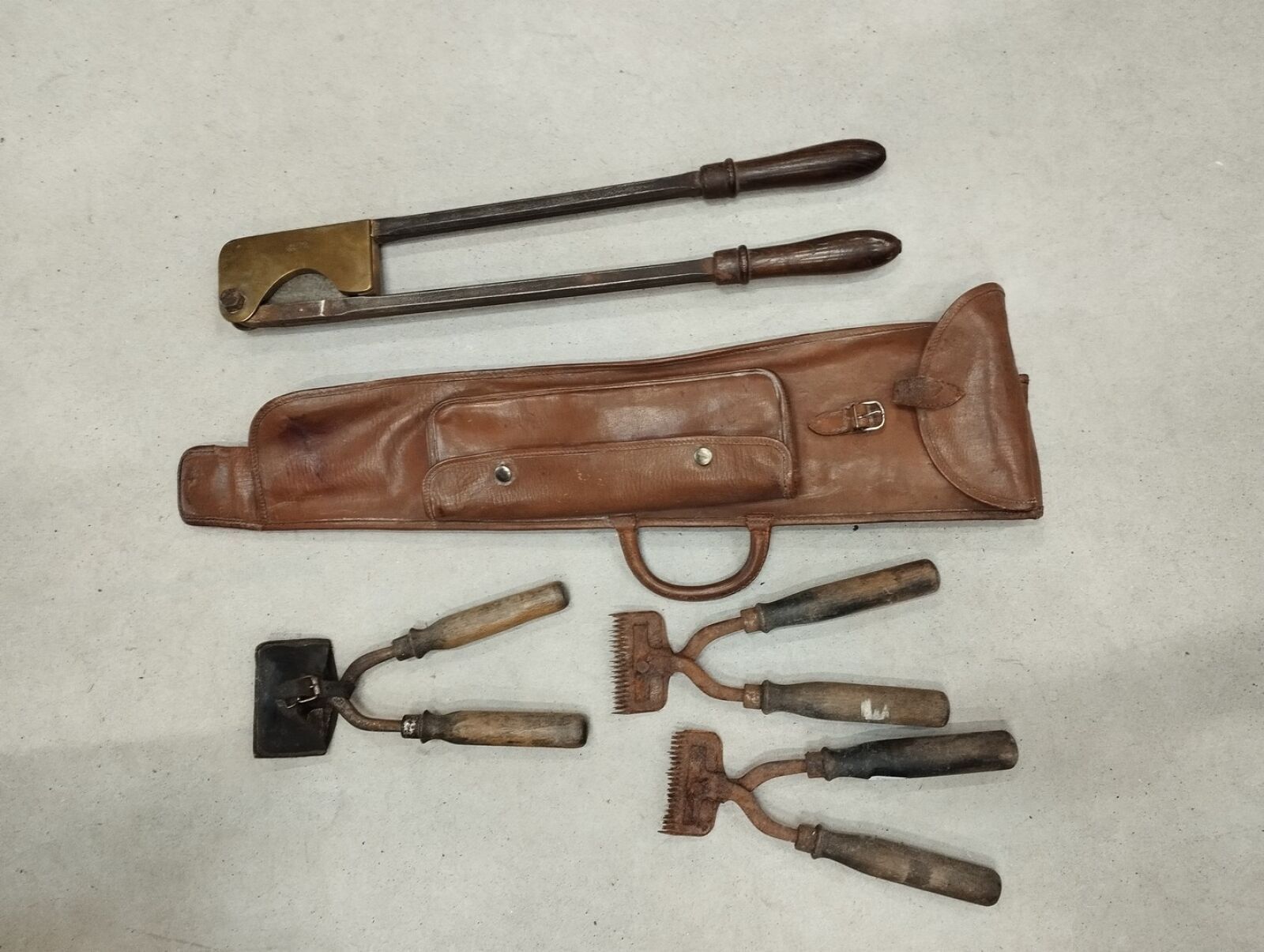 Set comprising a tail clipper (signed Cordonnier à Orléans, L.: 57 cm) and three manual clippers for horses. A leather gun case is included.