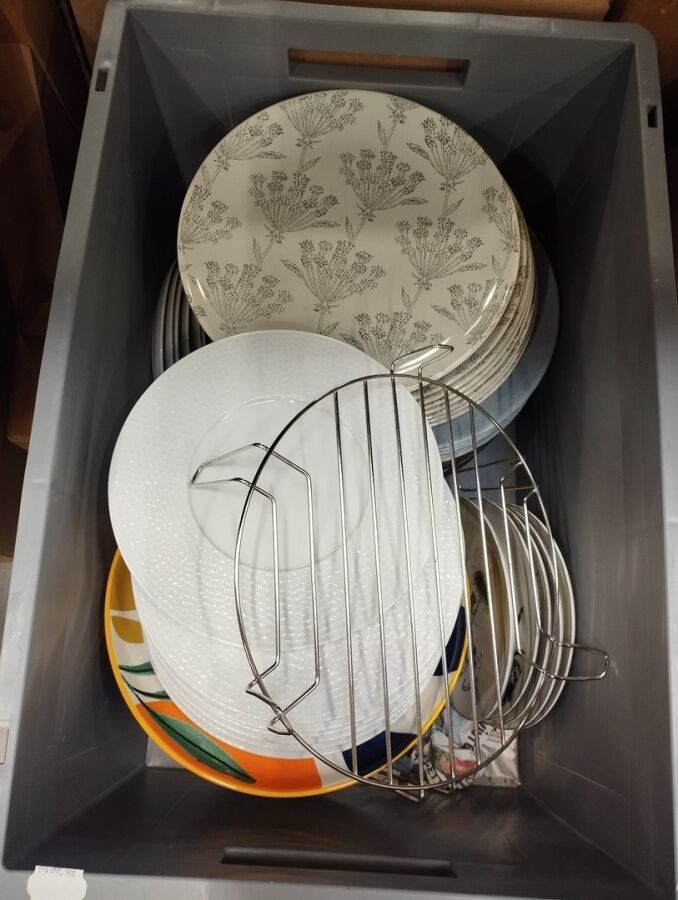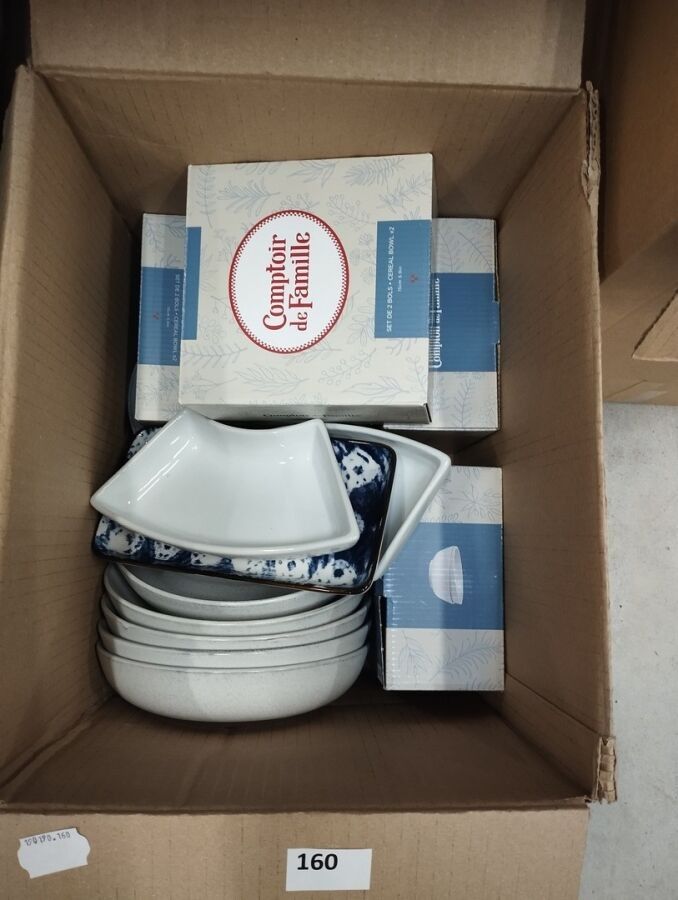 A set of everyday crockery including plates, bowls and cups (including Bouchara, Maison du Monde and others), together with a set of cutlery.