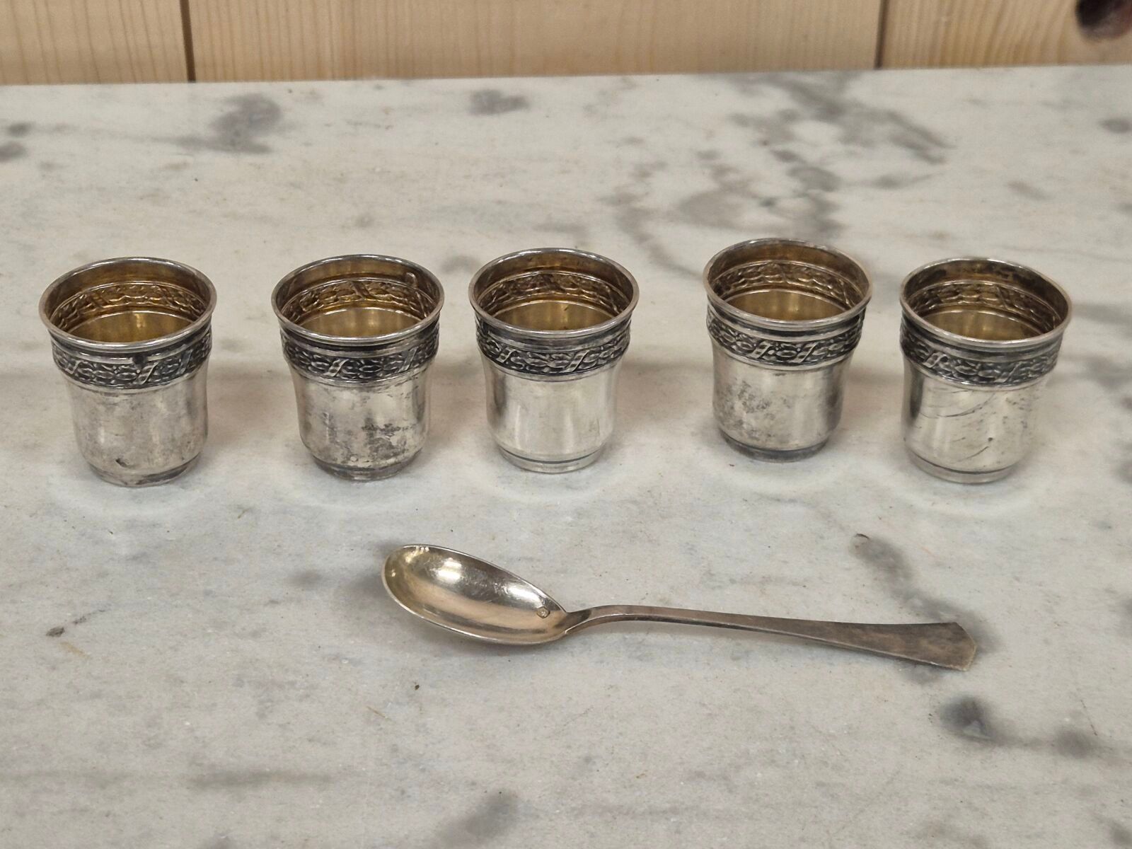 Set of 5 silver liqueur goblets and a silver egg spoon.