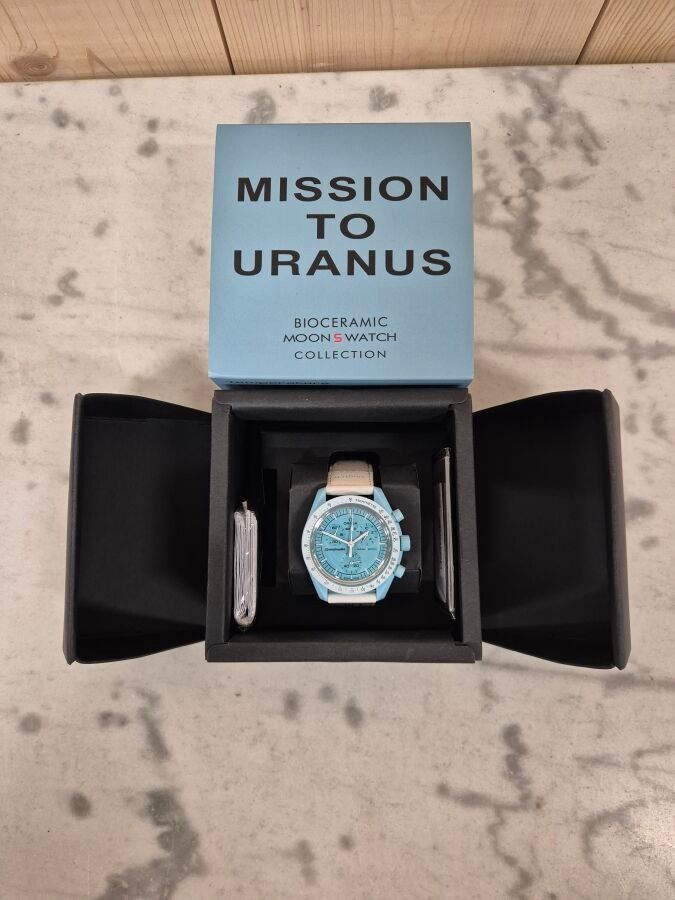 Mission to Uranus chronograph watch (turquoise blue) in bioceramic, Swatch-Oméga collaboration. Quartz movement.