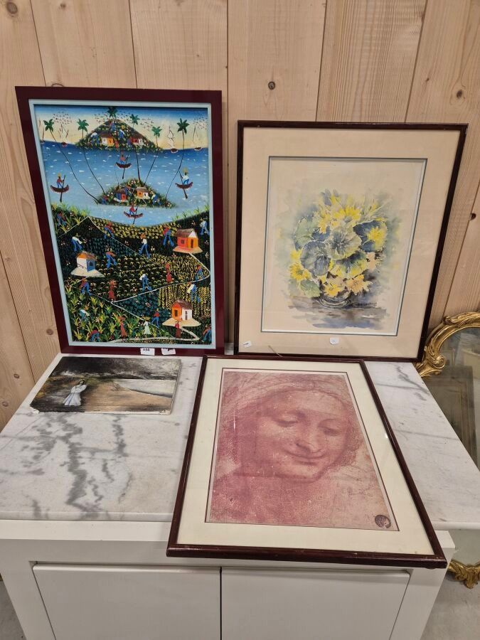 Lot of framed pieces, including a reproduction after Leonardo da Vinci, a 20th century Haitian school, a watercolour signed "Rambaud" and an oil on canvas signed "Rigel".