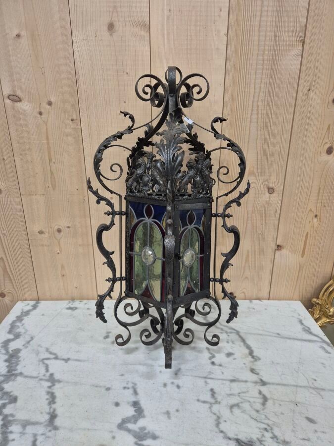 A pentagonal wrought iron vestibule lantern, decorated with heraldic lions, acanthus leaves and polychrome stained glass panels.