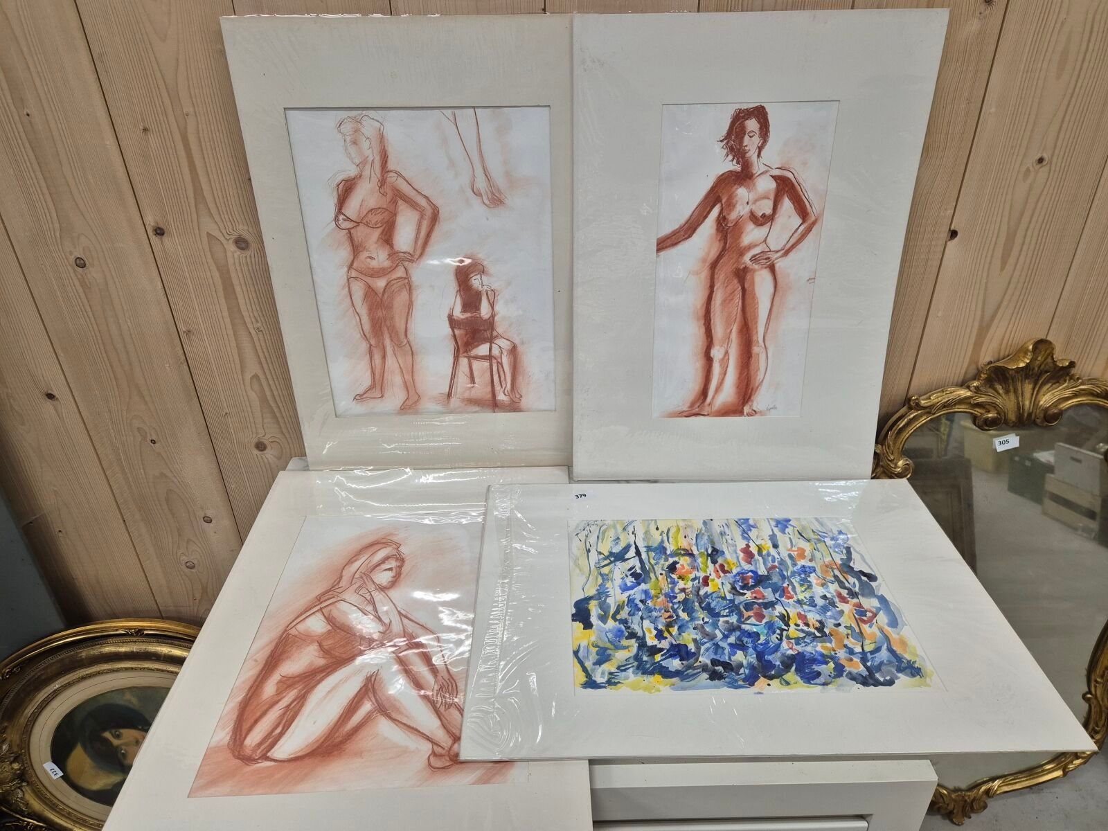 Lot of 4 works in red chalk or watercolour, 2 signed