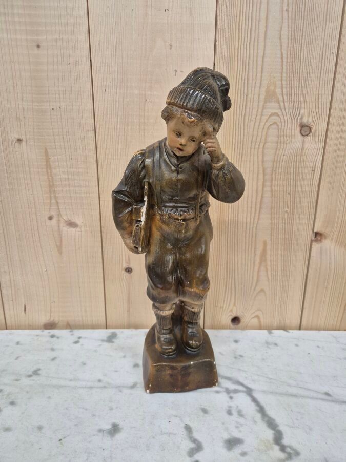 Patinated plaster group representing a young schoolboy, France, early 20th century (wear and tear, a large chip in a book)