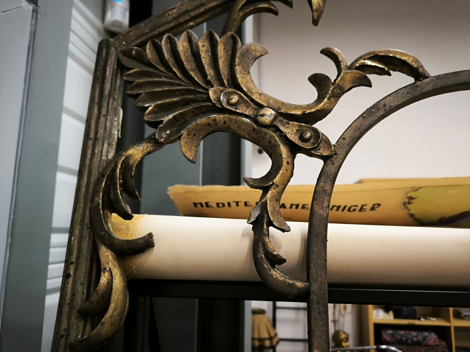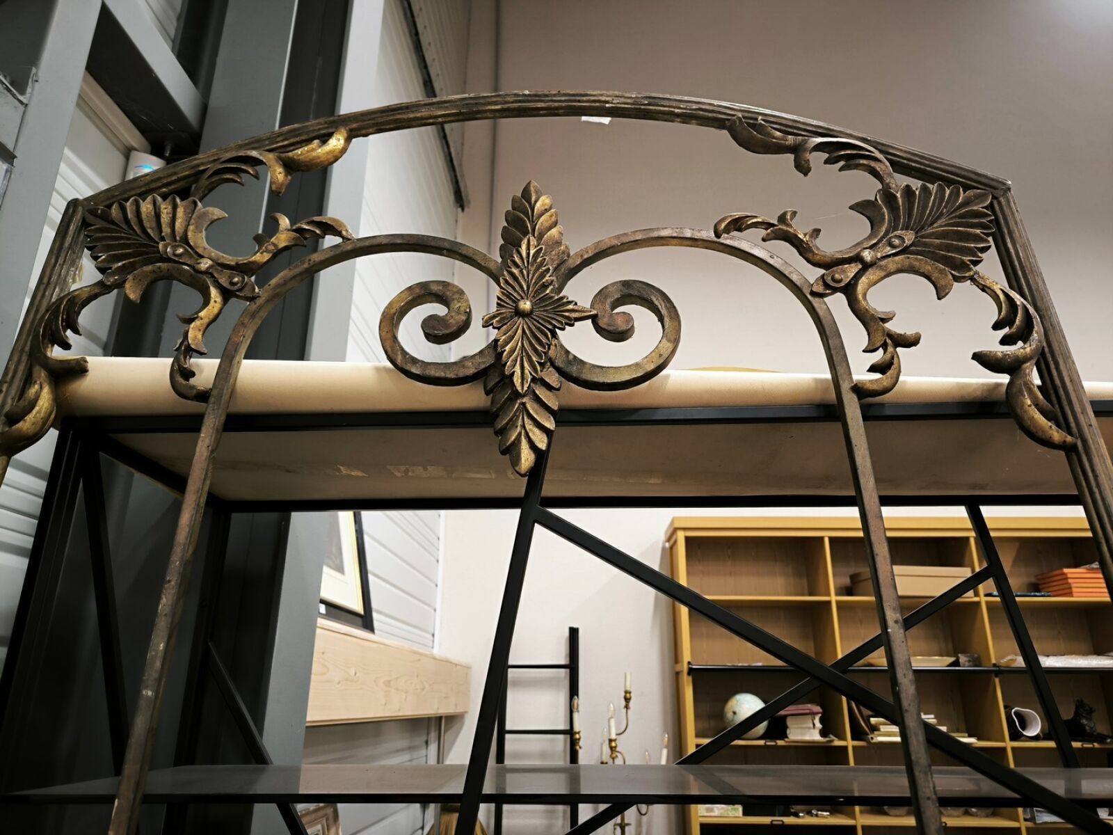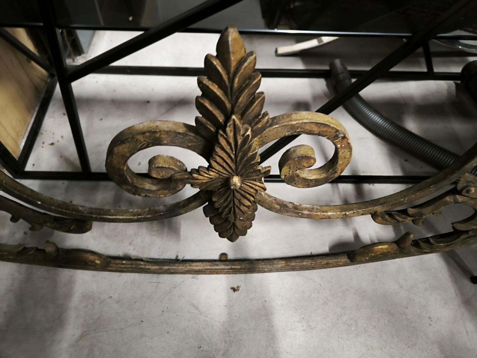 Louis XVI style metal mirror frame and decorative elements in resin with a golden patina.