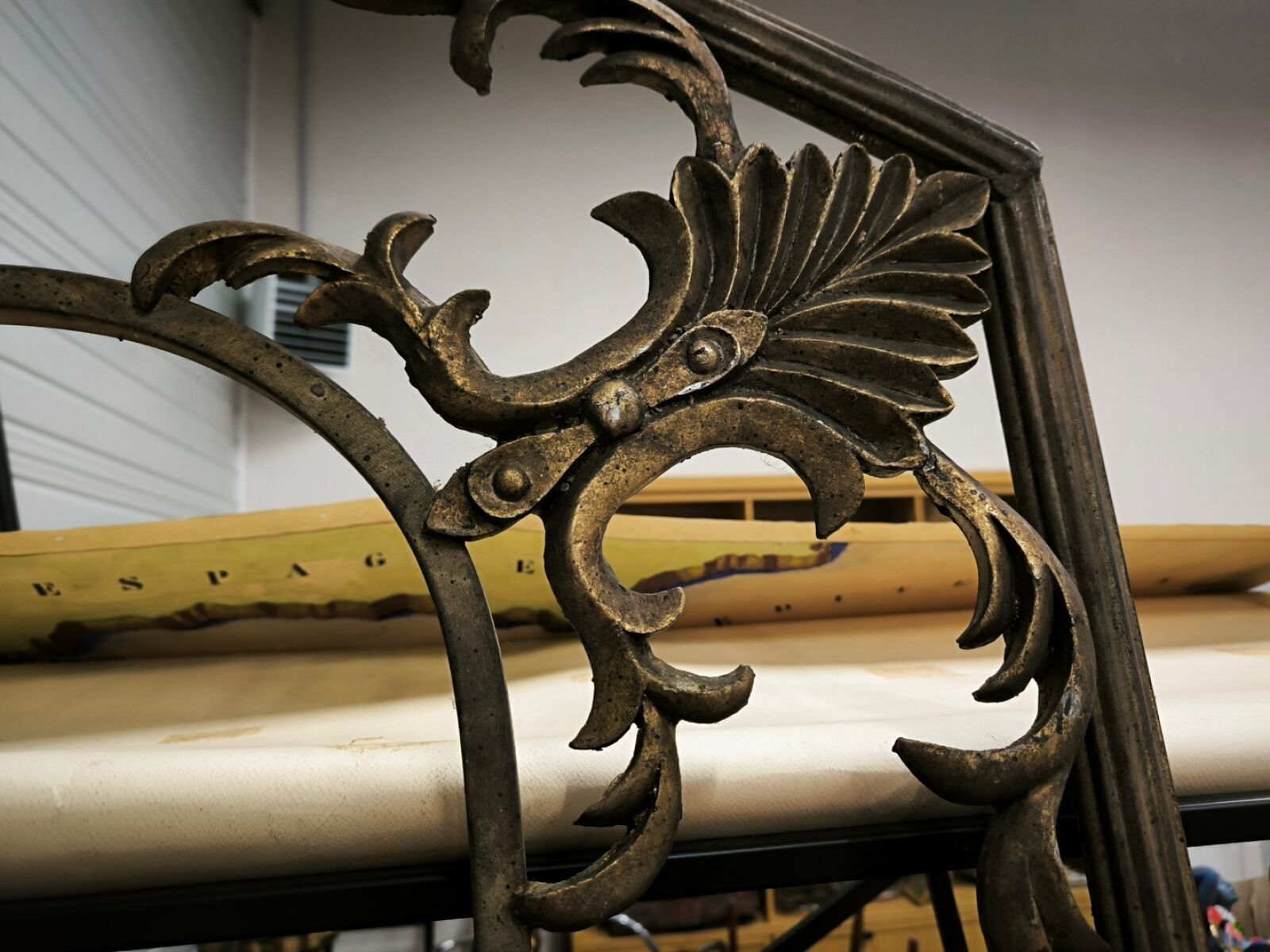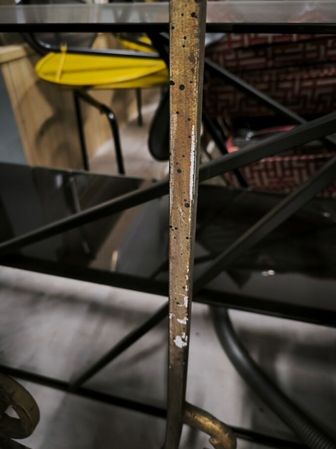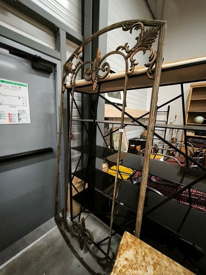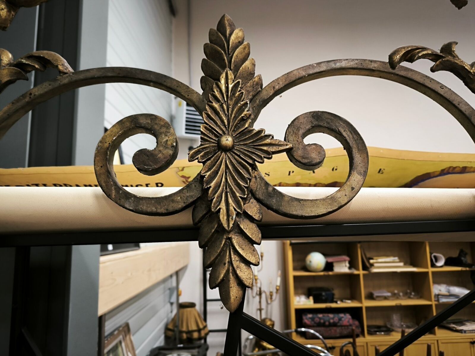 Louis XVI style metal mirror frame and decorative elements in resin with a golden patina.