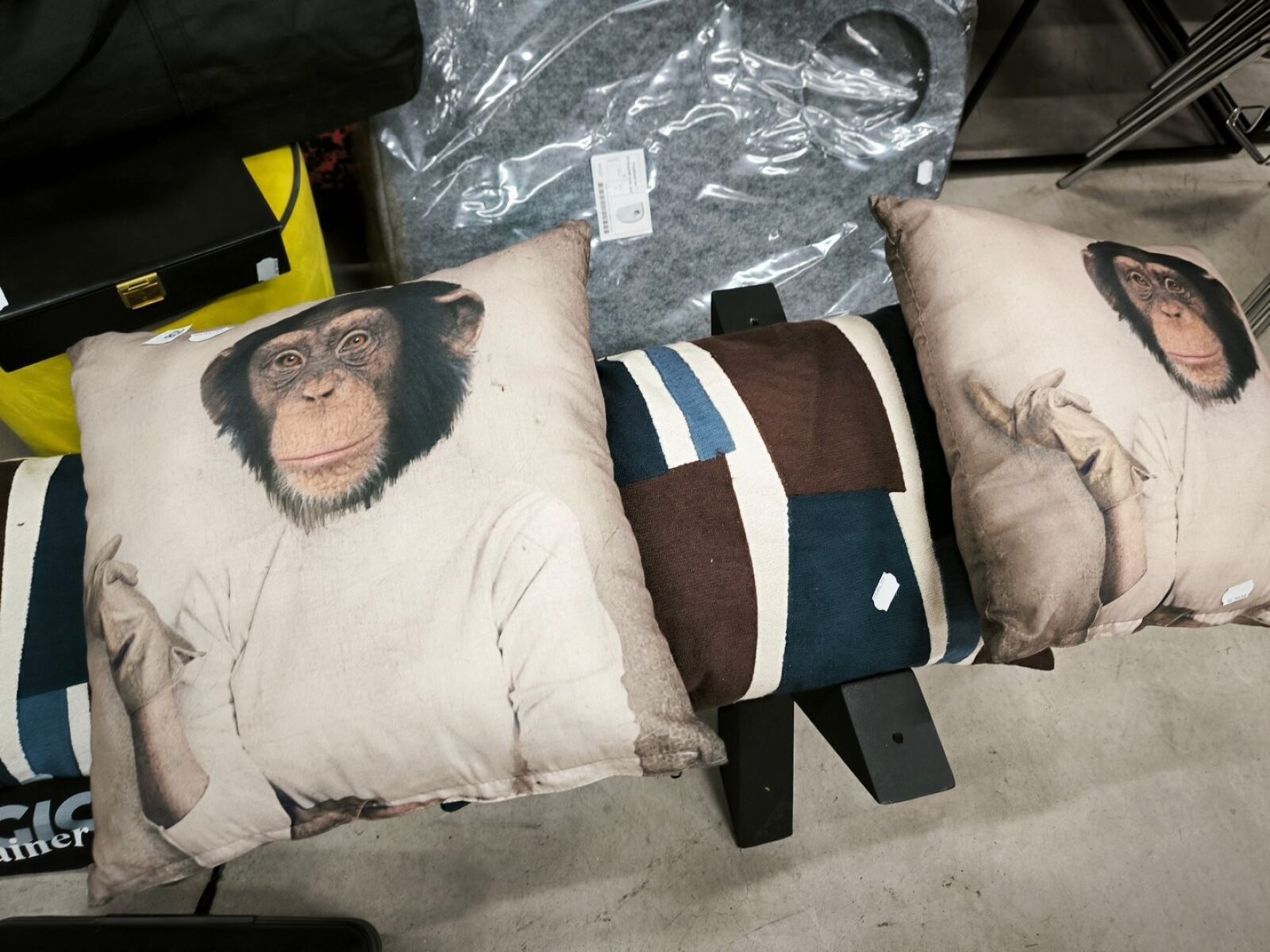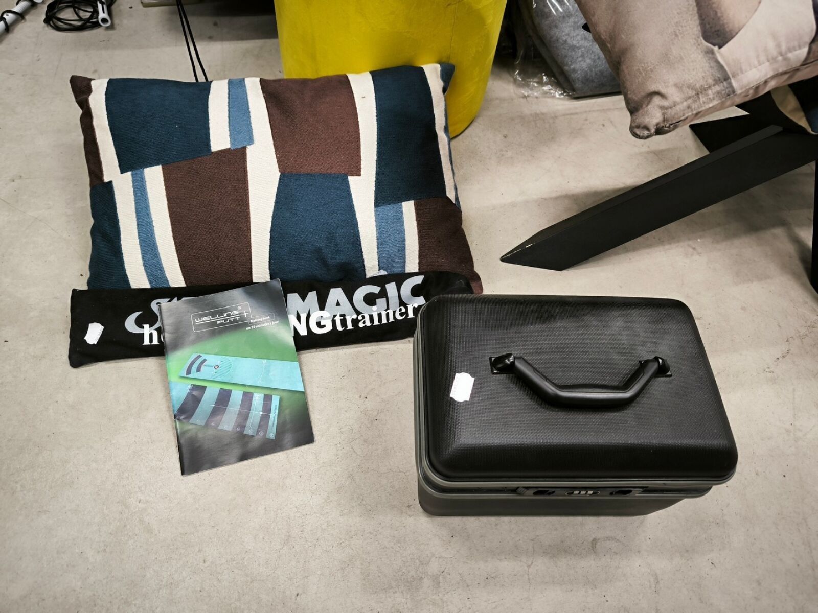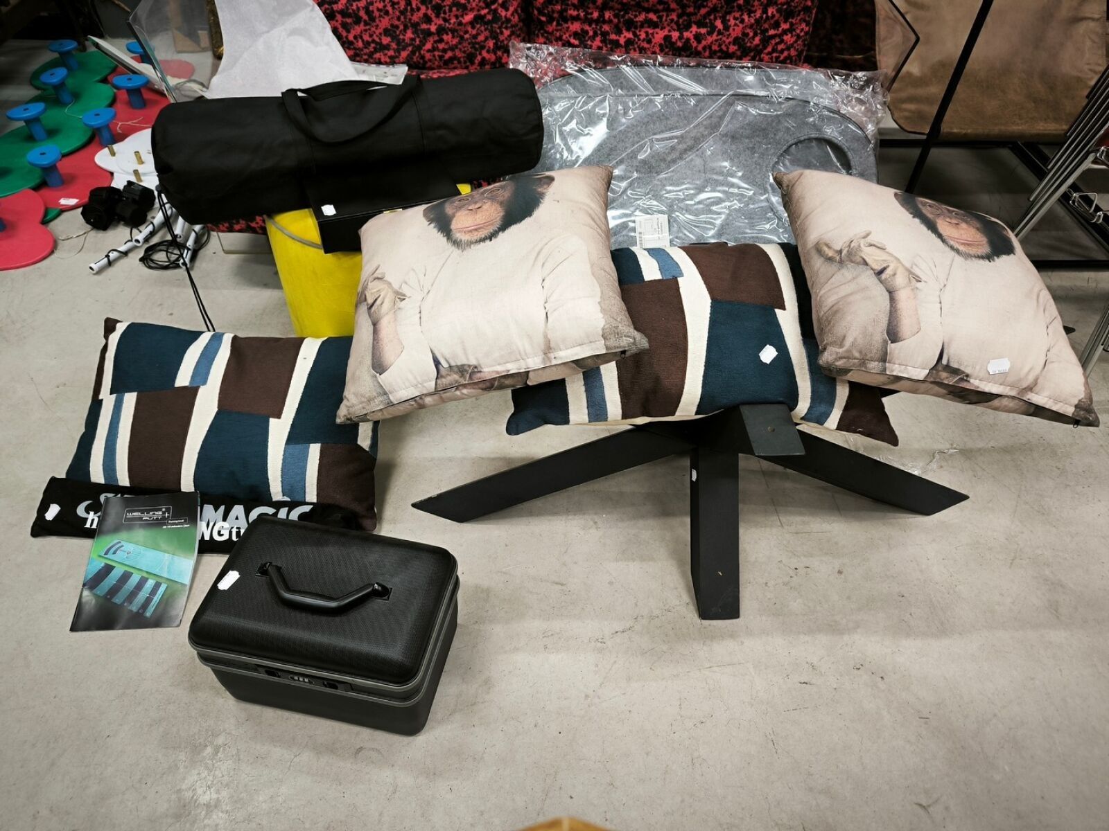 Miscellaneous lot, comprising a footstool, a coffee table base, two Behoma laundry baskets and two pairs of cushions. A sports mat, a vanity case and a small jewellery box are included.