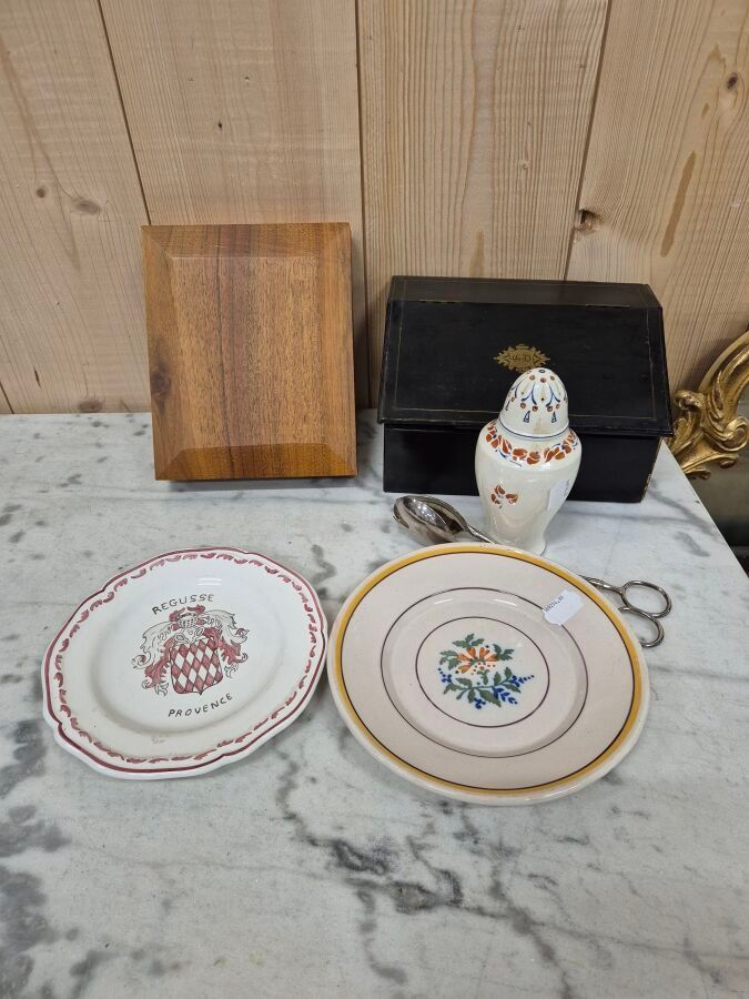 Lot of various trinkets : a blackened wooden box with brass fillets (accidents and missing pieces), 2 earthenware decorative plates, an earthenware sugar bowl, silver plated serving tongs and a wooden box.