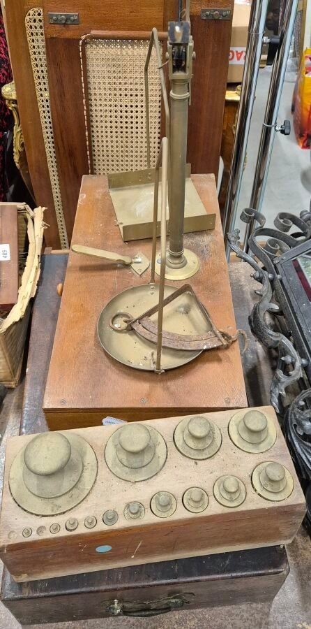 Set of two scales, comprising a beam scale and a column scale. Various weights attached.