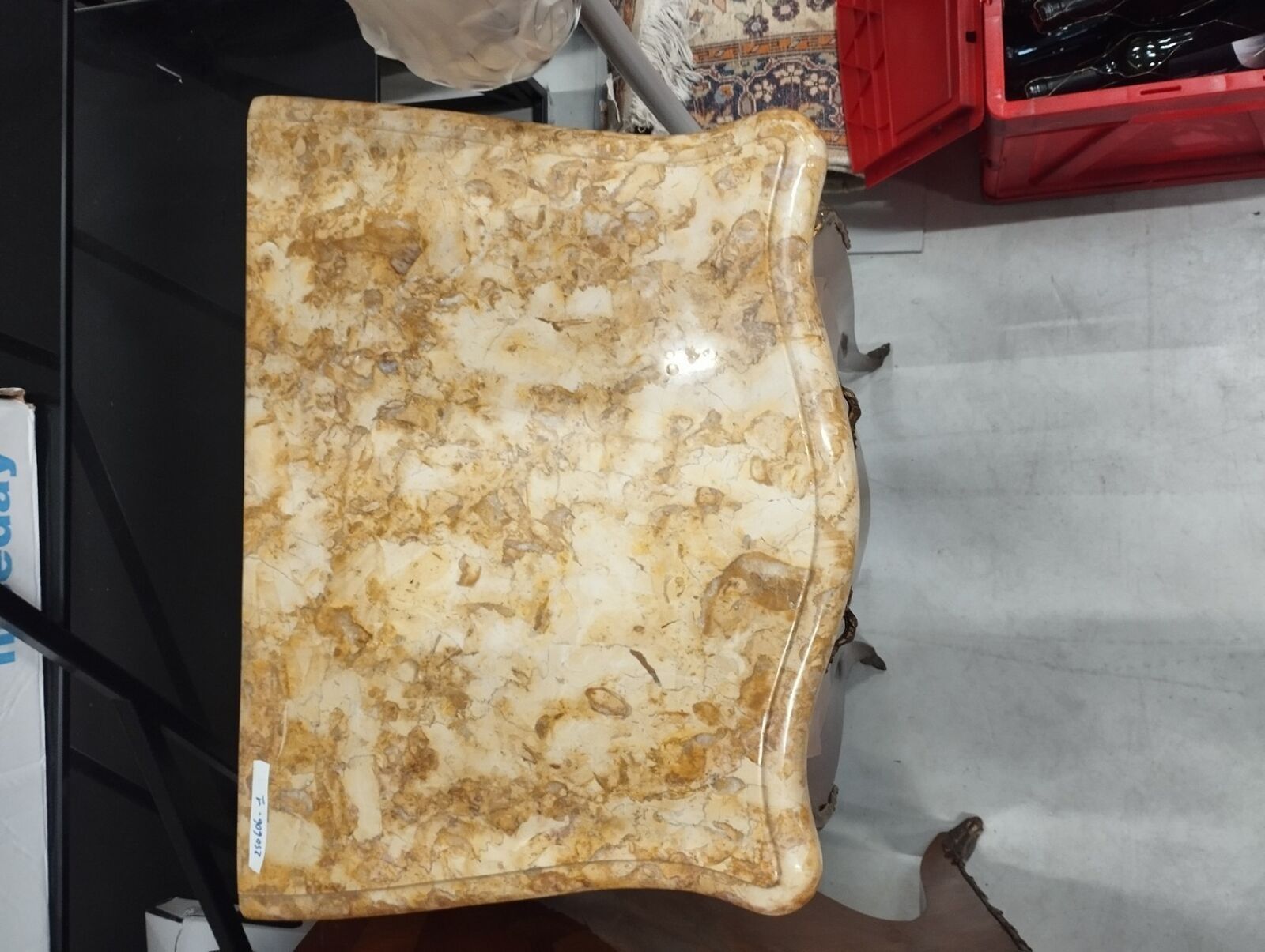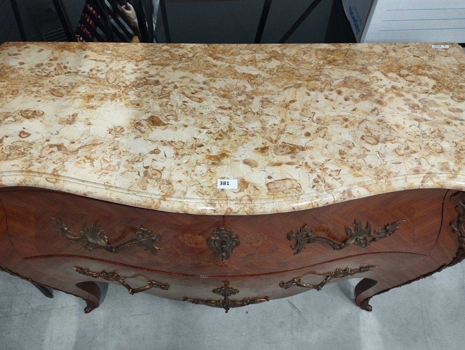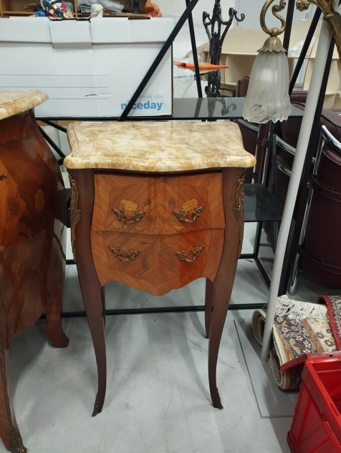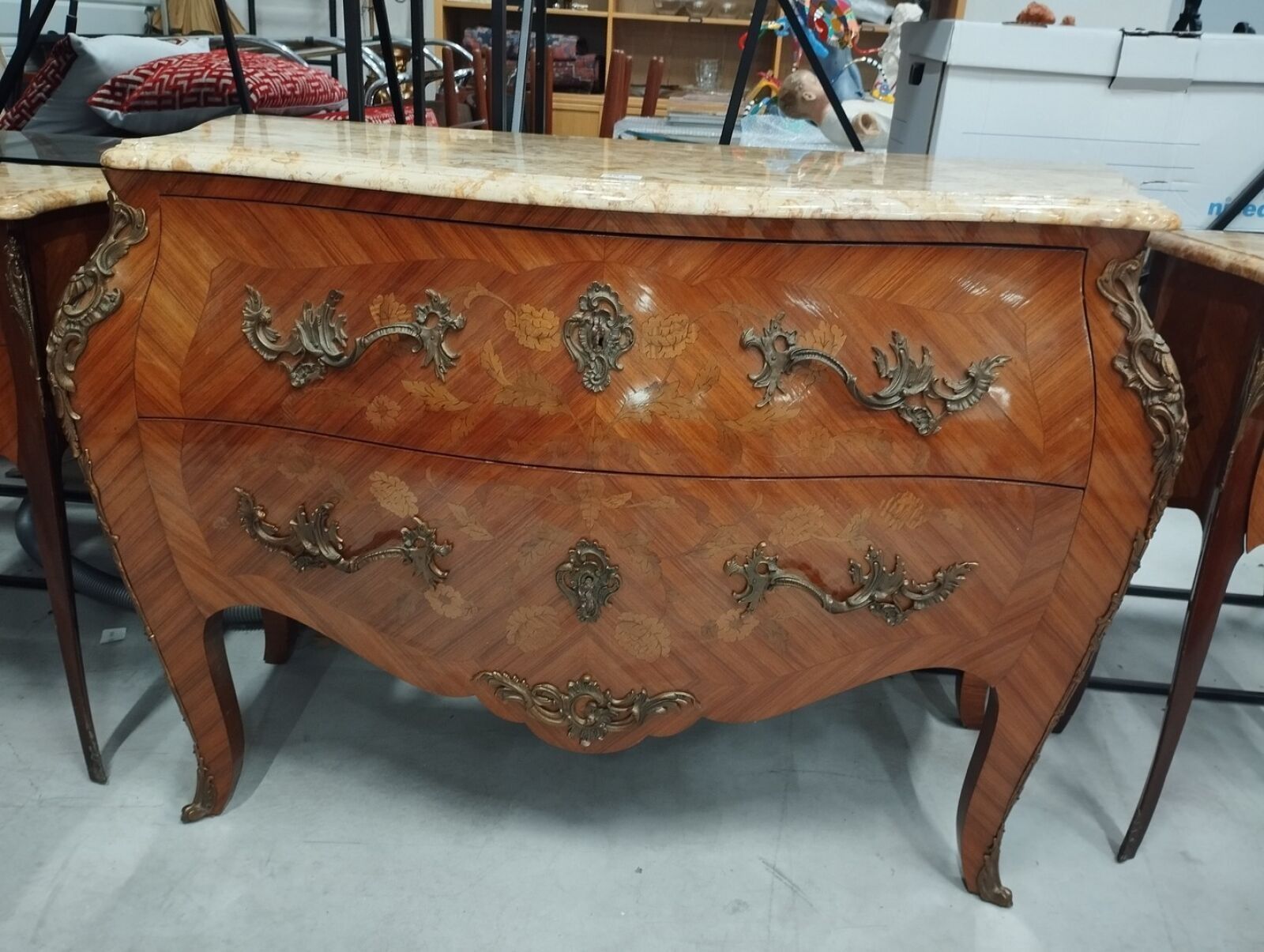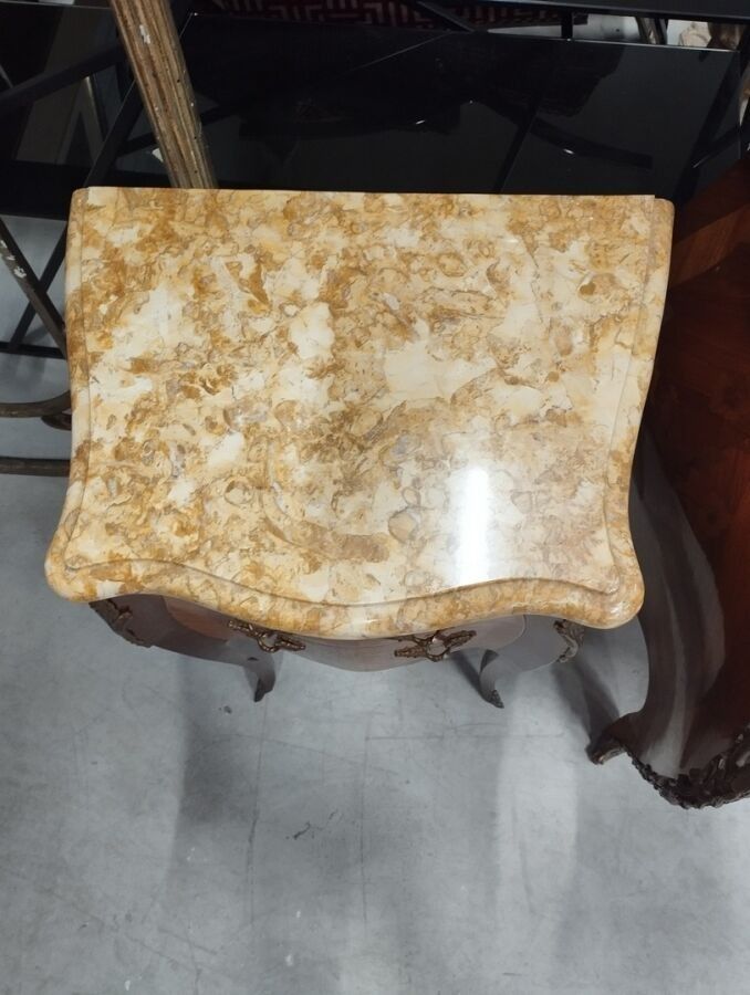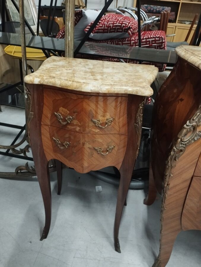Louis XV style set comprising a curved chest of drawers with marquetry decoration of flowers, marble top. A pair of bedside tables.