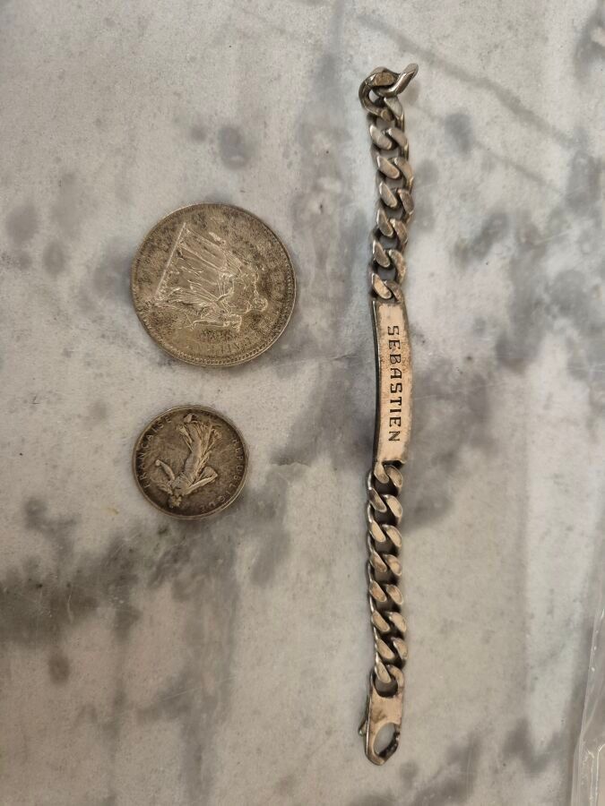 Silver lot composed of a 5FF Semeuse 1960 + a 50FF Hercule 1975 and a chain bracelet marked "Sébastien".