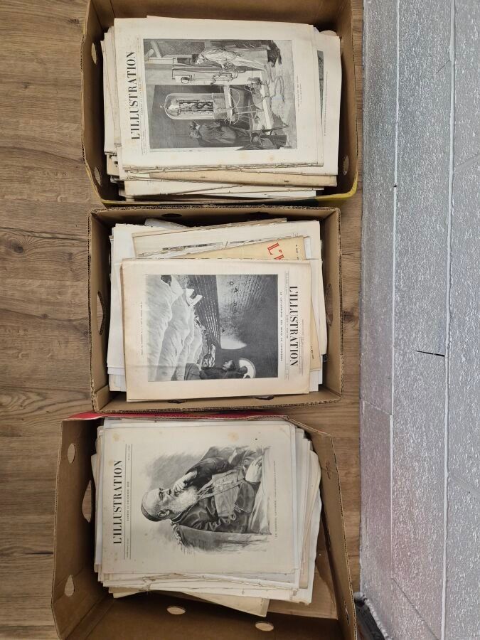 Three boxes containing numerous old l'Illustration magazines