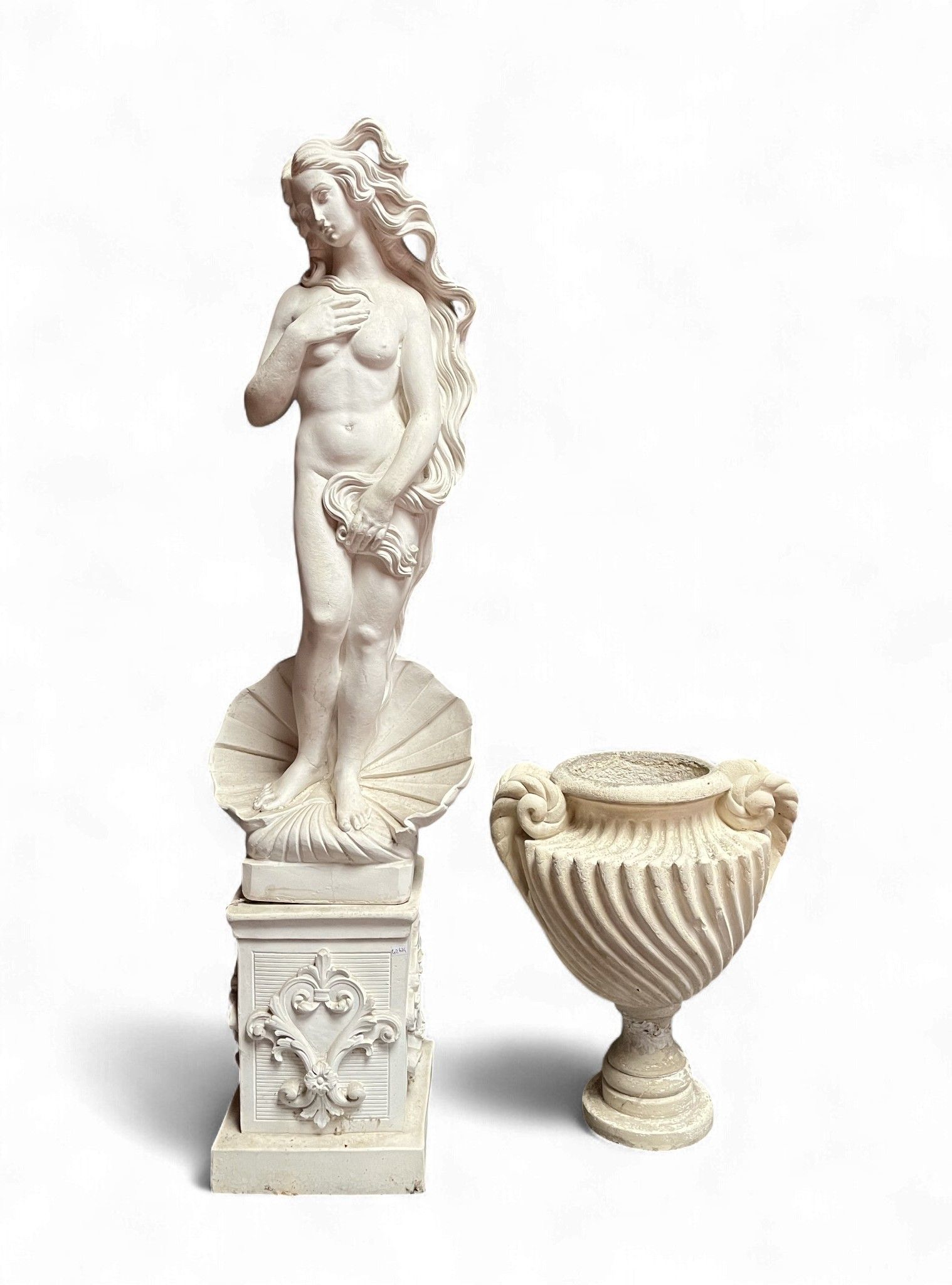 VENUS resting on a quadrangular base (total height 120 cm) and MEDICIS VASE with twisted gadroons in reconstituted stone (minor accidents).