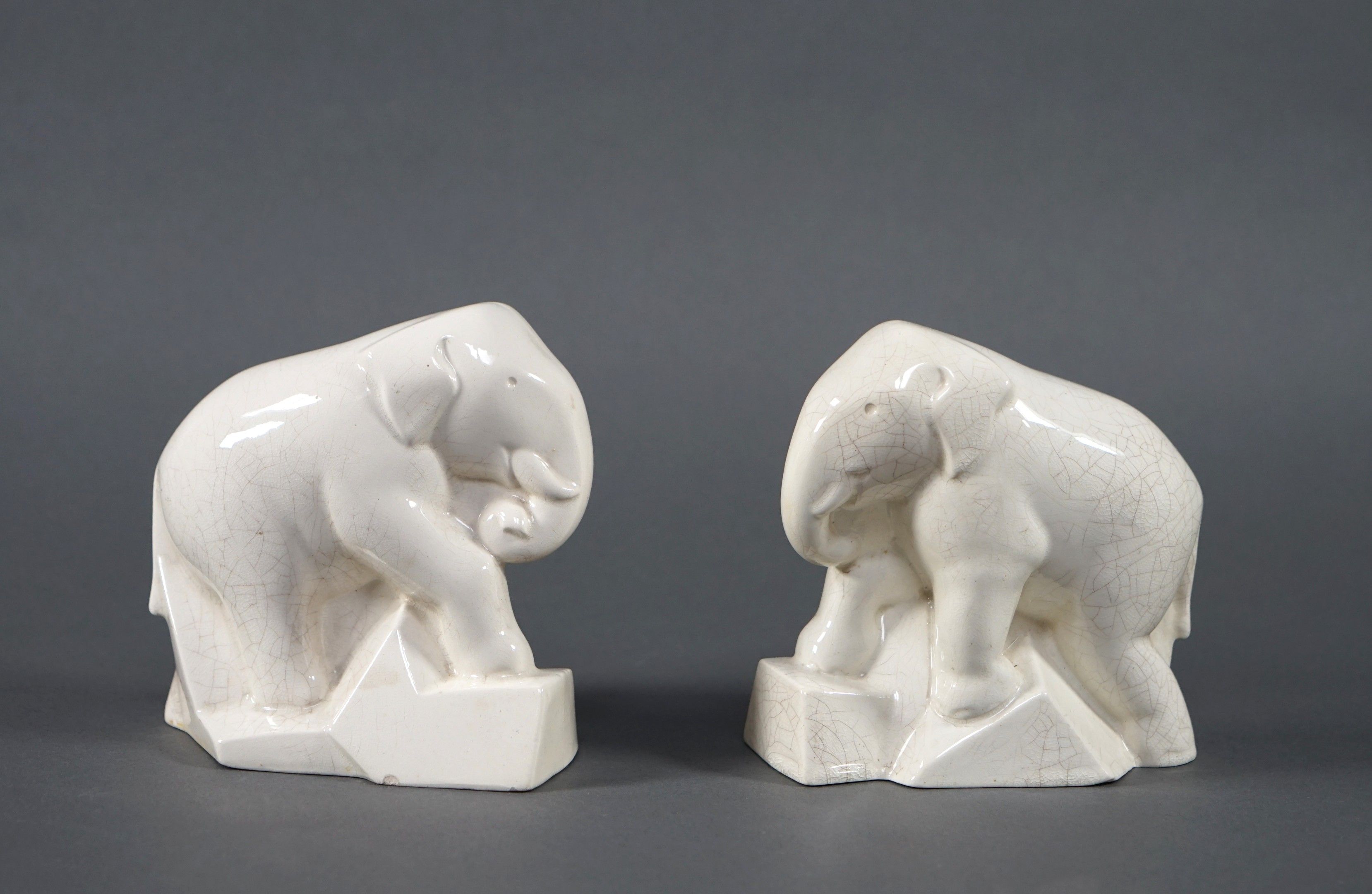 SAINTE RADEGONDE pair of Art Deco elephant bookends in white cracked earthenware H. 16 cm (small chip on the base).
