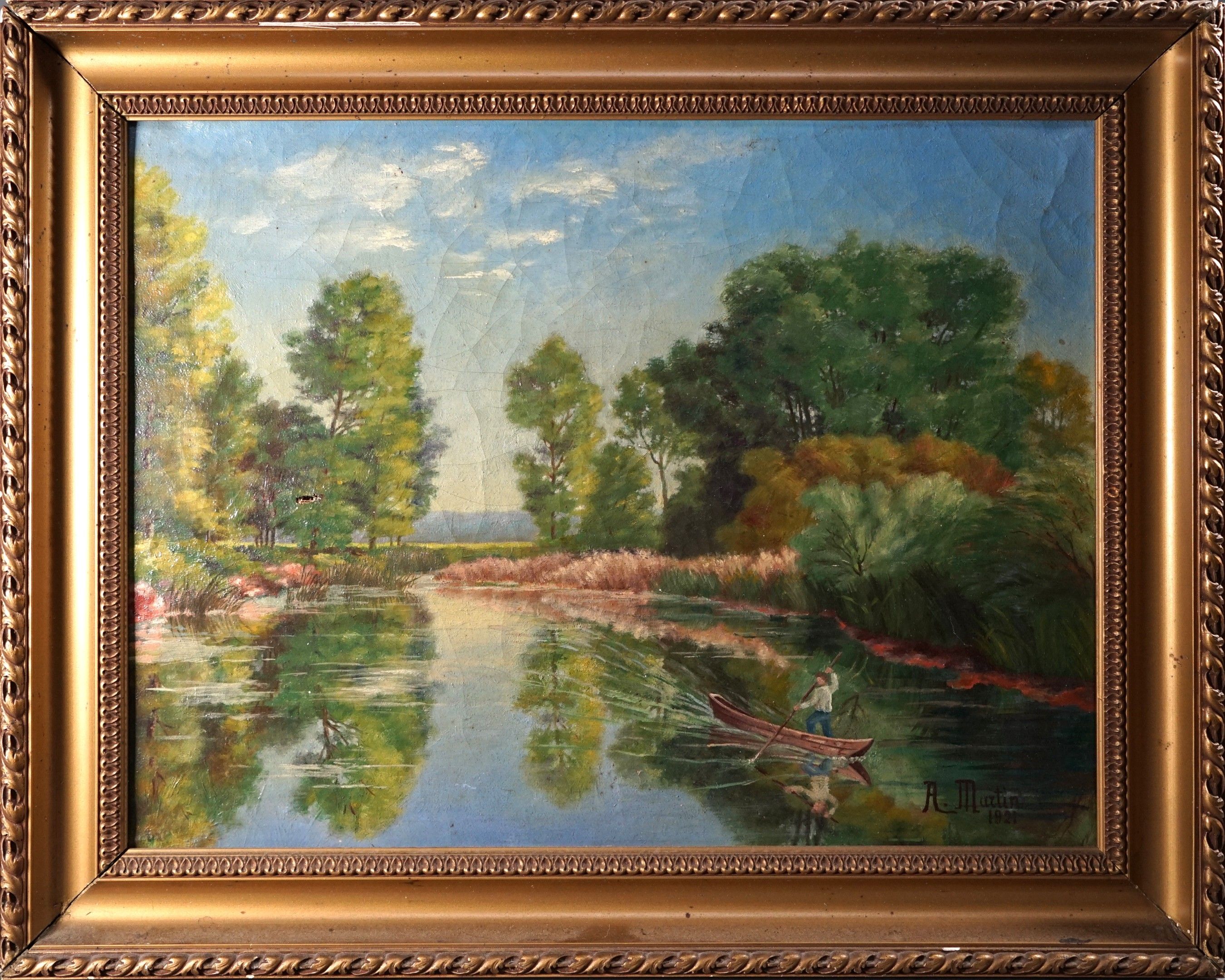 A. MARTIN (XXth) Boat on the pond. Oil on canvas signed and dated 1921 lower right. 35 x 46 cm (accident).