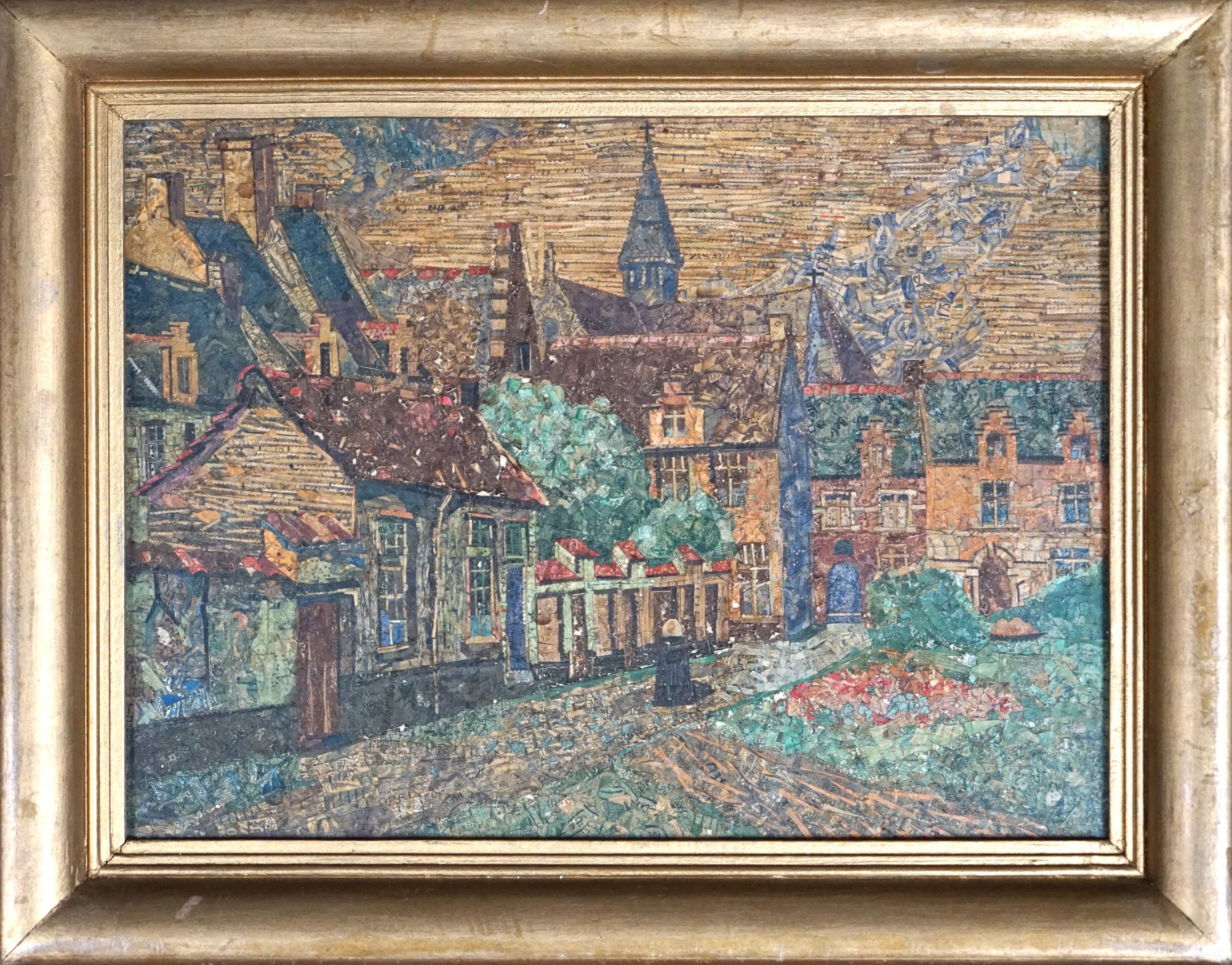 ART BRUT village au passant. Composition of postage stamps cut out and pasted on cardboard. 26 x 35 cm.