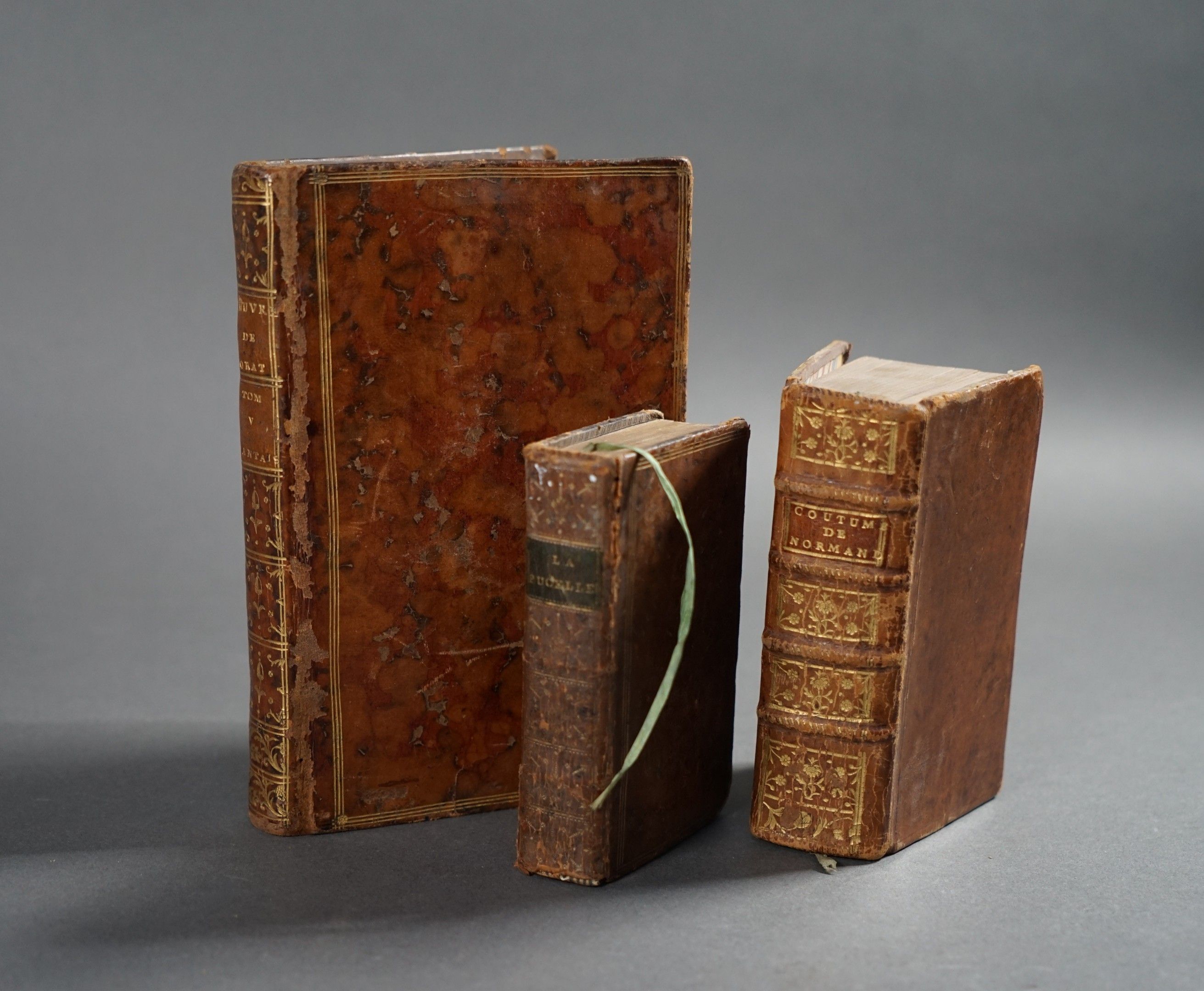 Three BOOKS including Morza, La pucelle d'Orléans, Poem, London, 1779 Coutumes du pays et duché de Normandie, Oursel à Rouen, 1773 Dora, Mes fantaisies, Amsterdam 1768 tome 5.
