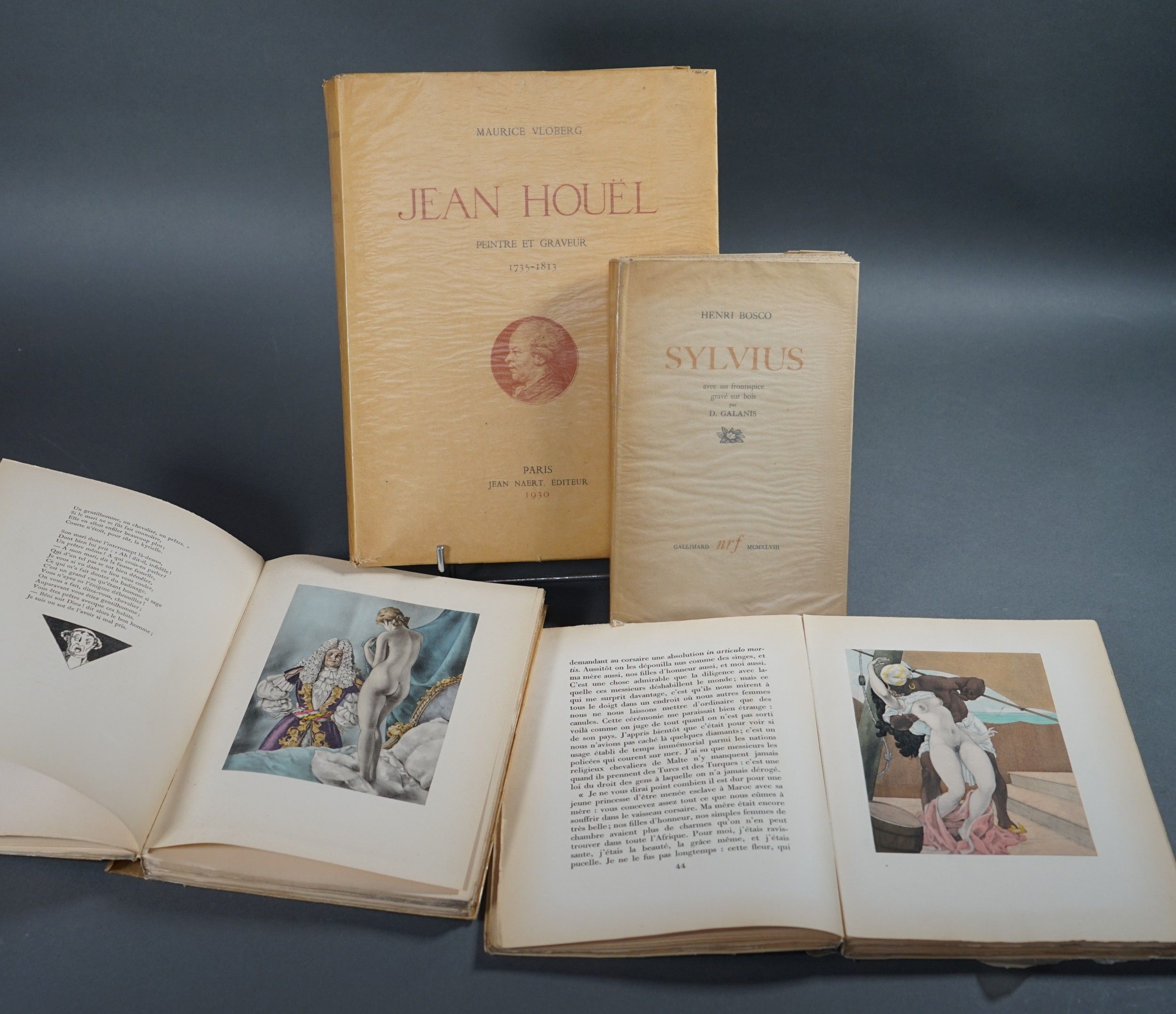 Four BOOKS including La Fontaine and Candide illustrated by Brunelleschi and numbered, Sylvius by Henir Bosco illustrated by Galanis and Jean Houël by Vloberg, Jean Naert éditeur, Paris, 1930, numbered.