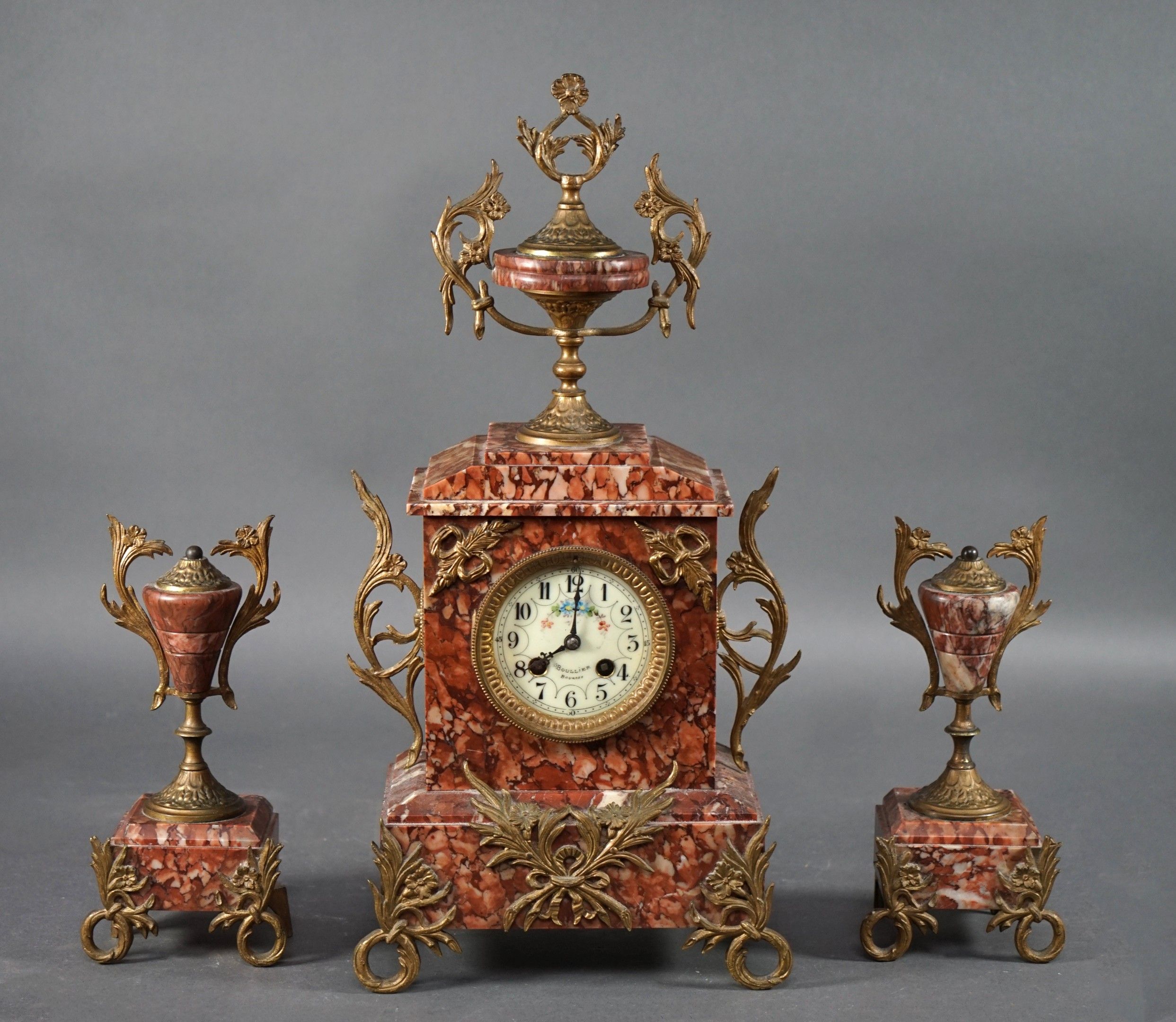 BOULLIER in Bourges Red marble and bronze mantelpiece including a clock with a round enamelled dial and two cassolettes. Height 52 cm.
