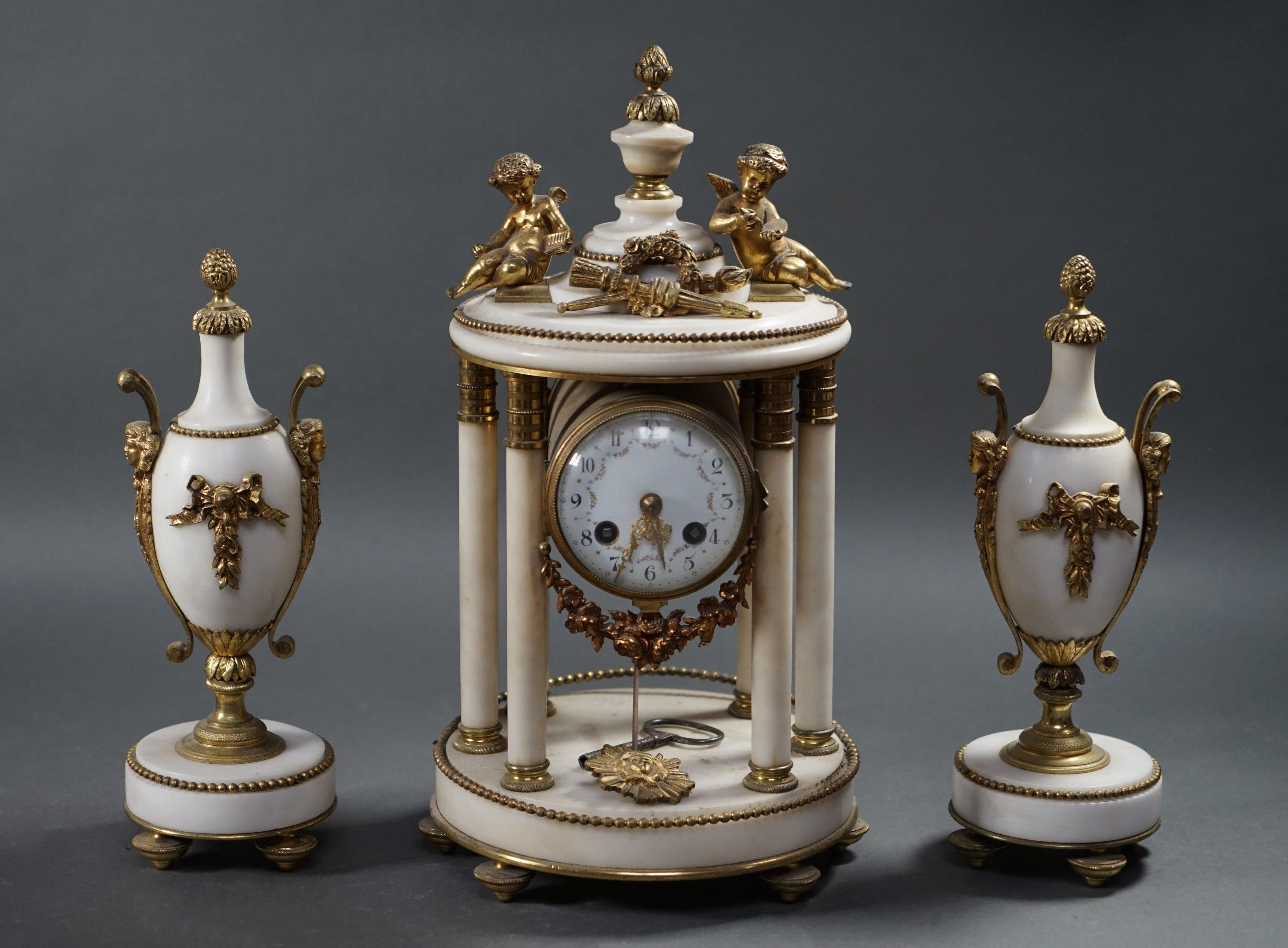 Louis XVI style alabaster and bronze mantelpiece decorated with cherubs, including a clock and two ornamental vases. Height 36 cm.