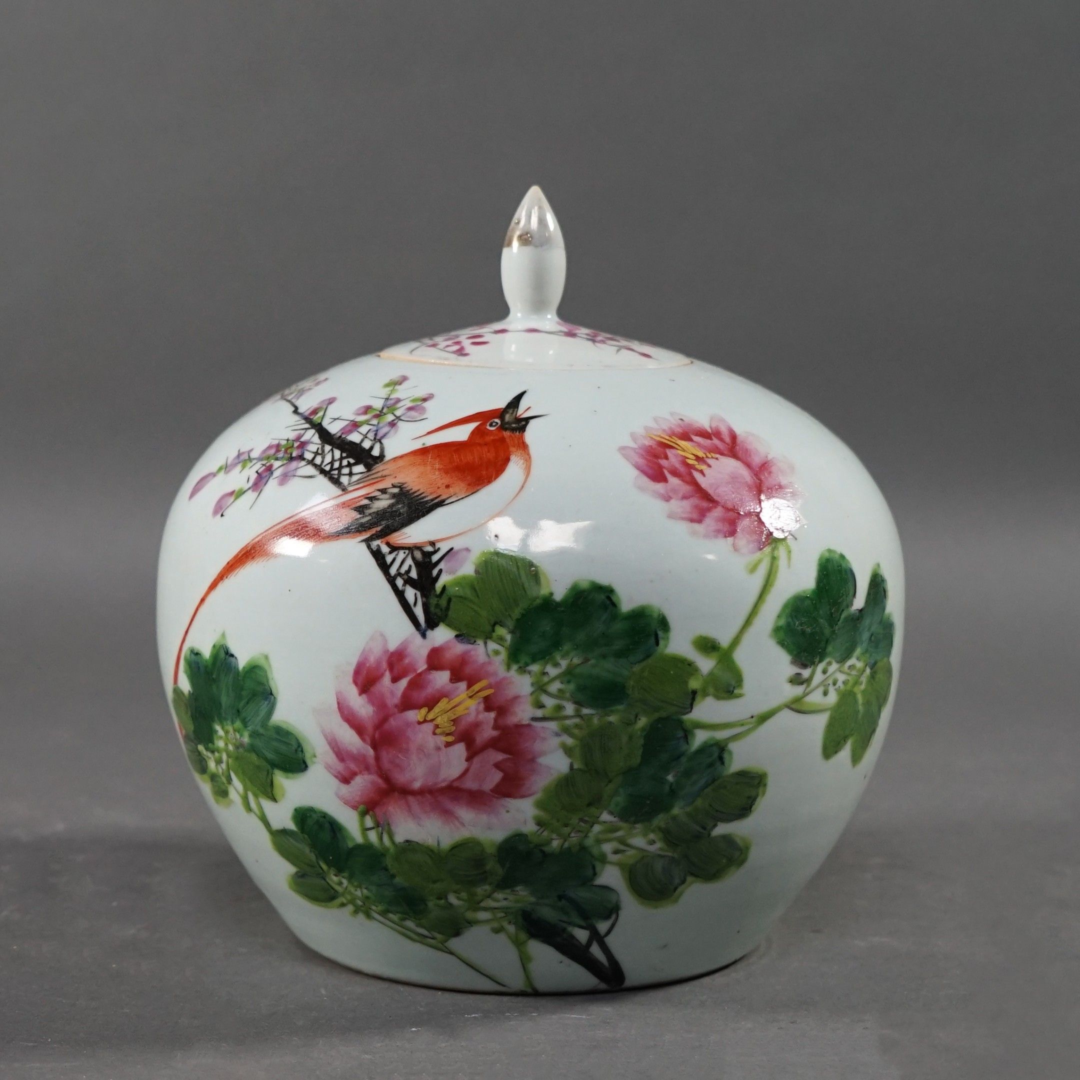 CHINA. A gimgembre pot in polychrome and gilt enamelled porcelain with a calligraphic design of branching birds. Height 17 cm. Small chip to the lid and wear to the gilding.