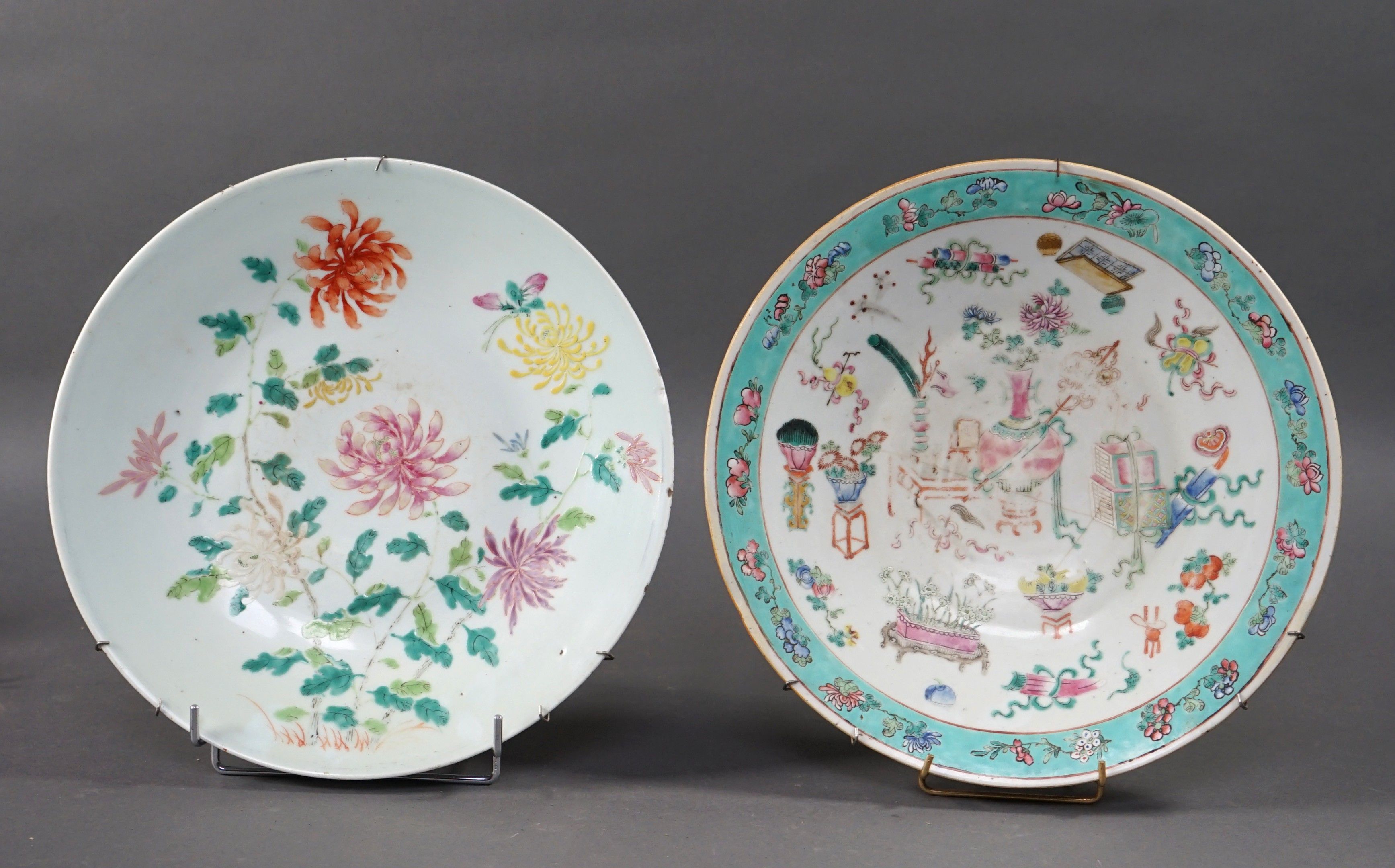 CHINA. Two polychrome enamelled porcelain plates, one decorated with peonies, the other with hospitable symbols. Diam. 35 cm. Cracks and chips.