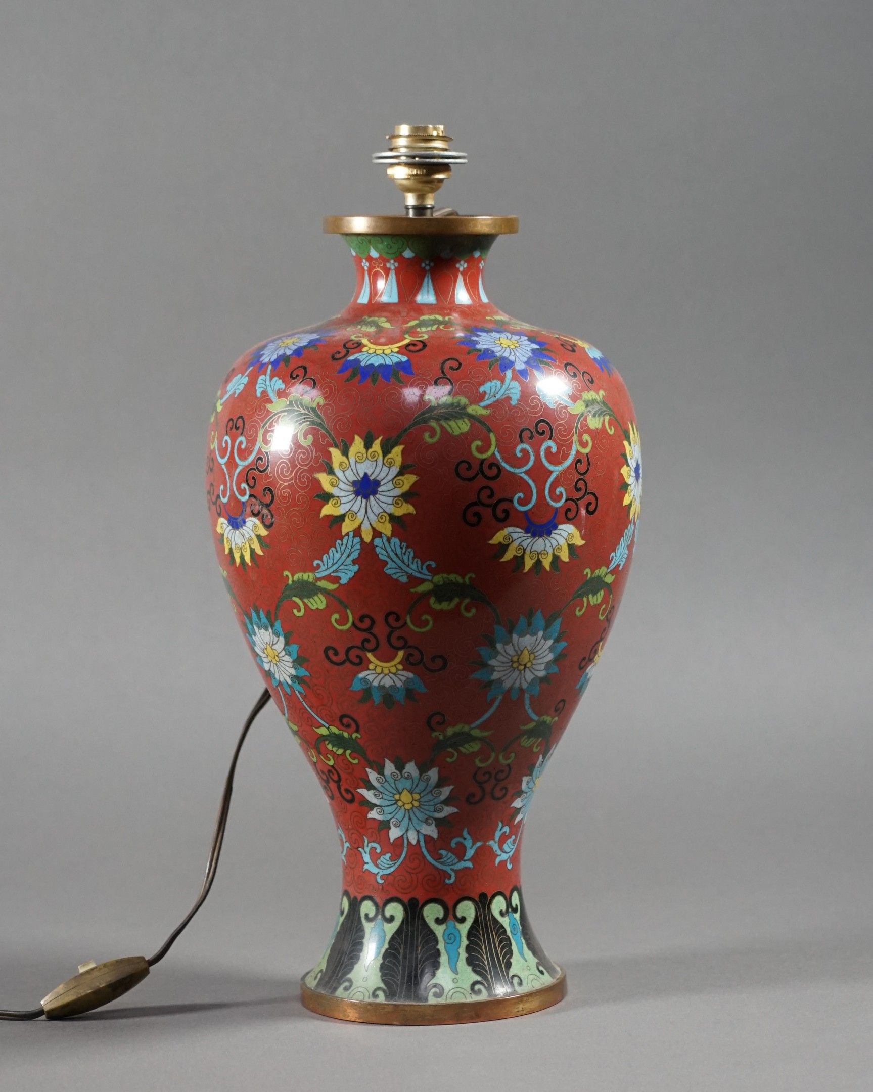 CHINA, Cloisonné vase with garlands of flowers on rusty fields. Drilled for electricity. Late 19th century. Height Height : 42 cm. Indentation.
