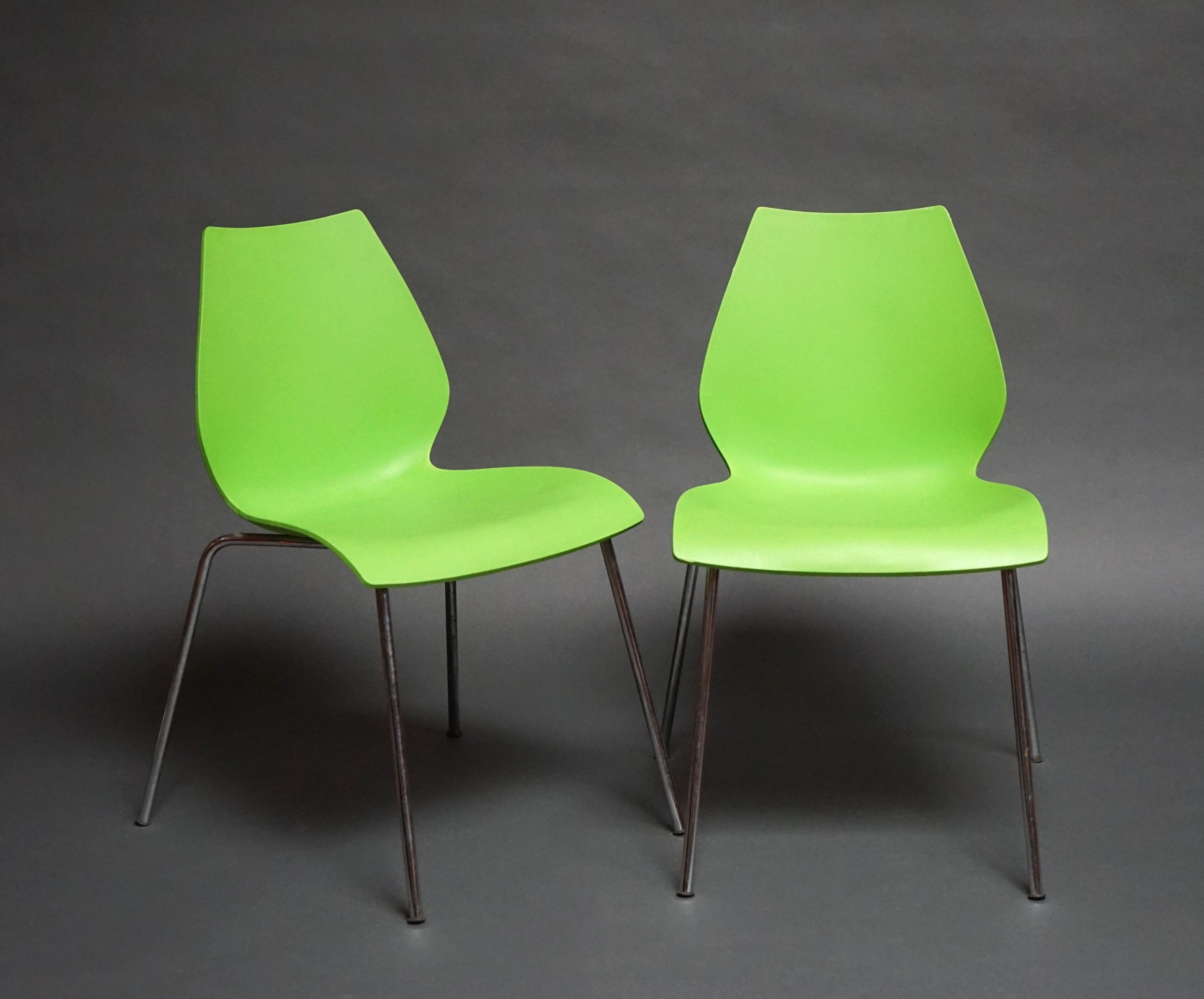 Vico MAGISTRETTI (1920-2006) for KARTELL. Made in Italy. Two 'Maui' model CHAIRS in green polypropylene on chromed metal base. Stamped under the seat with the name of the publisher and designer. Some wear.