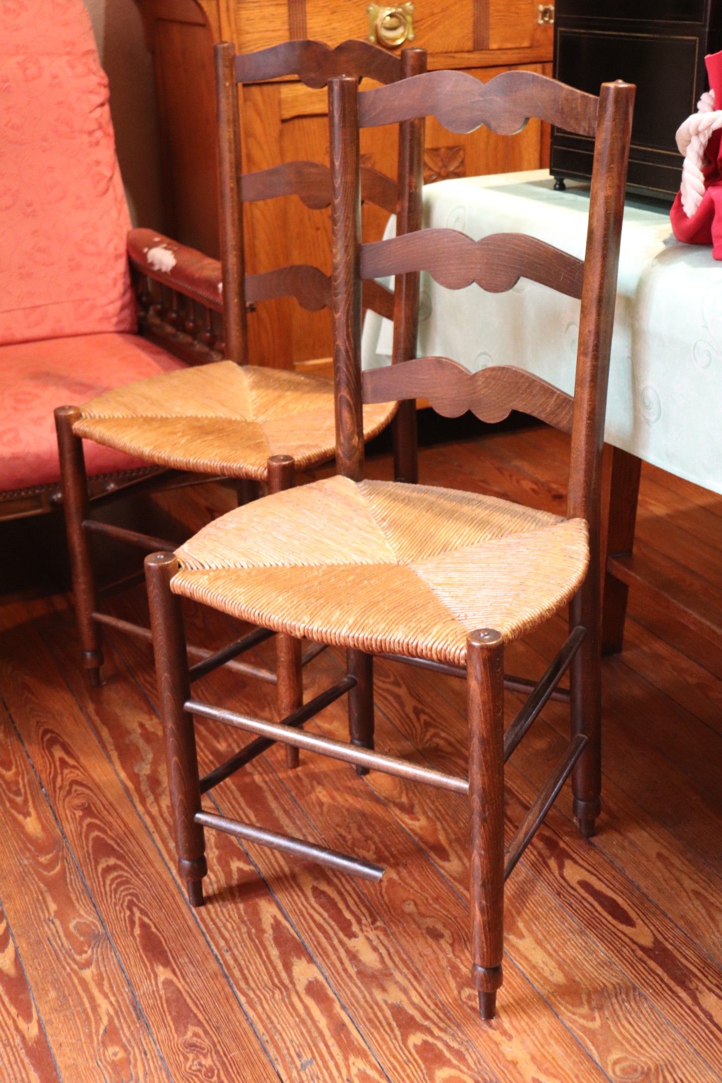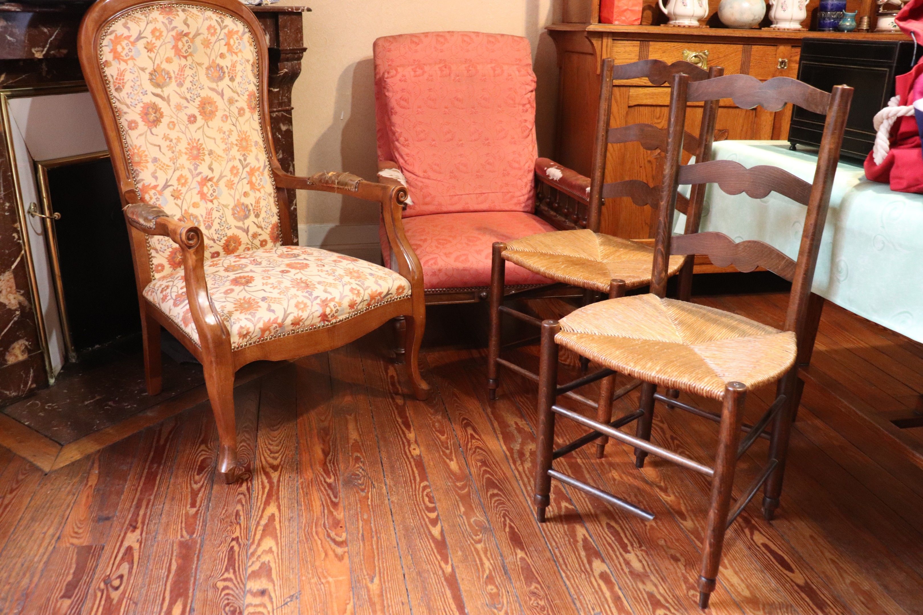 Set of four chairs: an English armchair, a Voltaire armchair and two straw chairs. As is.