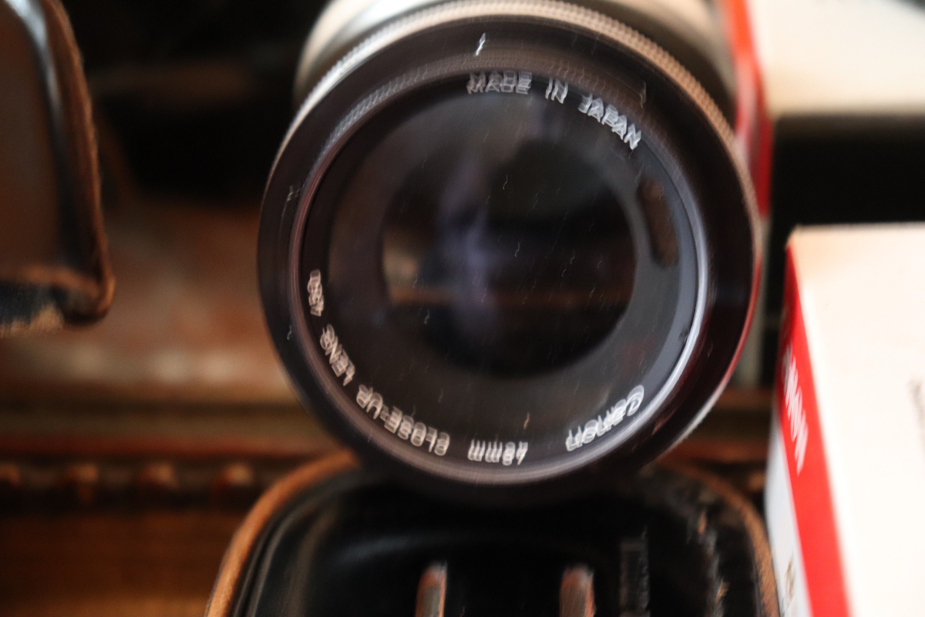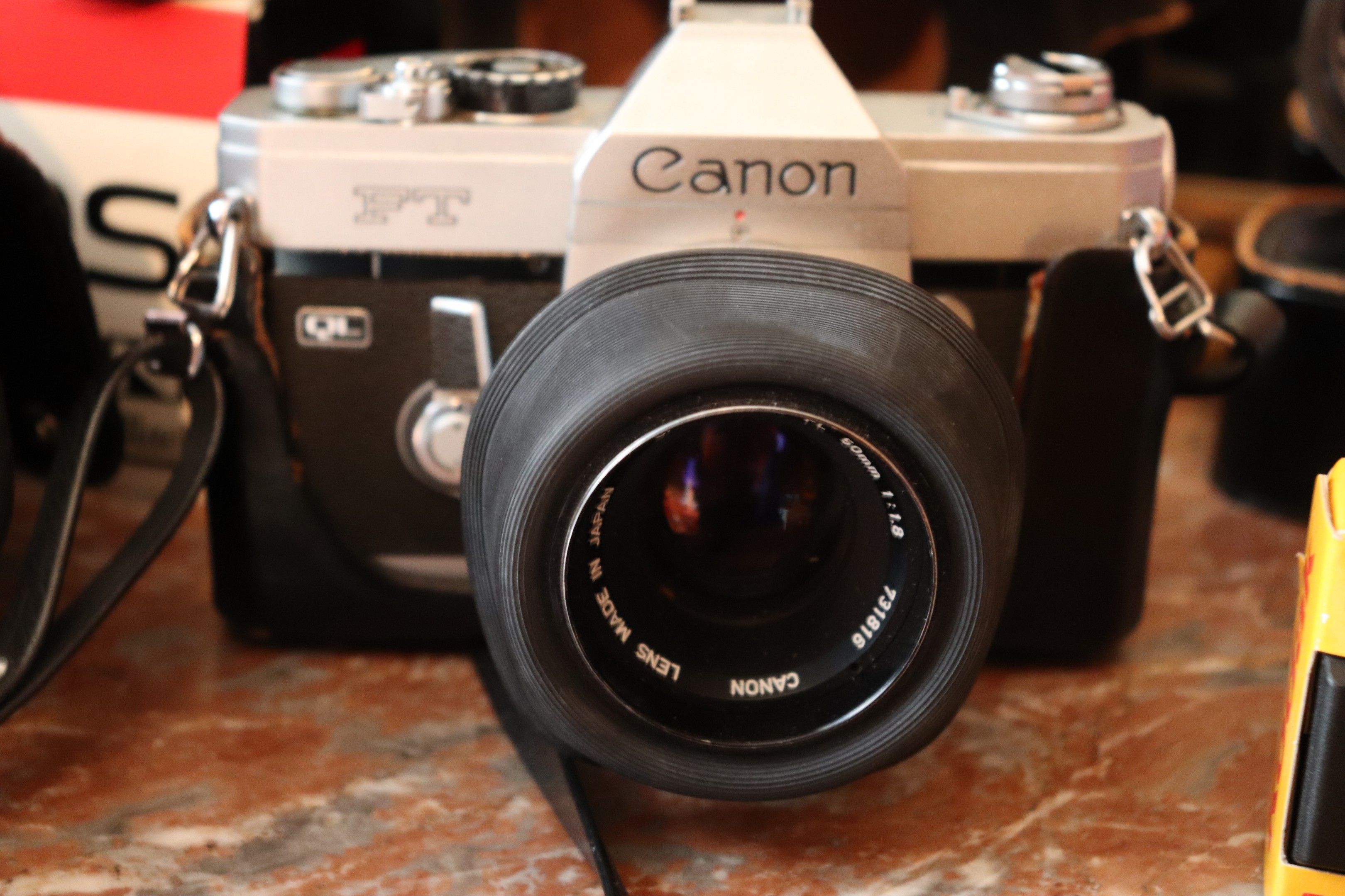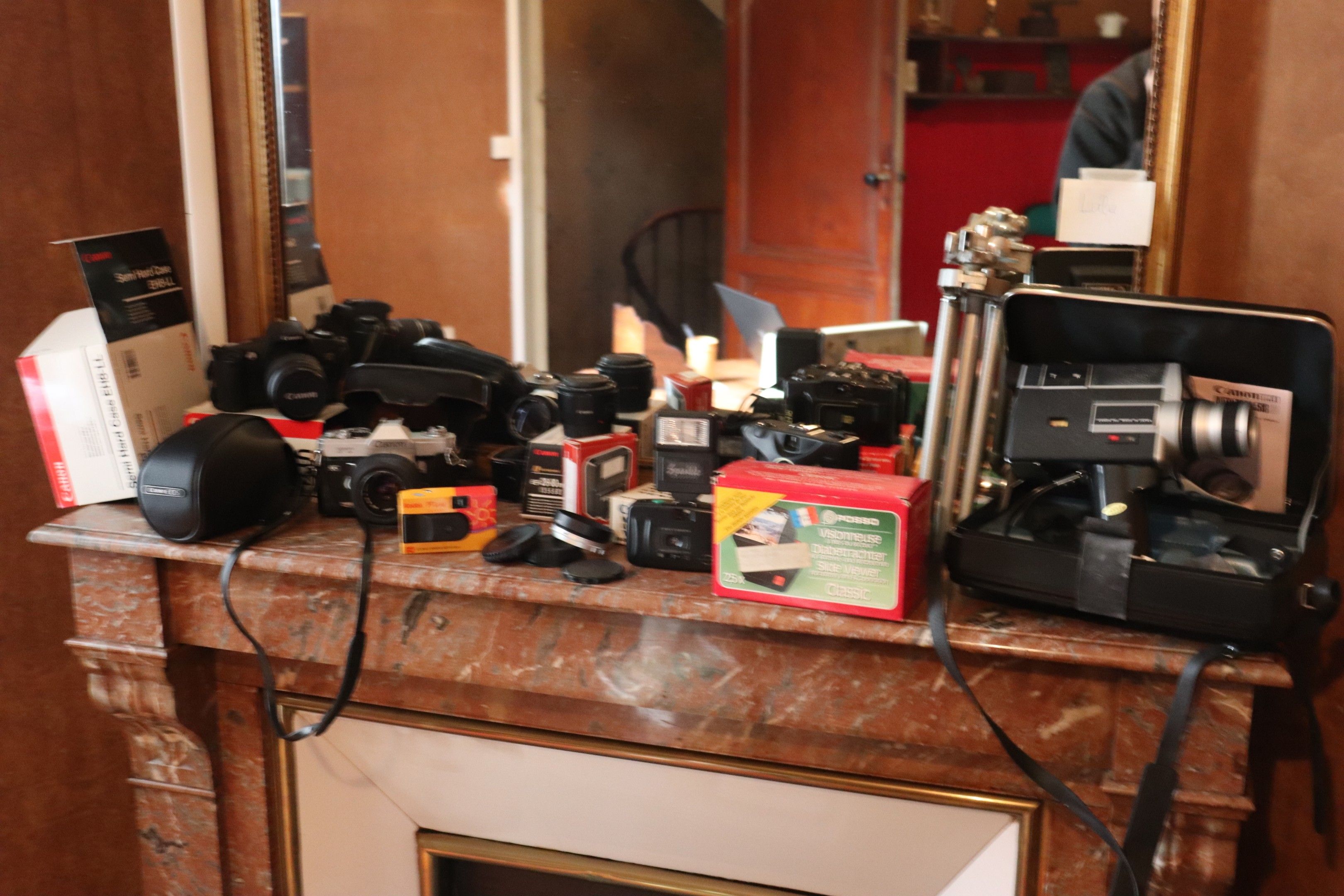 Lot of film cameras and equipment : CANON EOS 500 N, CANON FT, two 35 mm cameras, one 28 mm camera, lot of flash, film lenses, one CANON super 8 camera, one tripod.