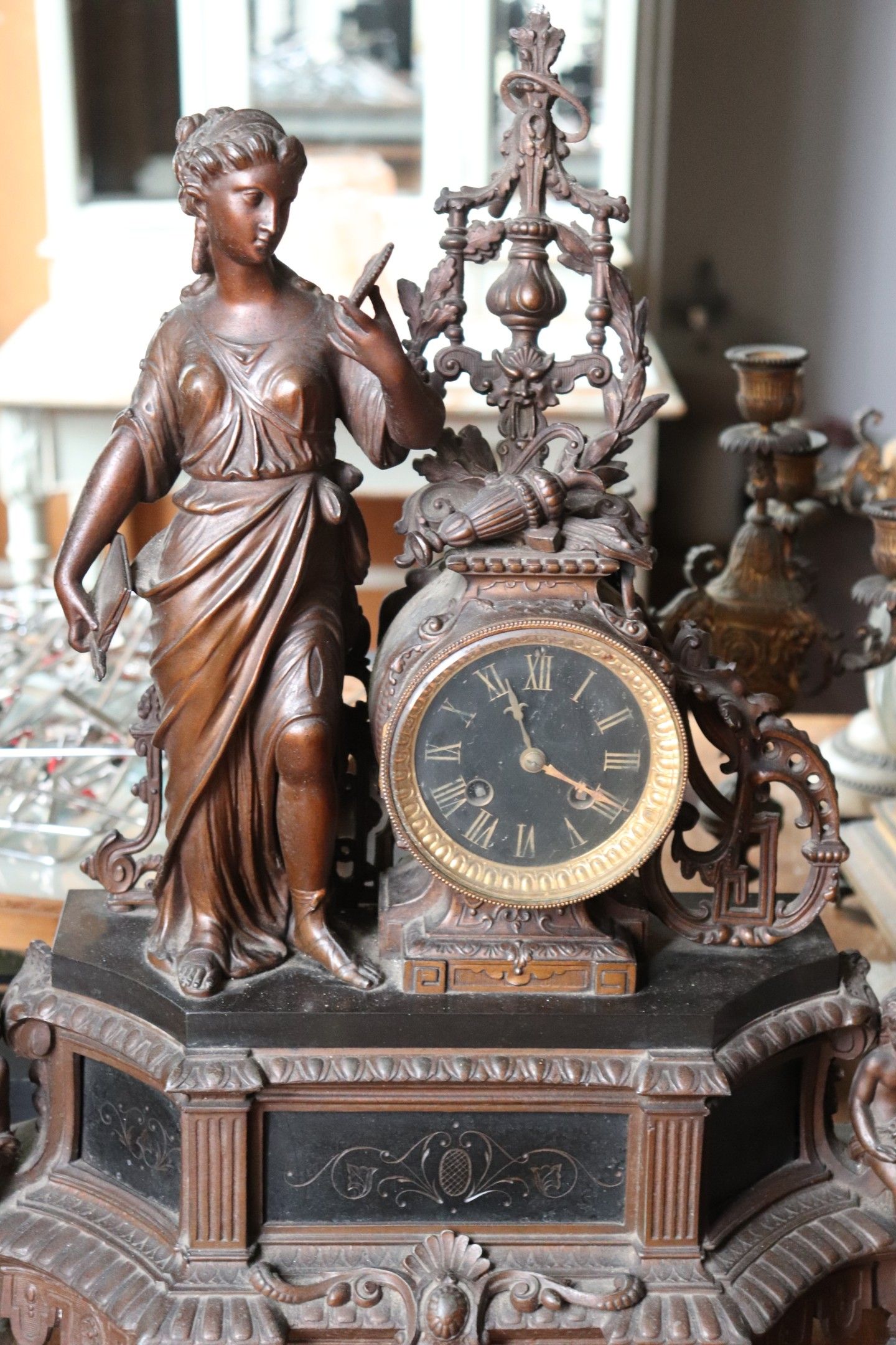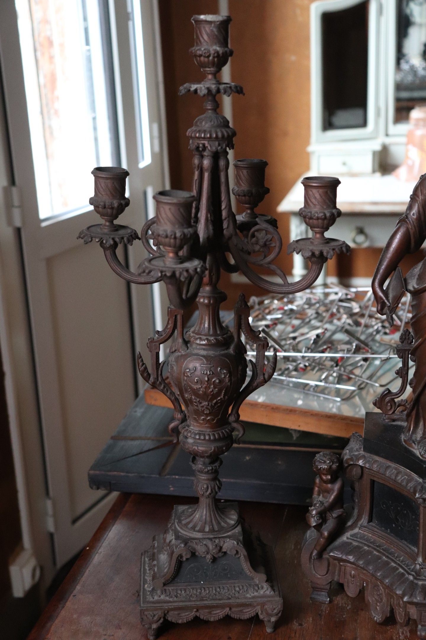 Regule marble mantel set with allegorical decor (54 cm high) and pair of 5-light candelabra (58 cm high)