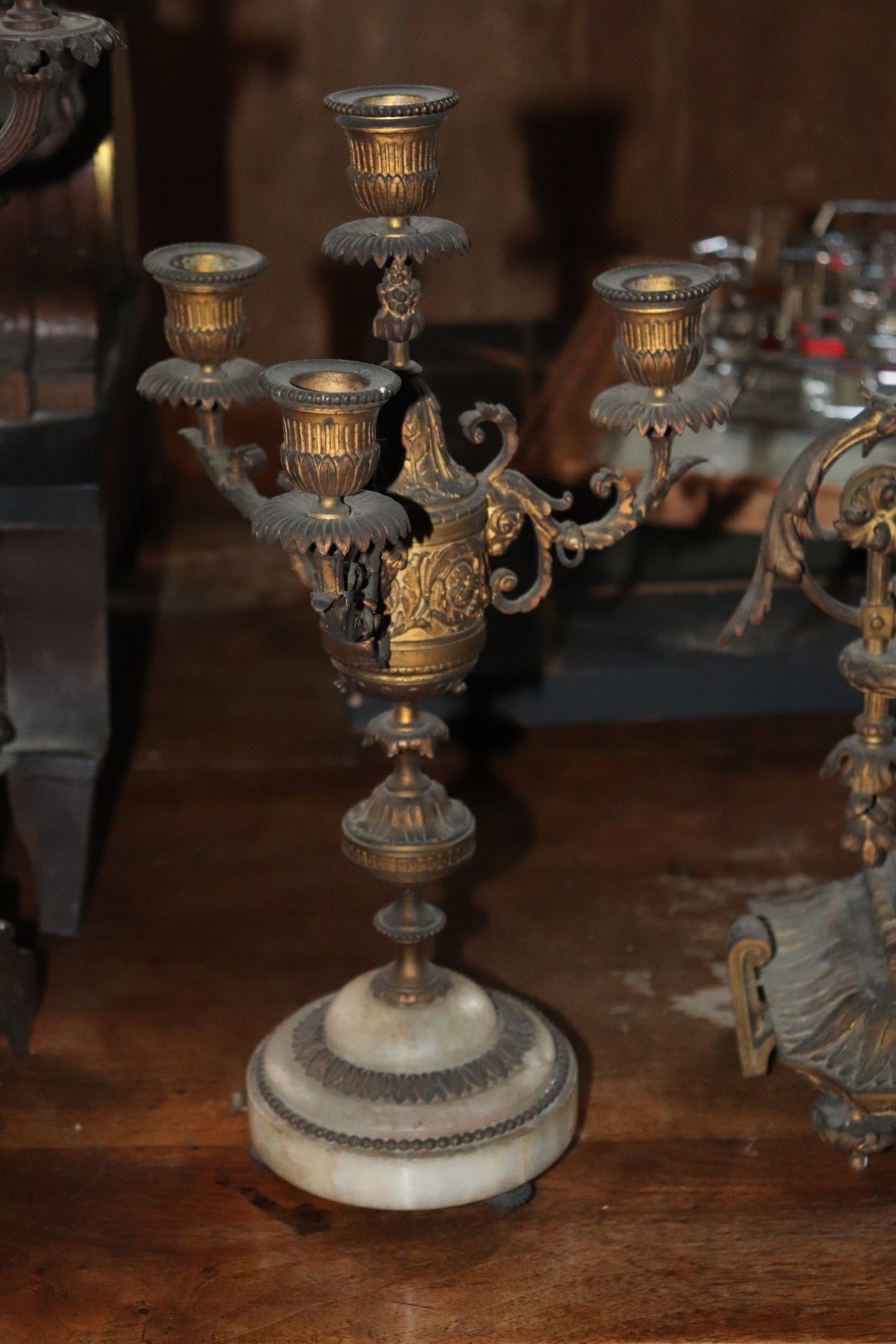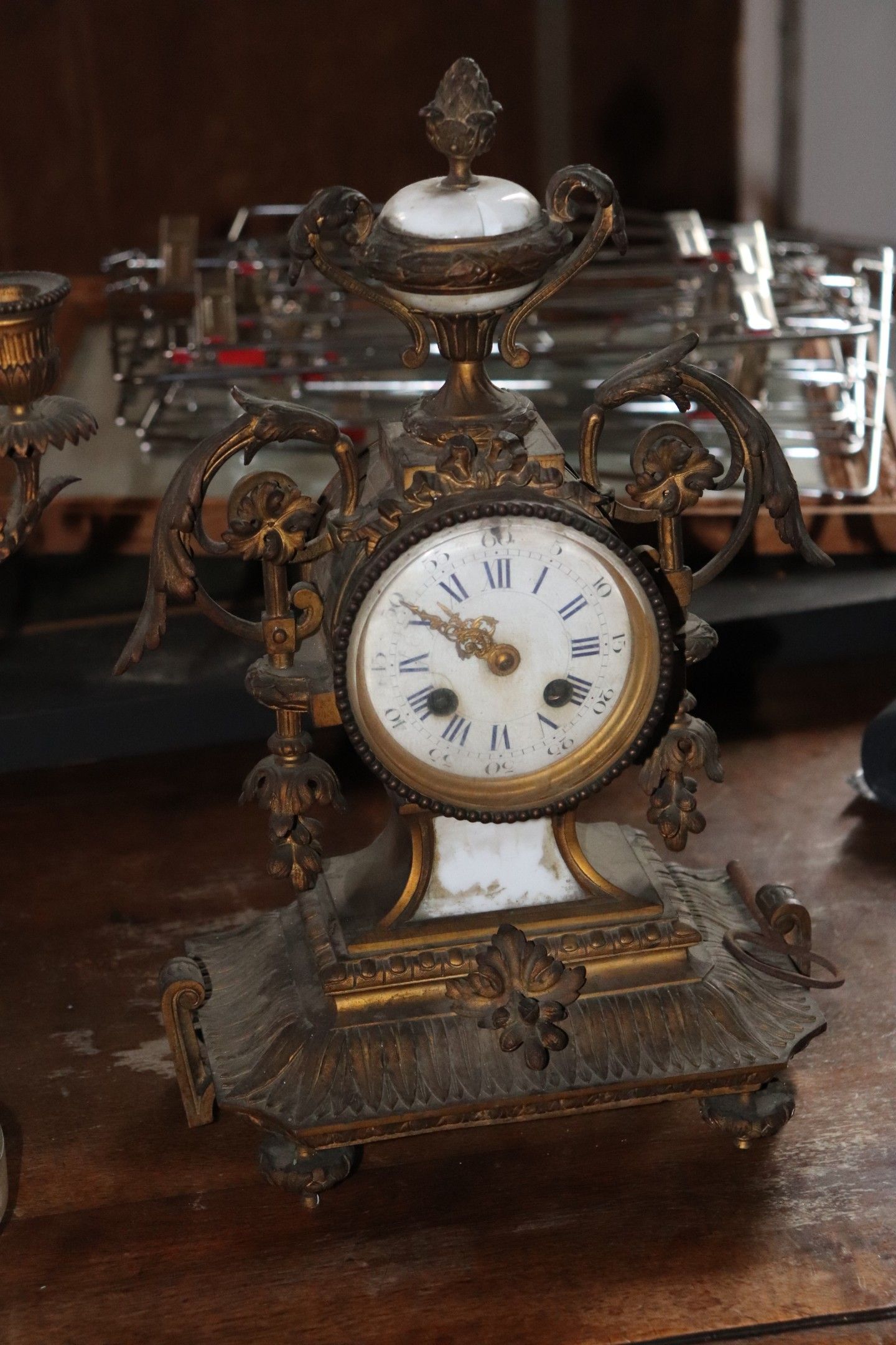 Louis XV style mantel set in regula and porcelain plates (ht 35 cm), enamelled dial with Arabic numerals, with its pair of four-light candelabra (ht 37 cm)
