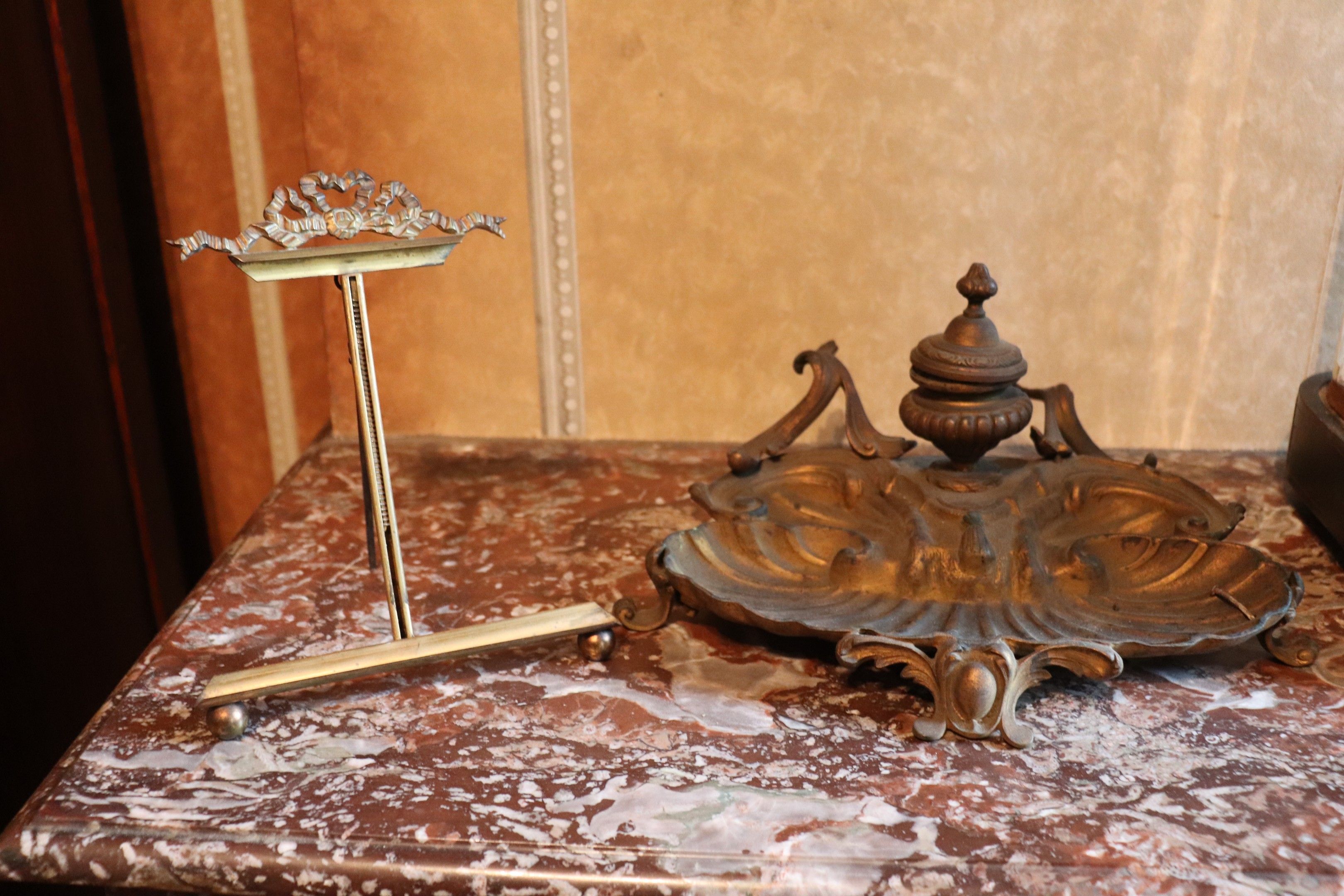 Napoleon III gilt bronze inkwell with shell decoration (Lg 27 cm) and a Louis XVI style brass picture frame without its glass.