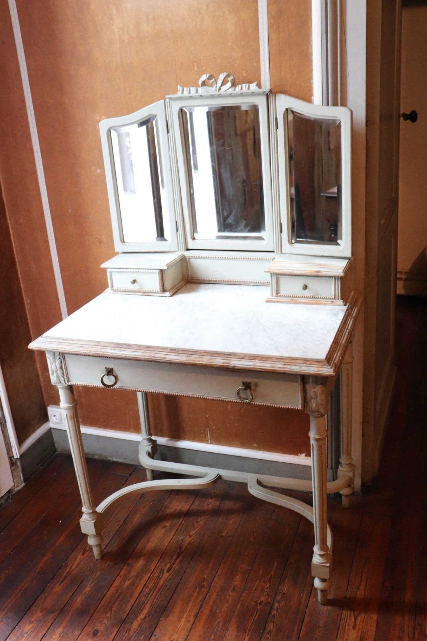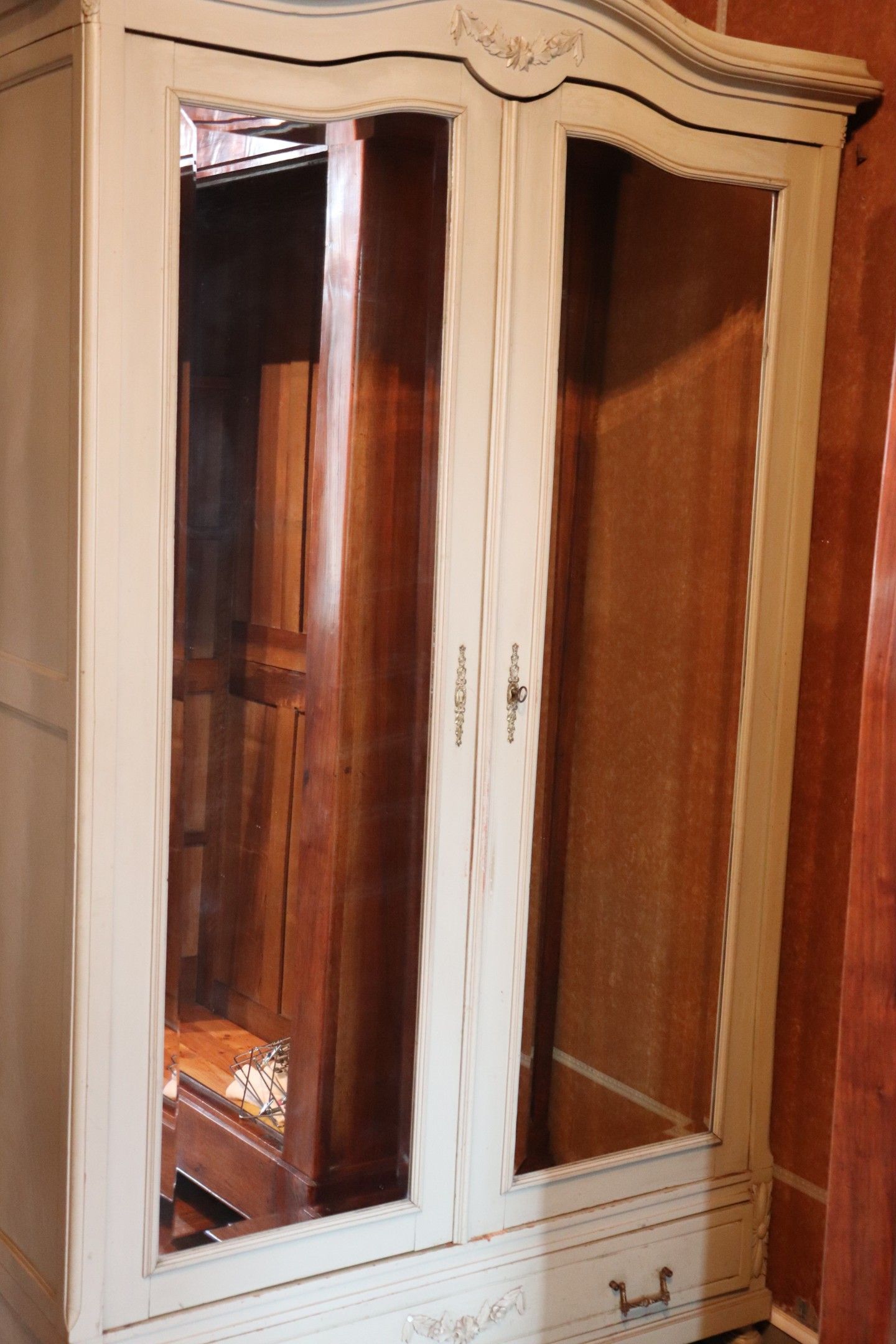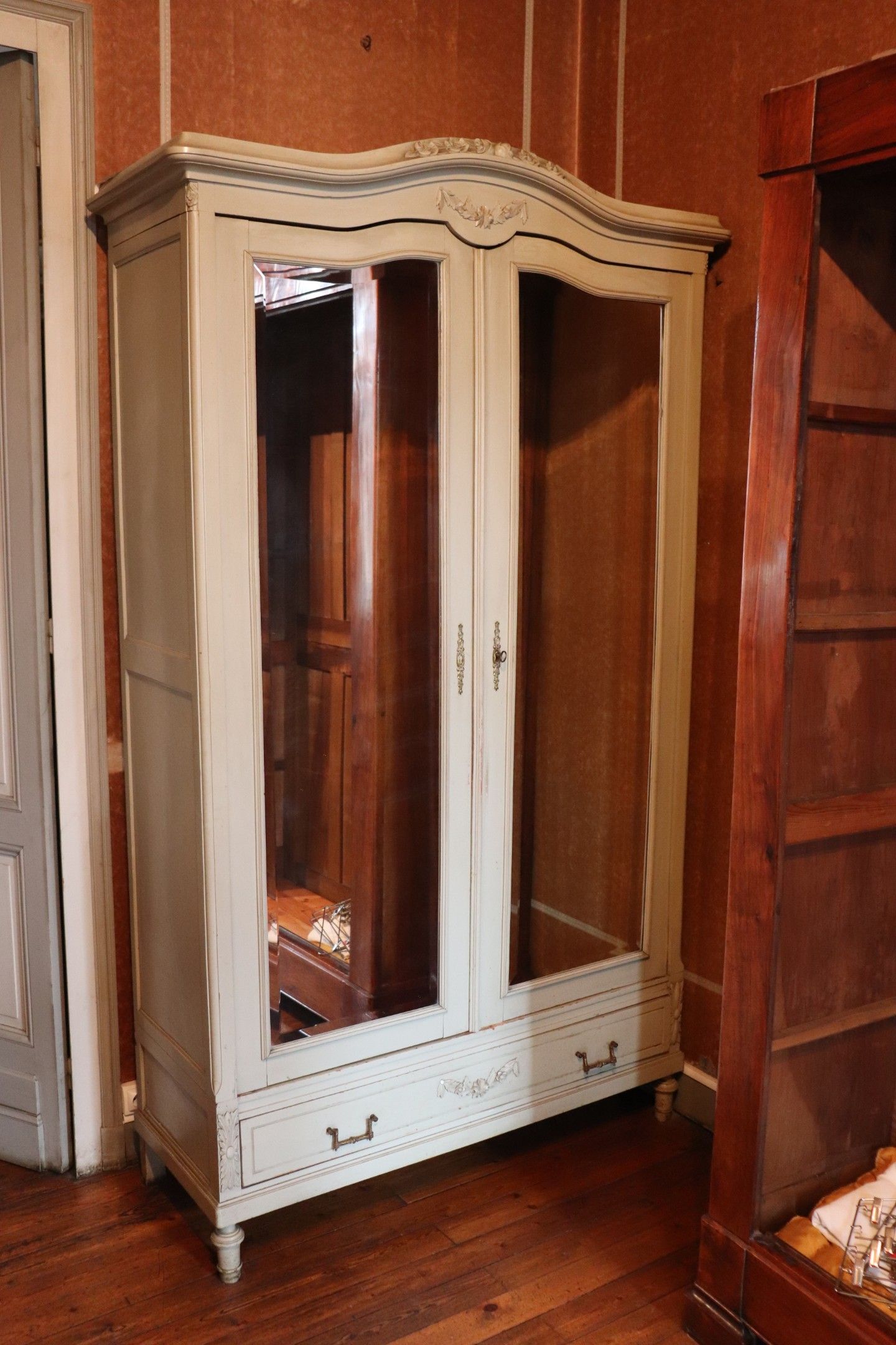 Louis XVI style bedroom in grey champi comprising a 140 cm wide wood bed, a bedside cabinet (86 cm high), a wardrobe with two glass doors and a drawer at the bottom (230 x 130 x 50), a dressing table with marble top (136 x 80 x 52), a cupboard with one cream-coloured glass door (170 x 70 x 38 cm), and a dressing table with a glass door and a drawer at the bottom (230 x 110 x 53). A bedside cabinet is attached.