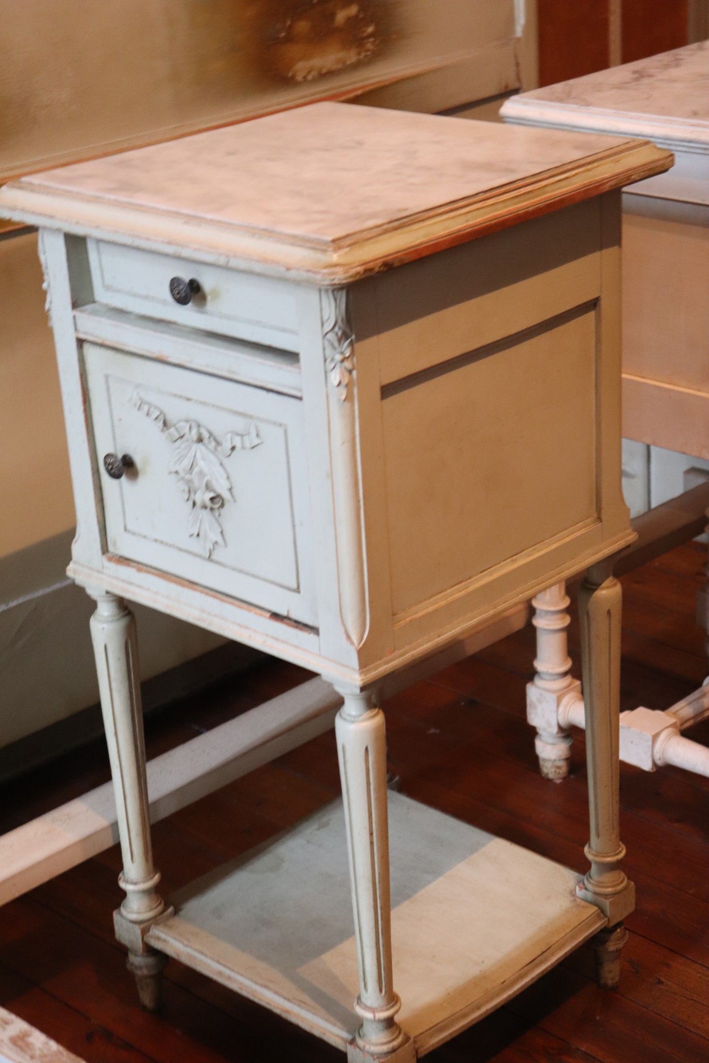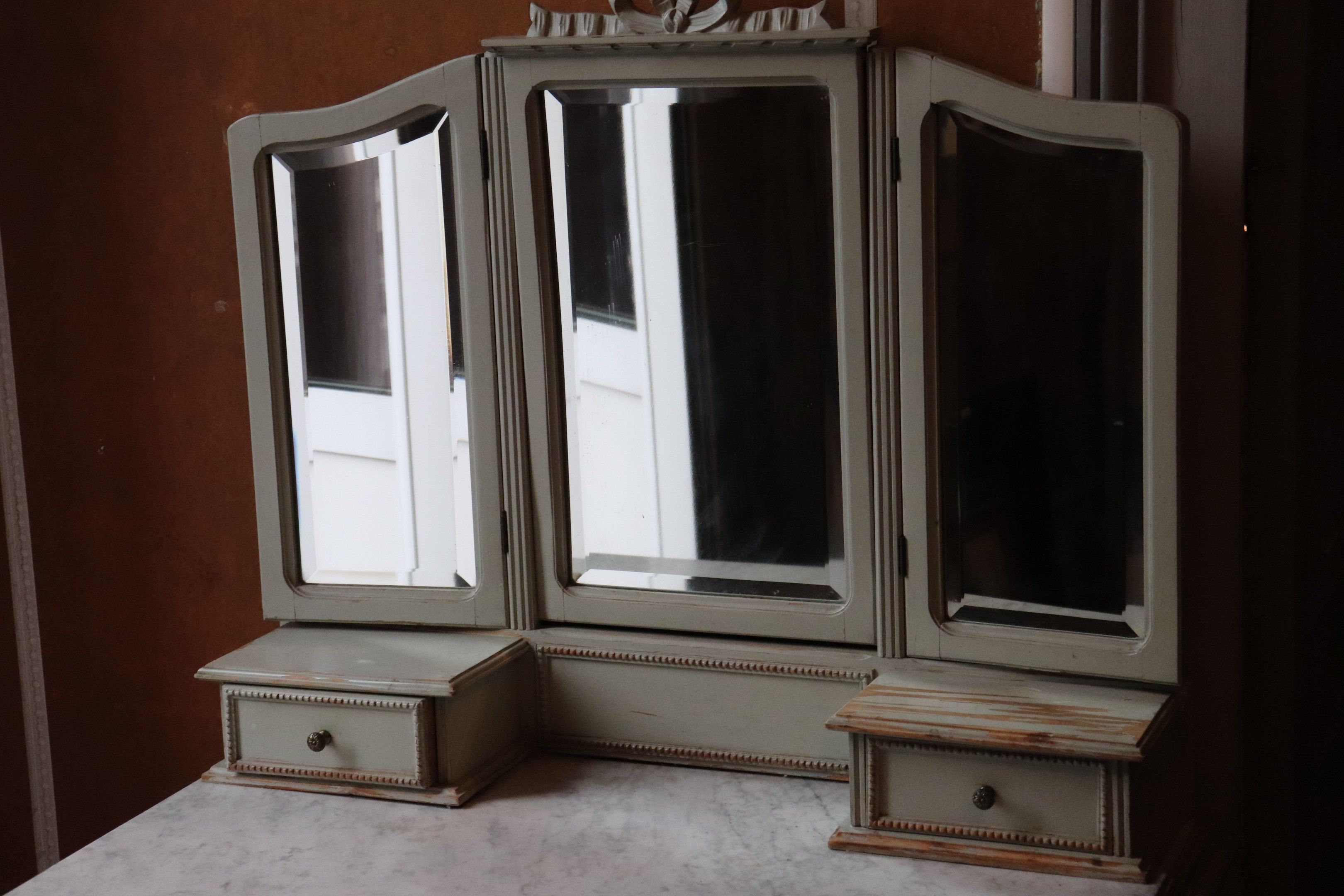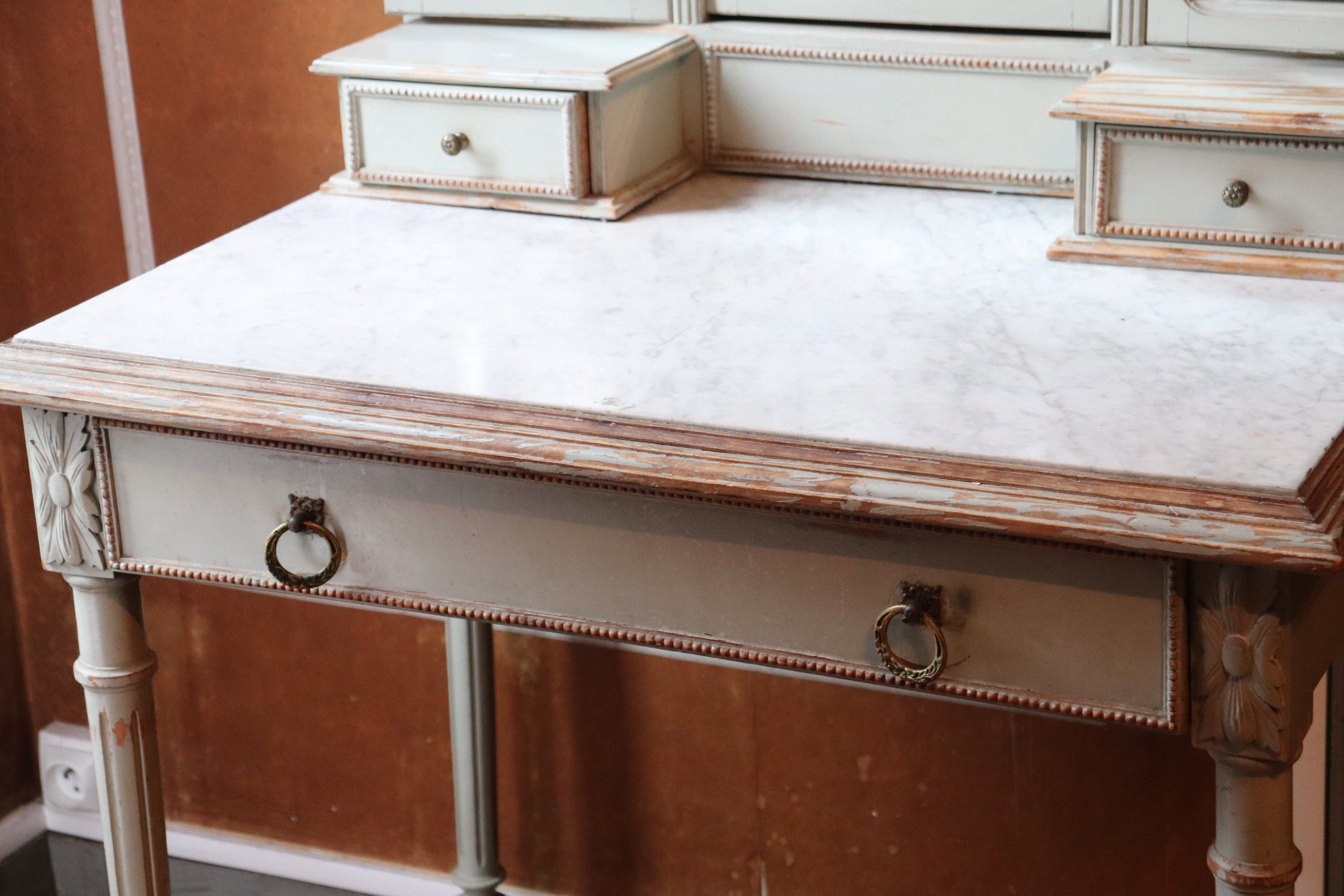 Louis XVI style bedroom in grey champi comprising a 140 cm wide wood bed, a bedside cabinet (86 cm high), a wardrobe with two glass doors and a drawer at the bottom (230 x 130 x 50), a dressing table with marble top (136 x 80 x 52), a cupboard with one cream-coloured glass door (170 x 70 x 38 cm), and a dressing table with a glass door and a drawer at the bottom (230 x 110 x 53). A bedside cabinet is attached.