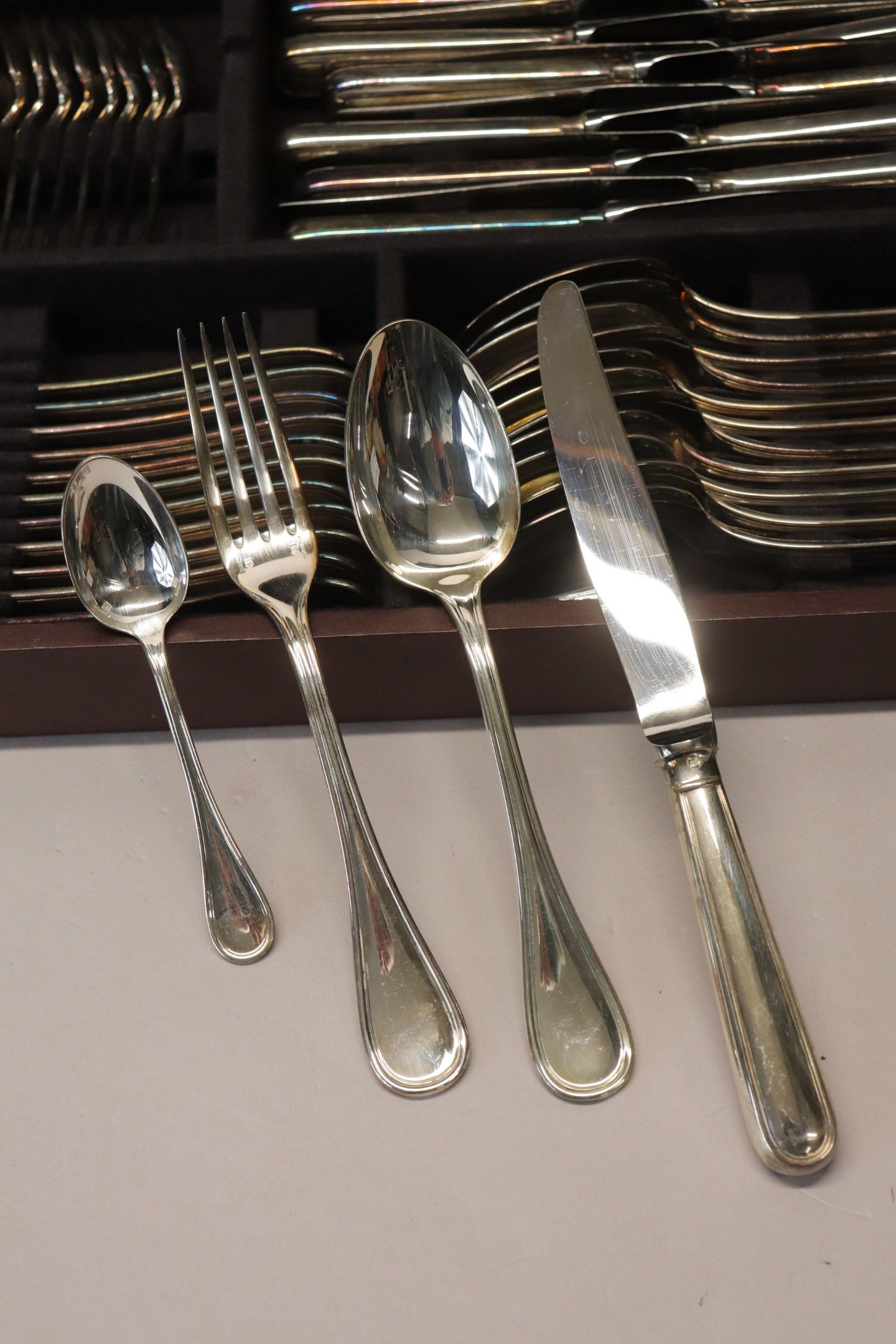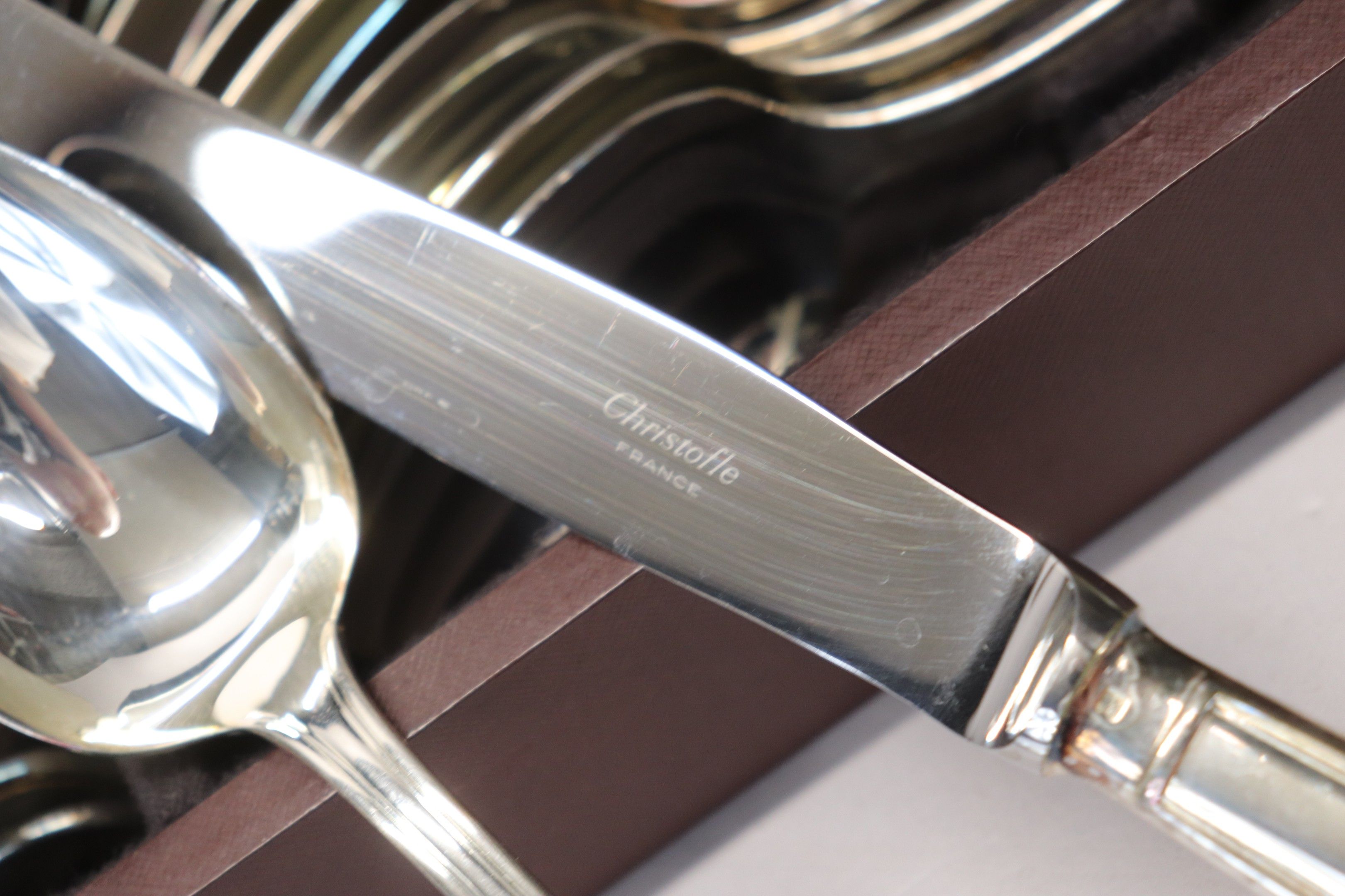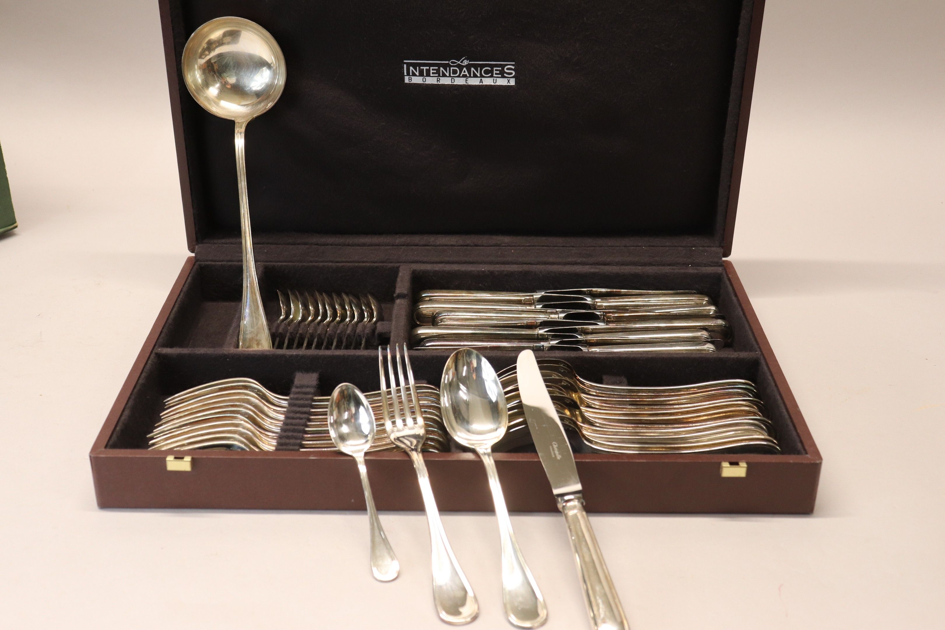 CHRISTOFLE model Albi, silver-plated silverware set including 12 knives, 12 forks, 12 spoons, 12 teaspoons and a ladle.