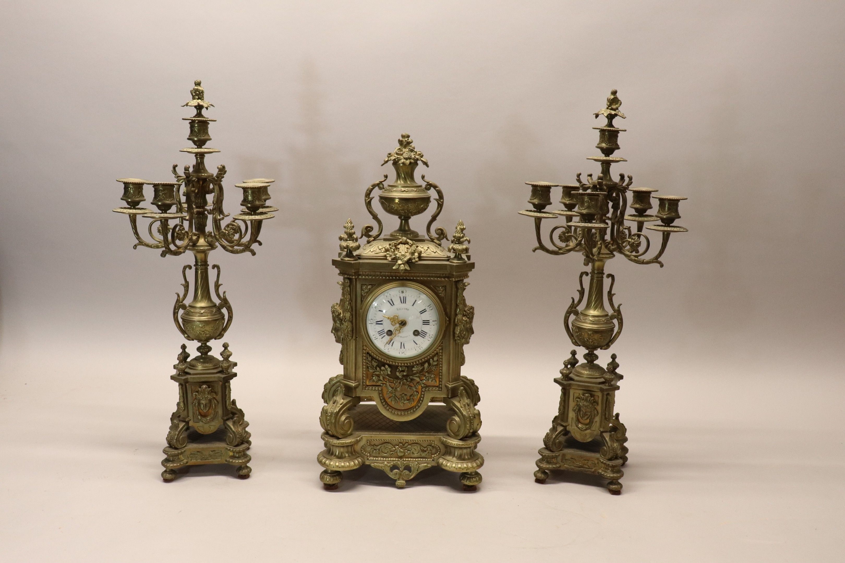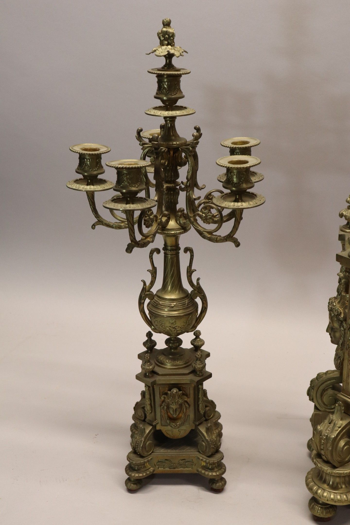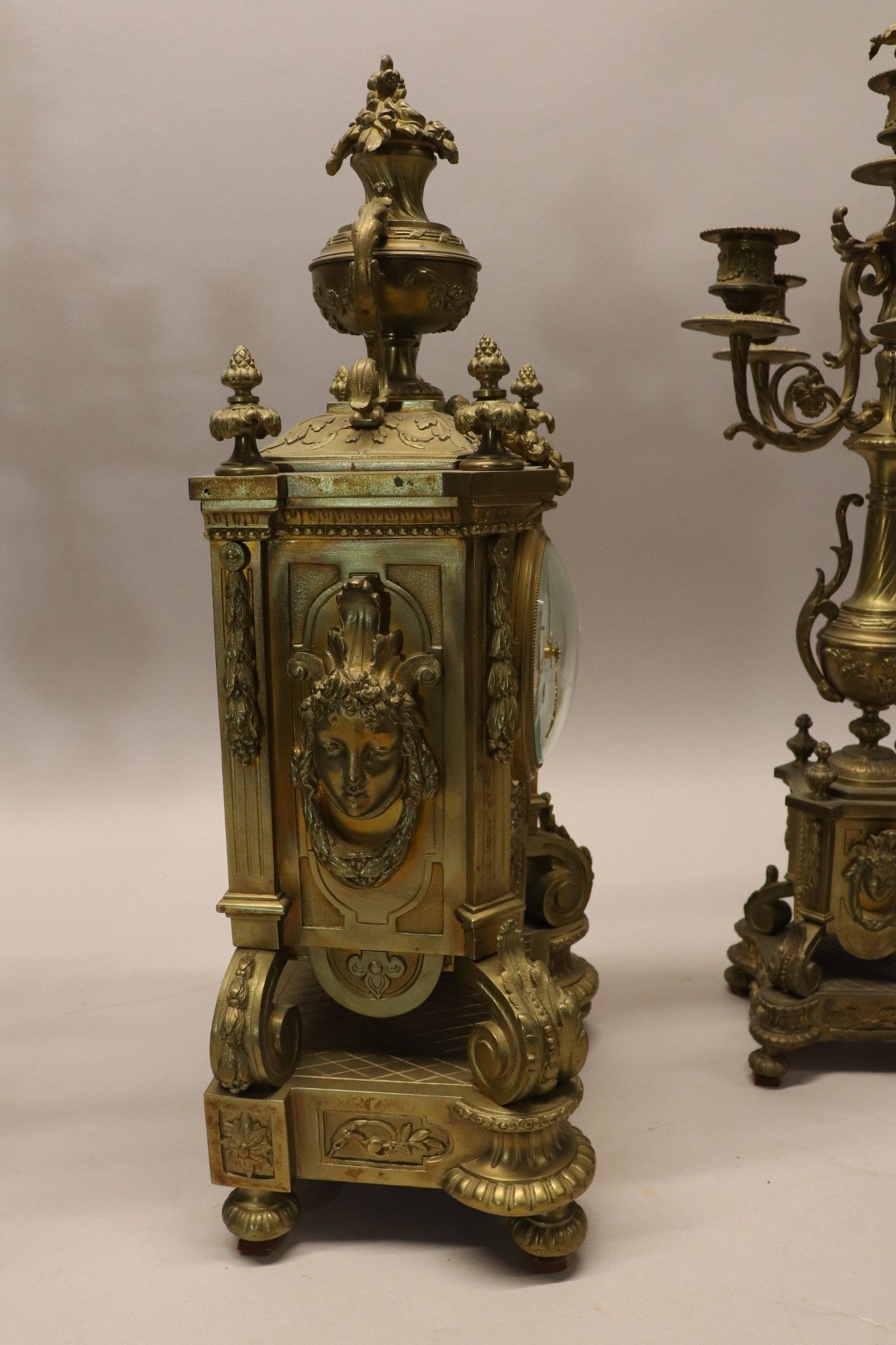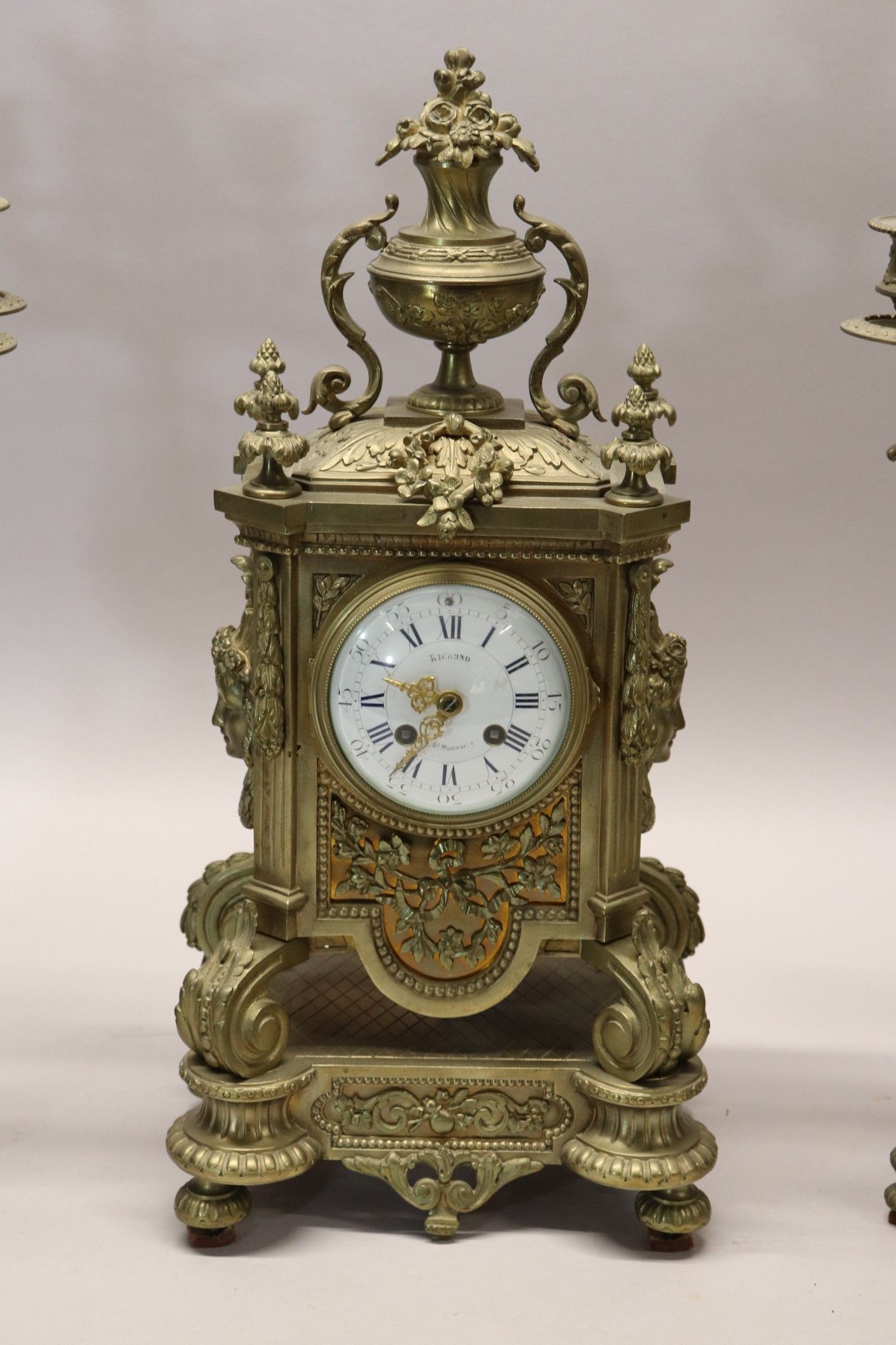 RICHOND Bld Montmartre, gilt bronze mantelpiece, clock and pair of six-light candelabra in the Louis XVI style, decorated with mascarons, Napoleon III period. Height of clock 52 cm, candelabra 60 cm.