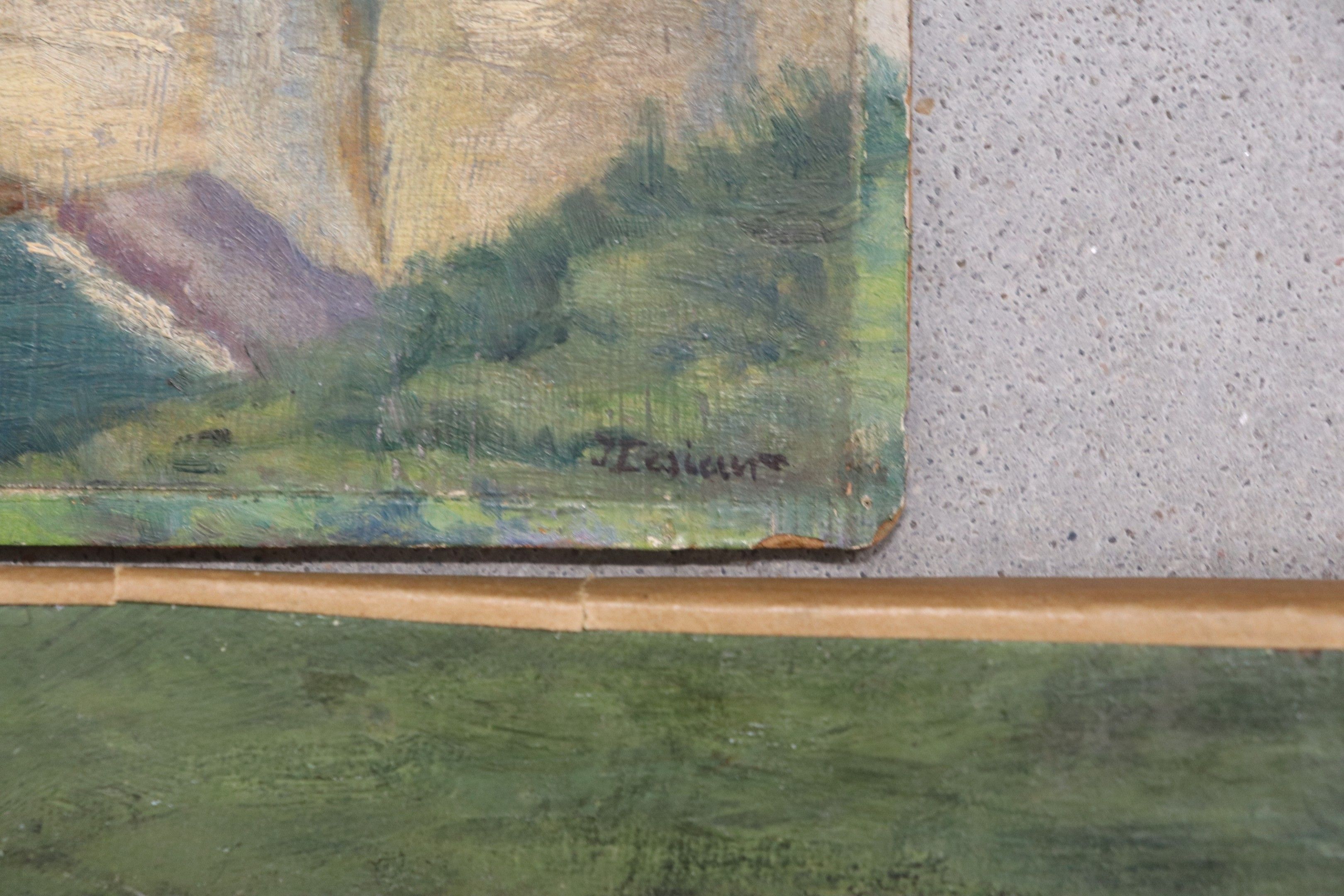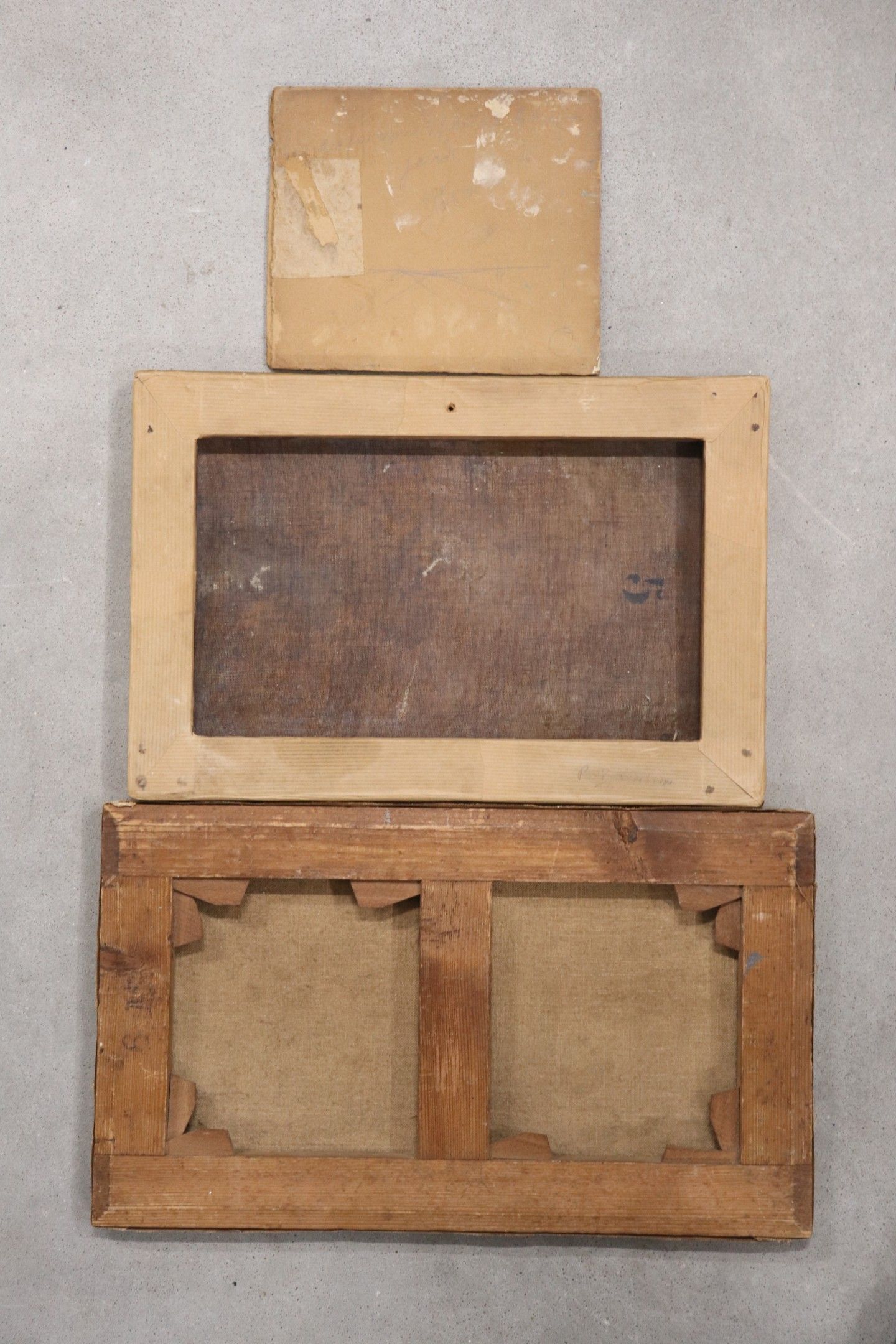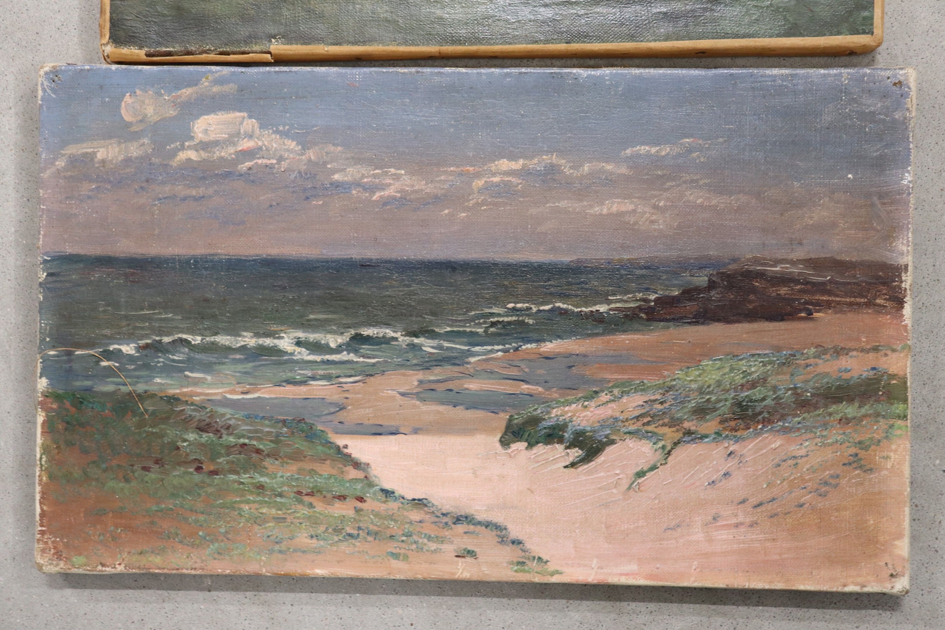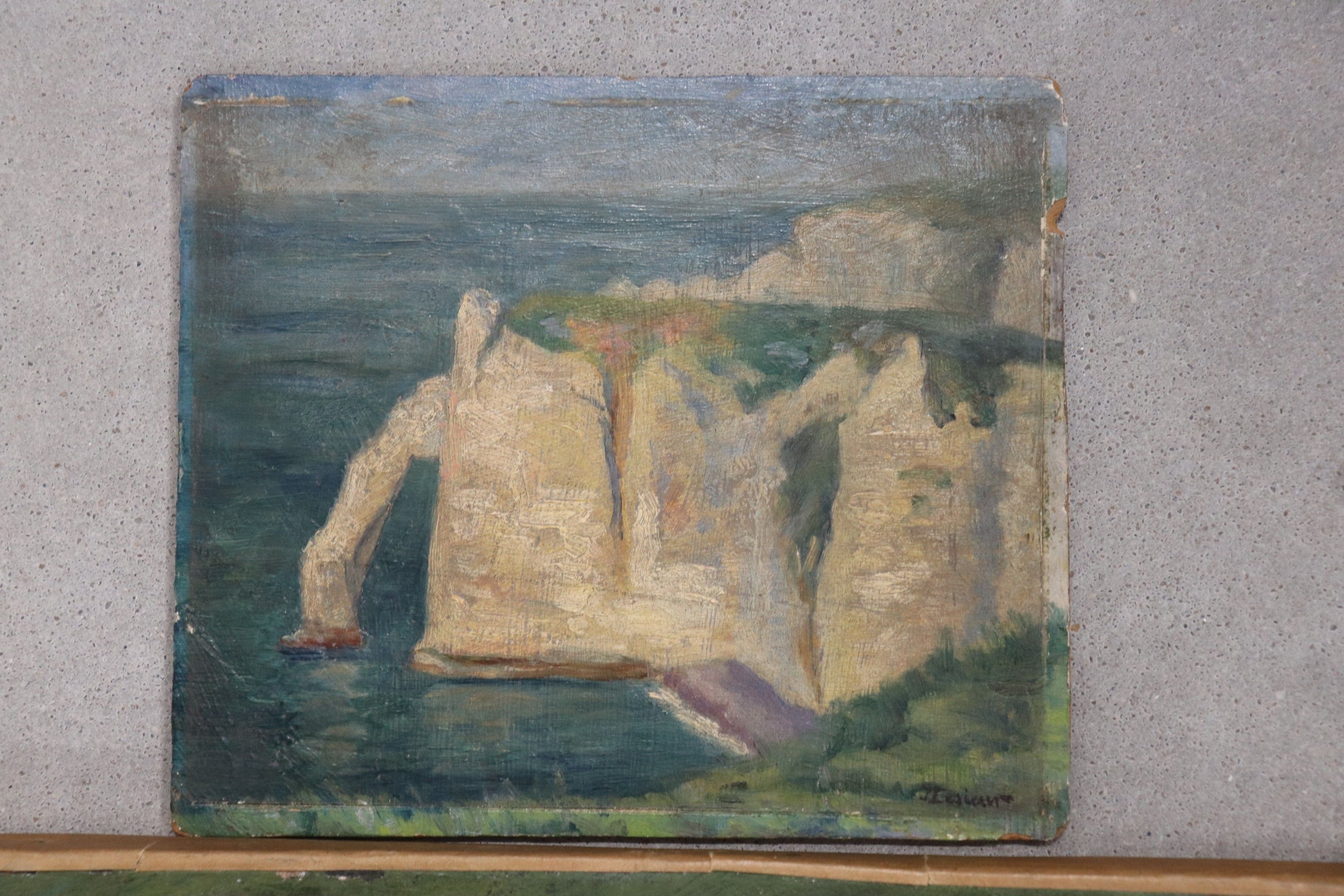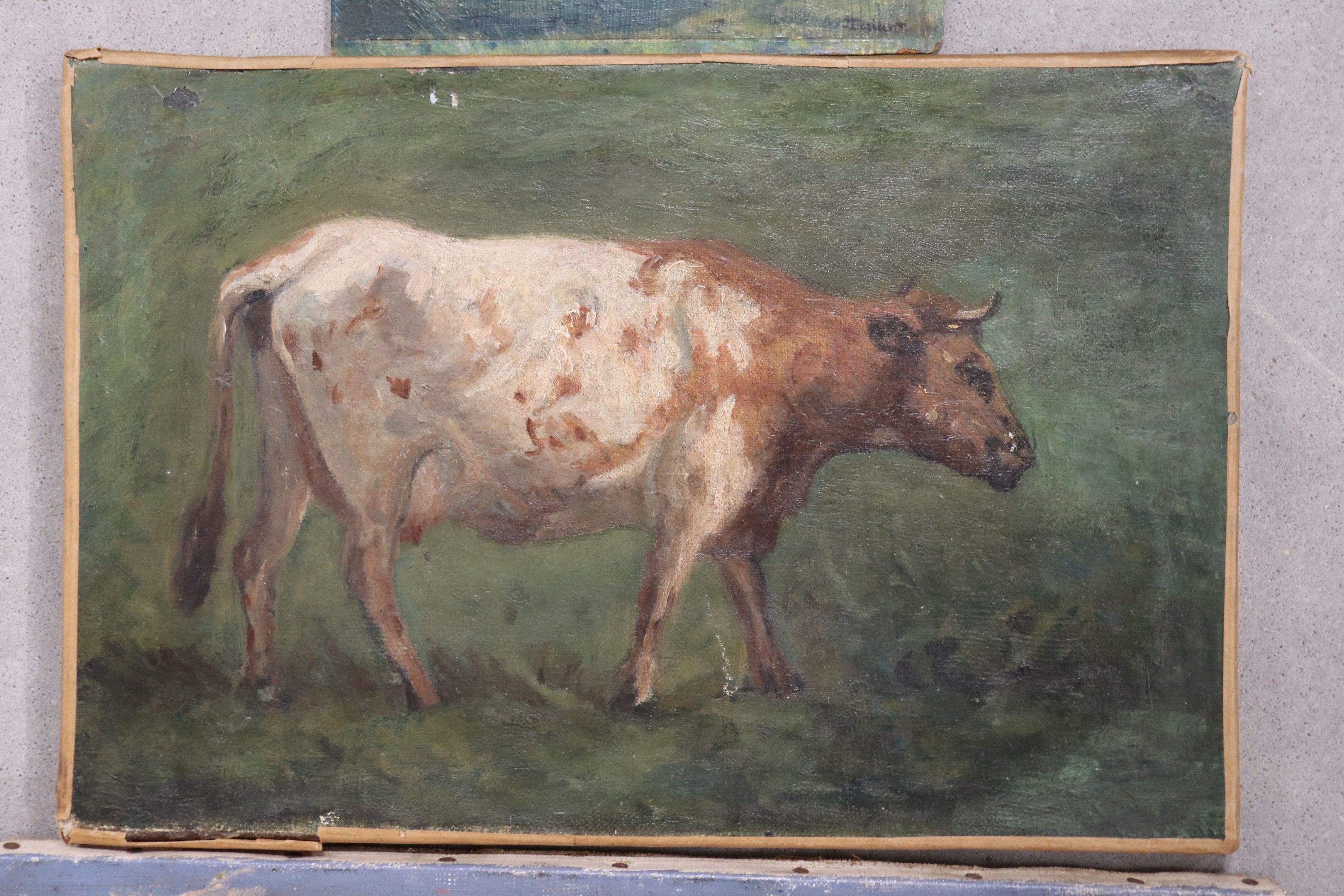 20th century French school, lot of three paintings: two oil on canvas "Cow" and "Beach Landscape" (24 x 37 and 34 x 41 cm) unsigned and one oil on isorel "Landscape of the cliffs of Etretat" signed J LESIEUR (16 x 20 cm)