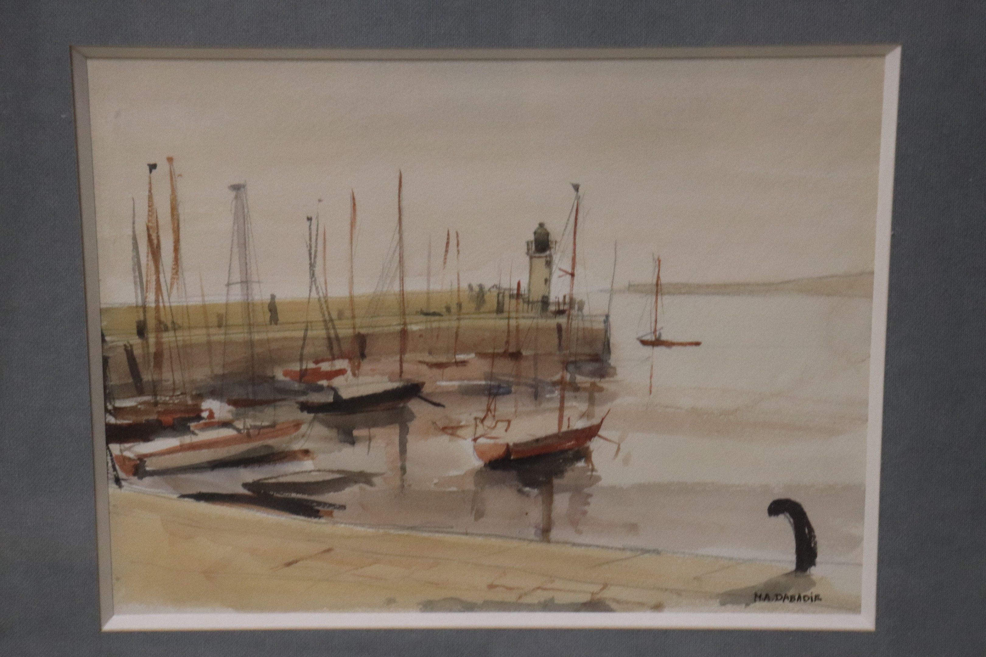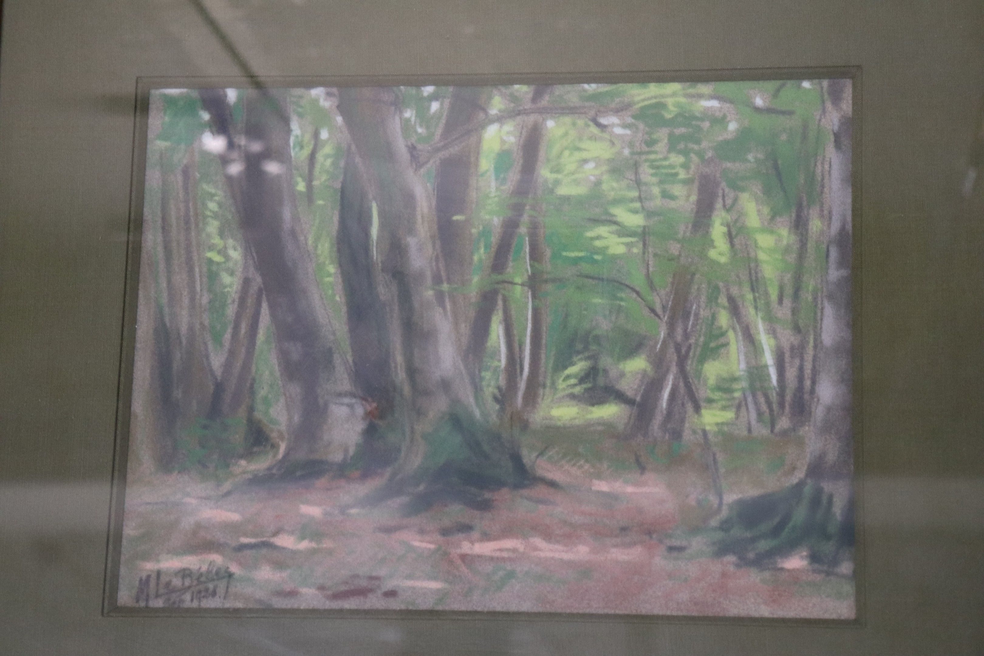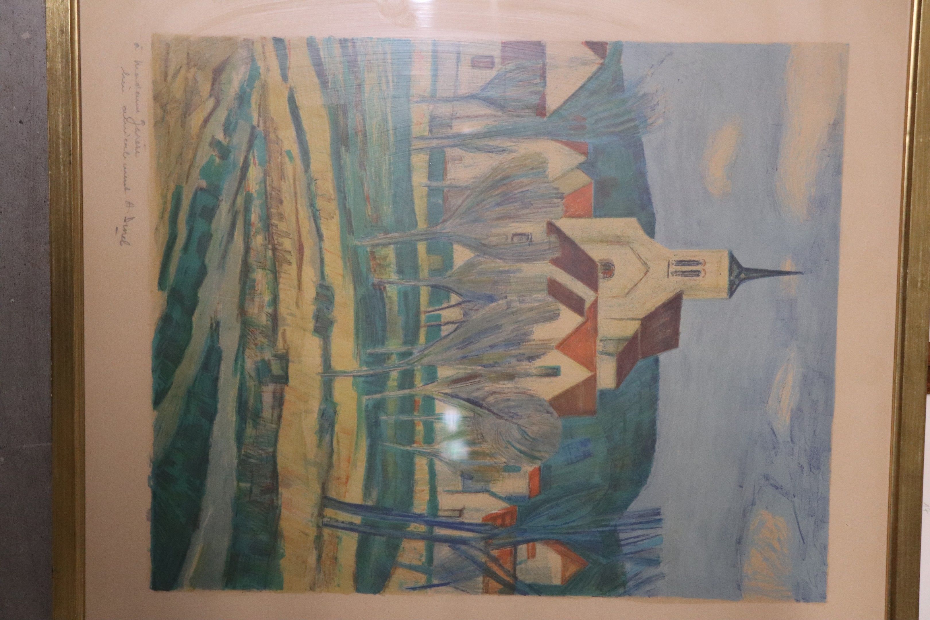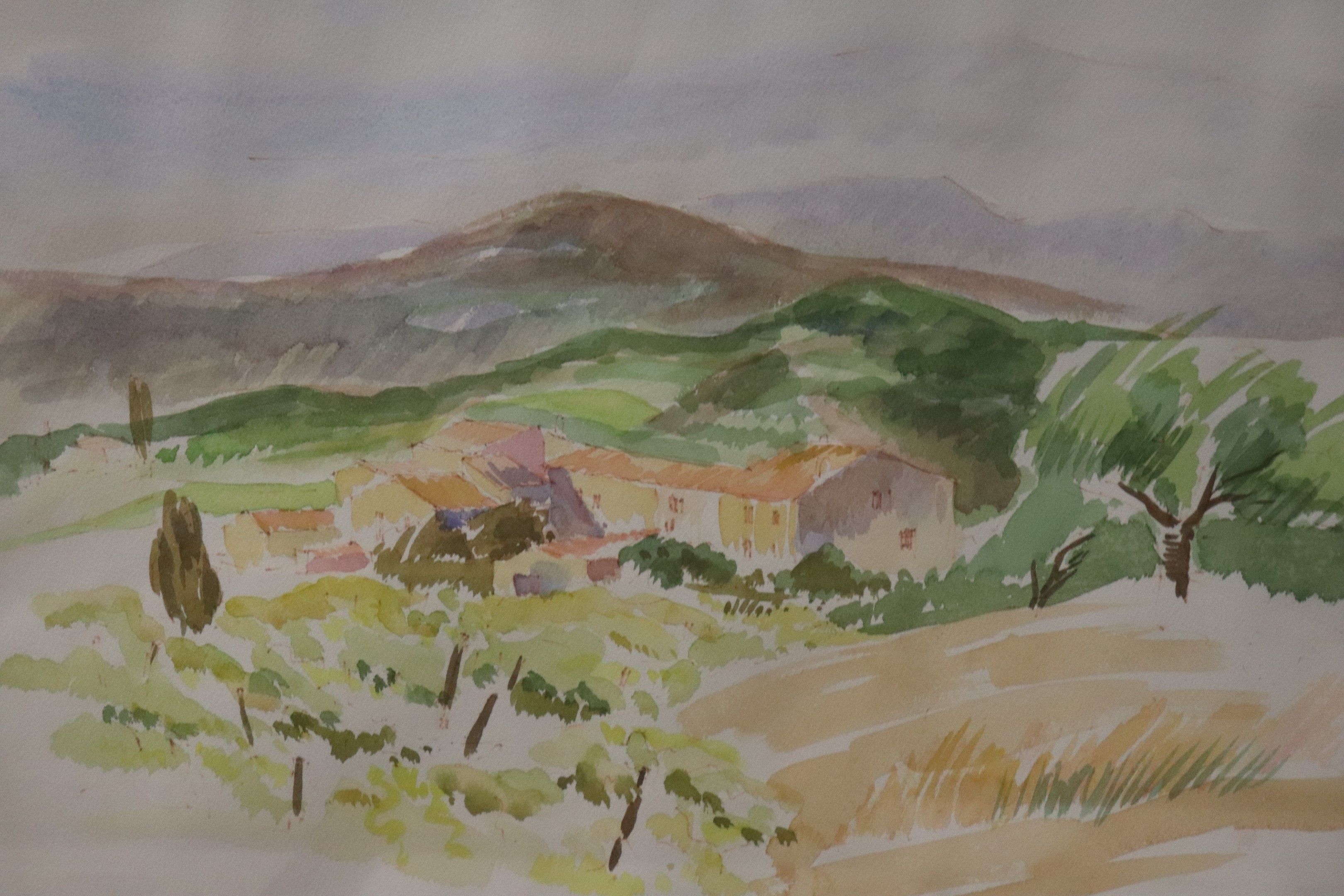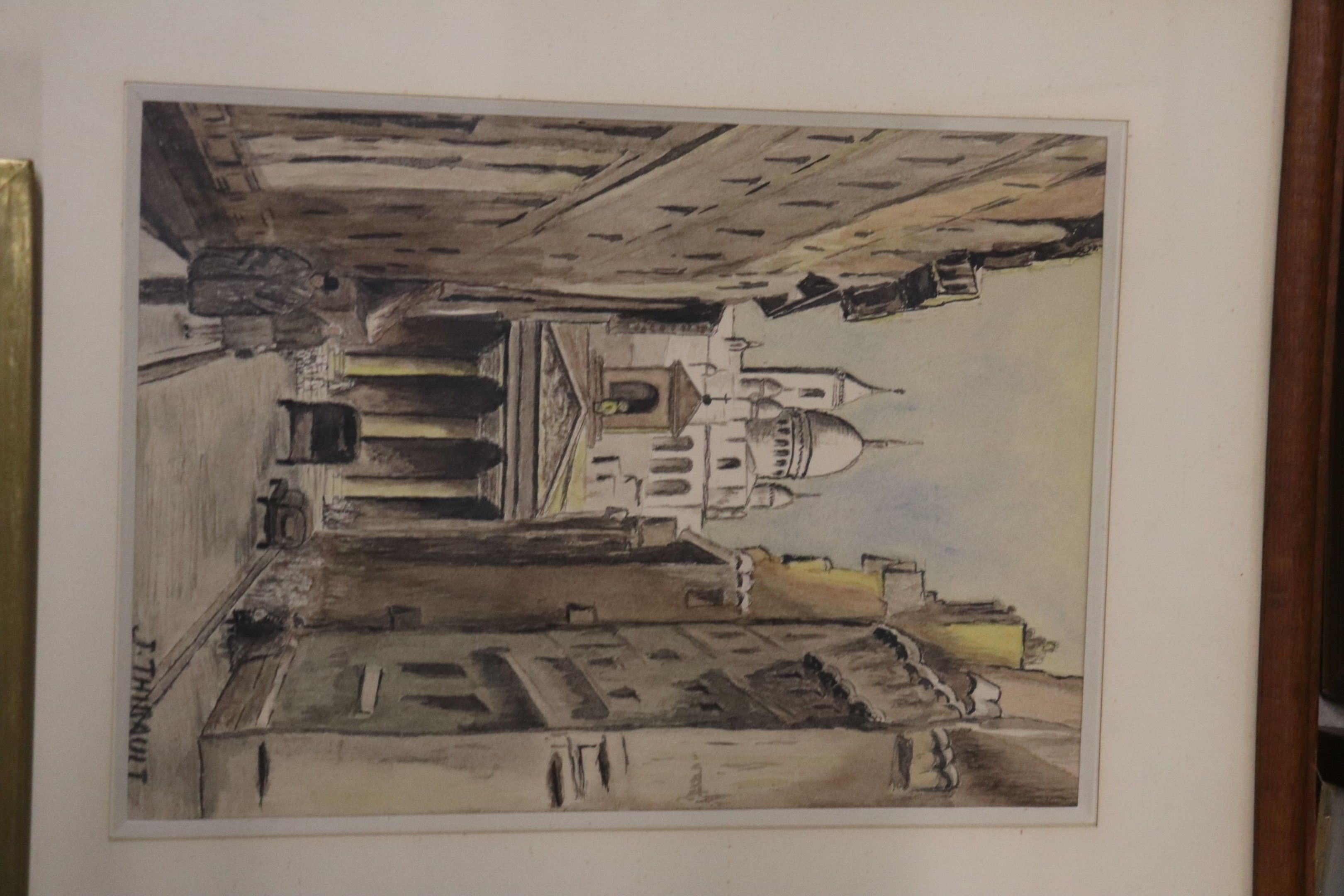 Lot of seven frames: three watercolours including a large pair, one pastel, two polychrome lithographs. From 20 x 26 to 35 x 45 cm