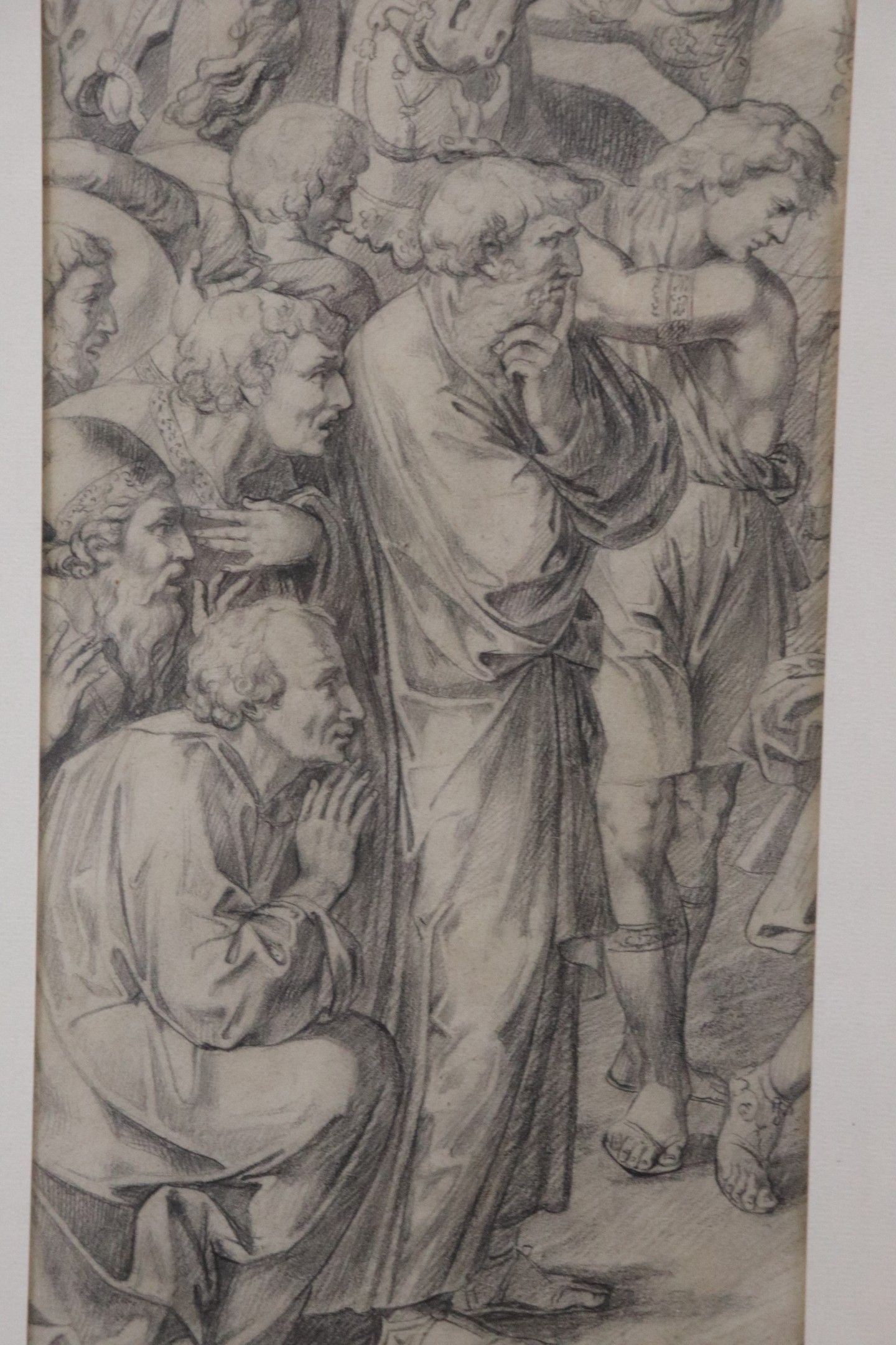 Modern copy after Pietro Santi BARTOLI and RAFFAELLO "Spectators and horses against a landscape background" pencil drawing on paper. 37 x 17 cm on view