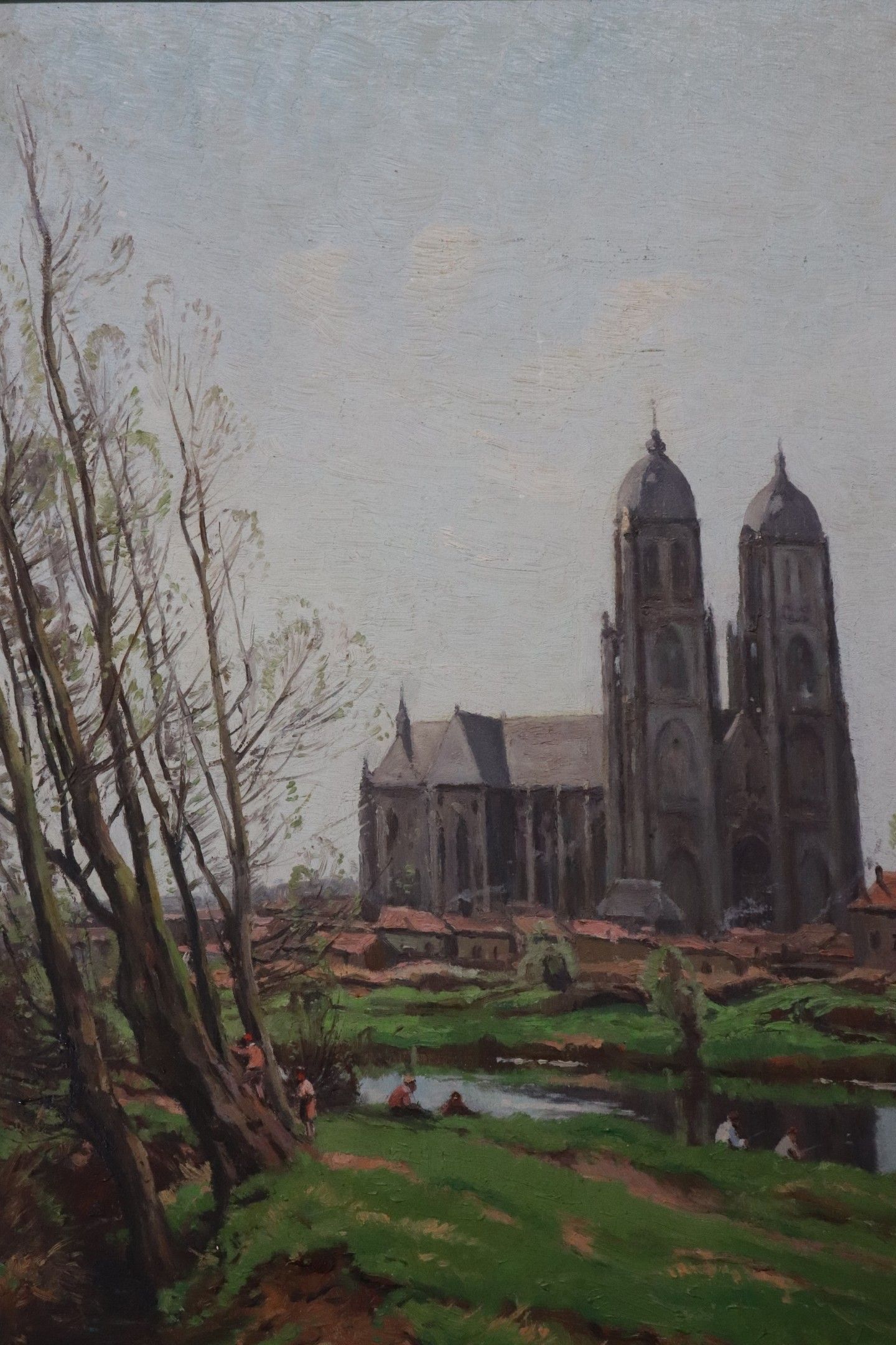 Raymond URBAIN (1892-1962) "Vue de la basilique de St Nicolas de Port - Meurthe et Moselle" oil on panel signed lower left, countersigned, located and dated on the back. 45 x 31 cm