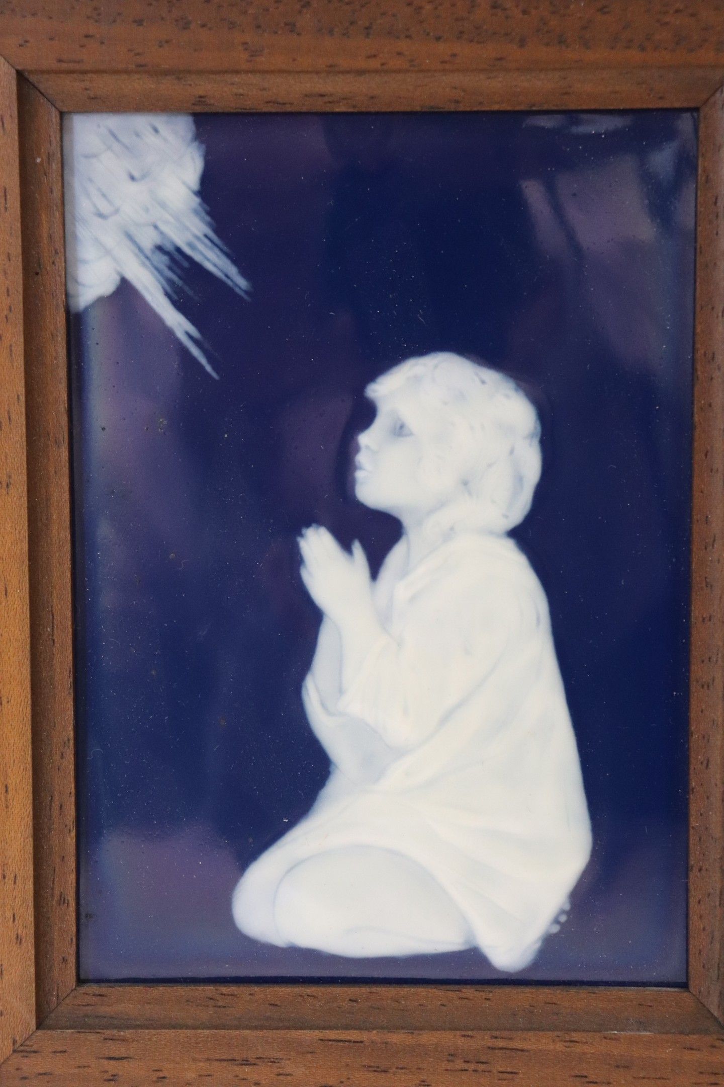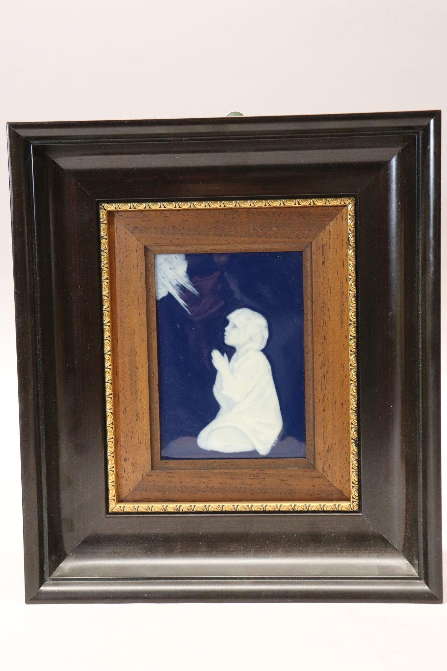 Blue kiln-fired ceramic tile with paste-on-paste decoration of a child at prayer. 14 x 10 cm