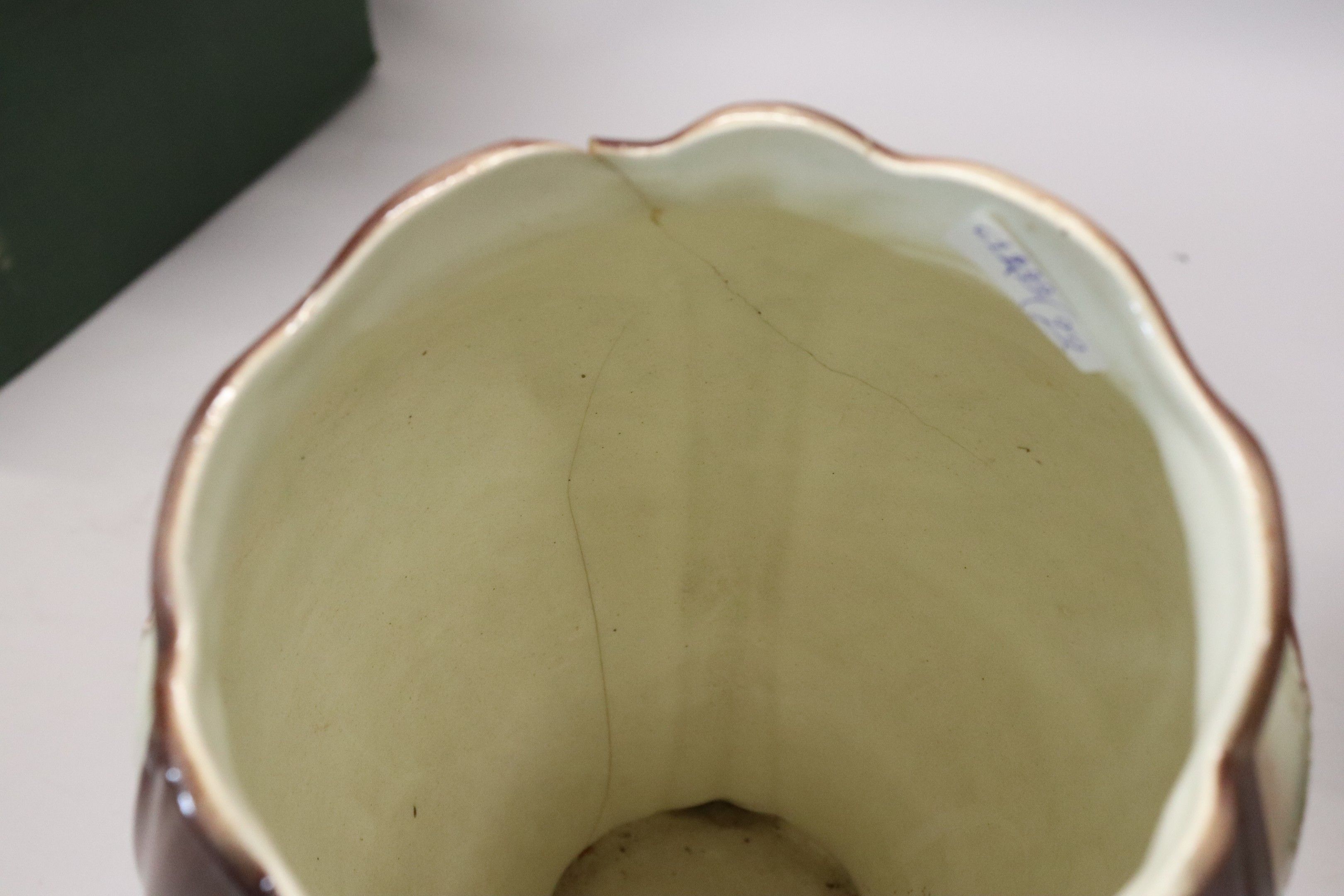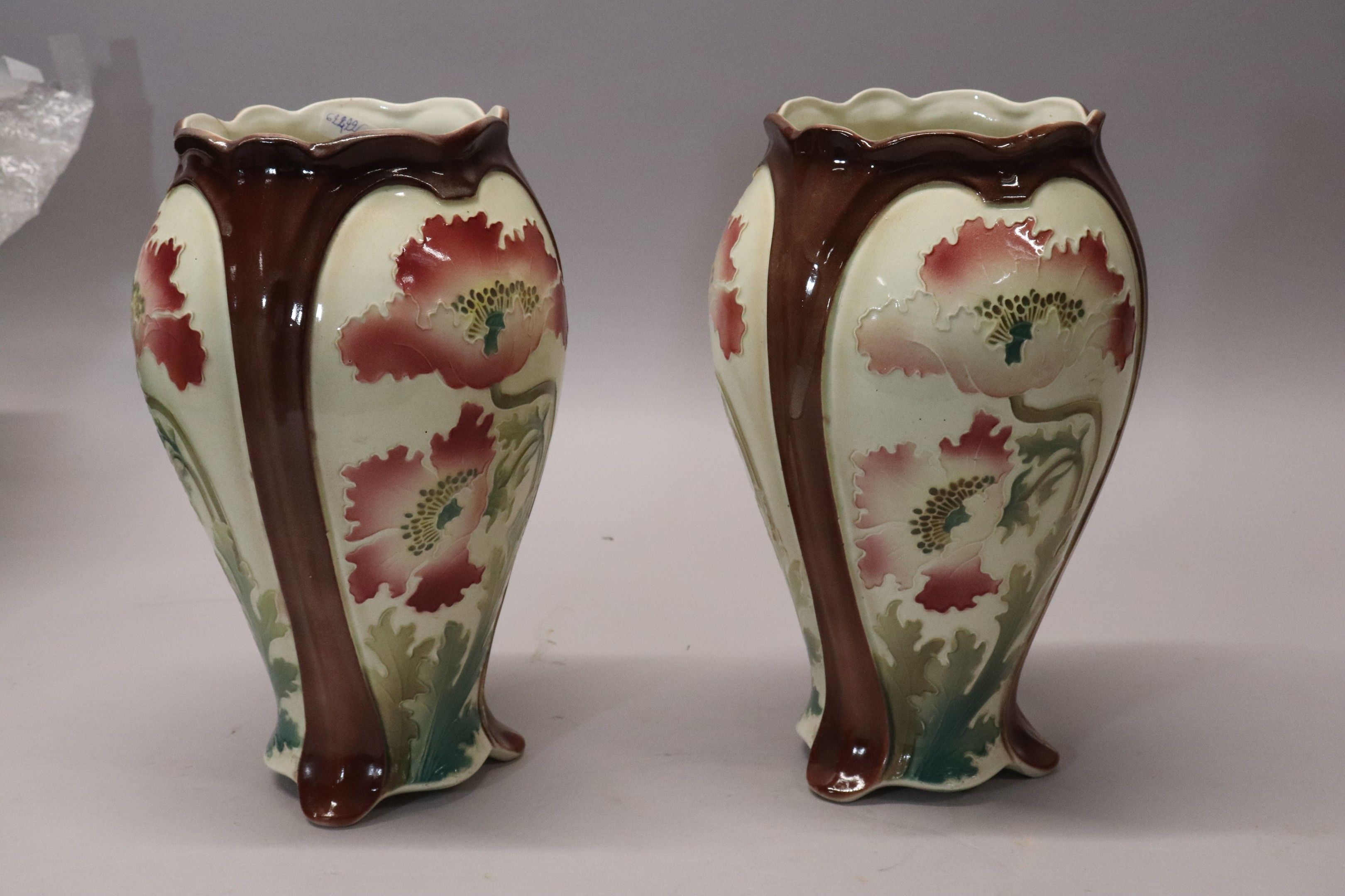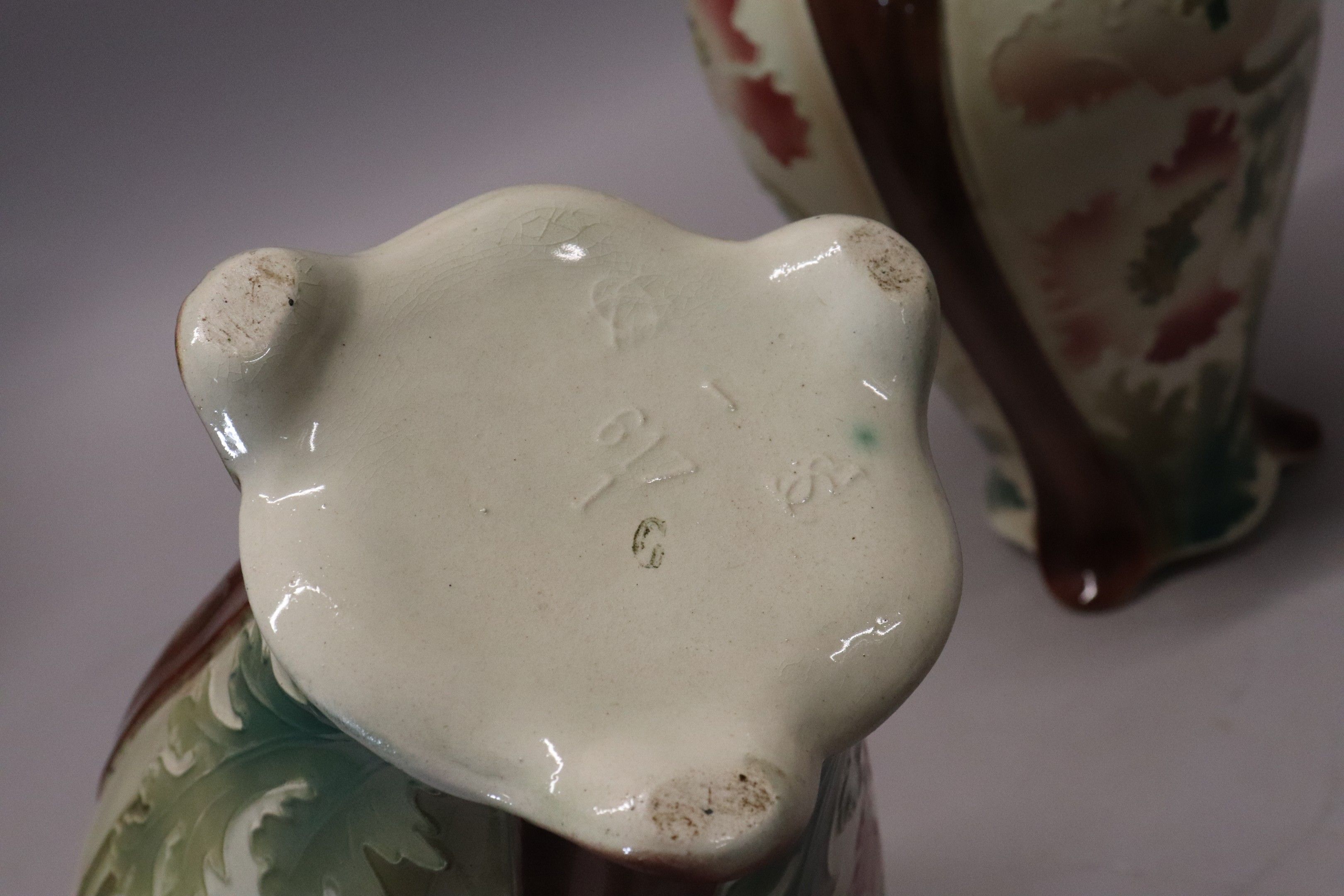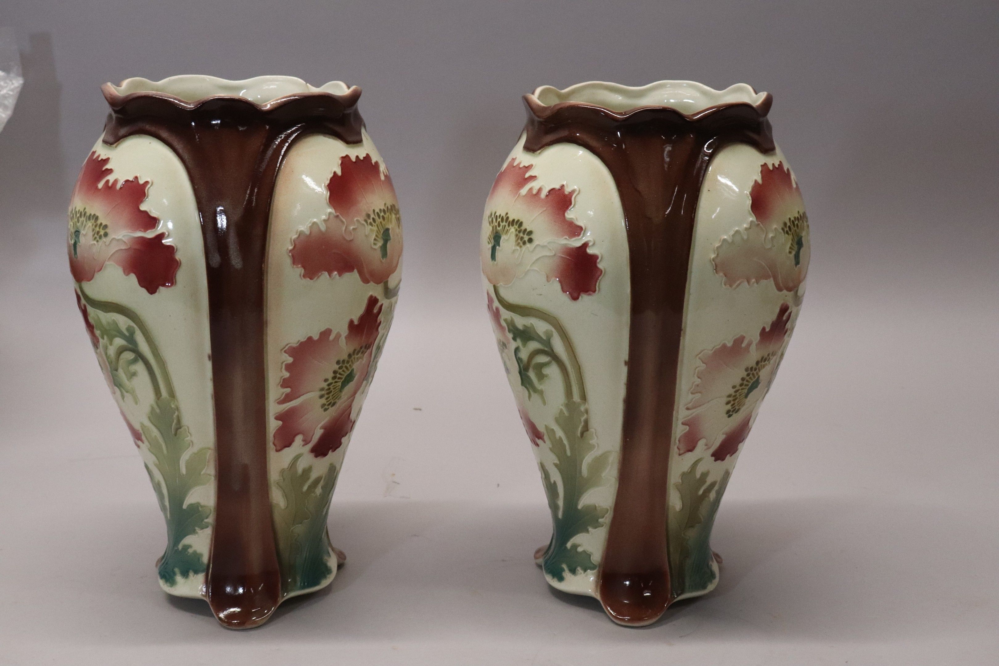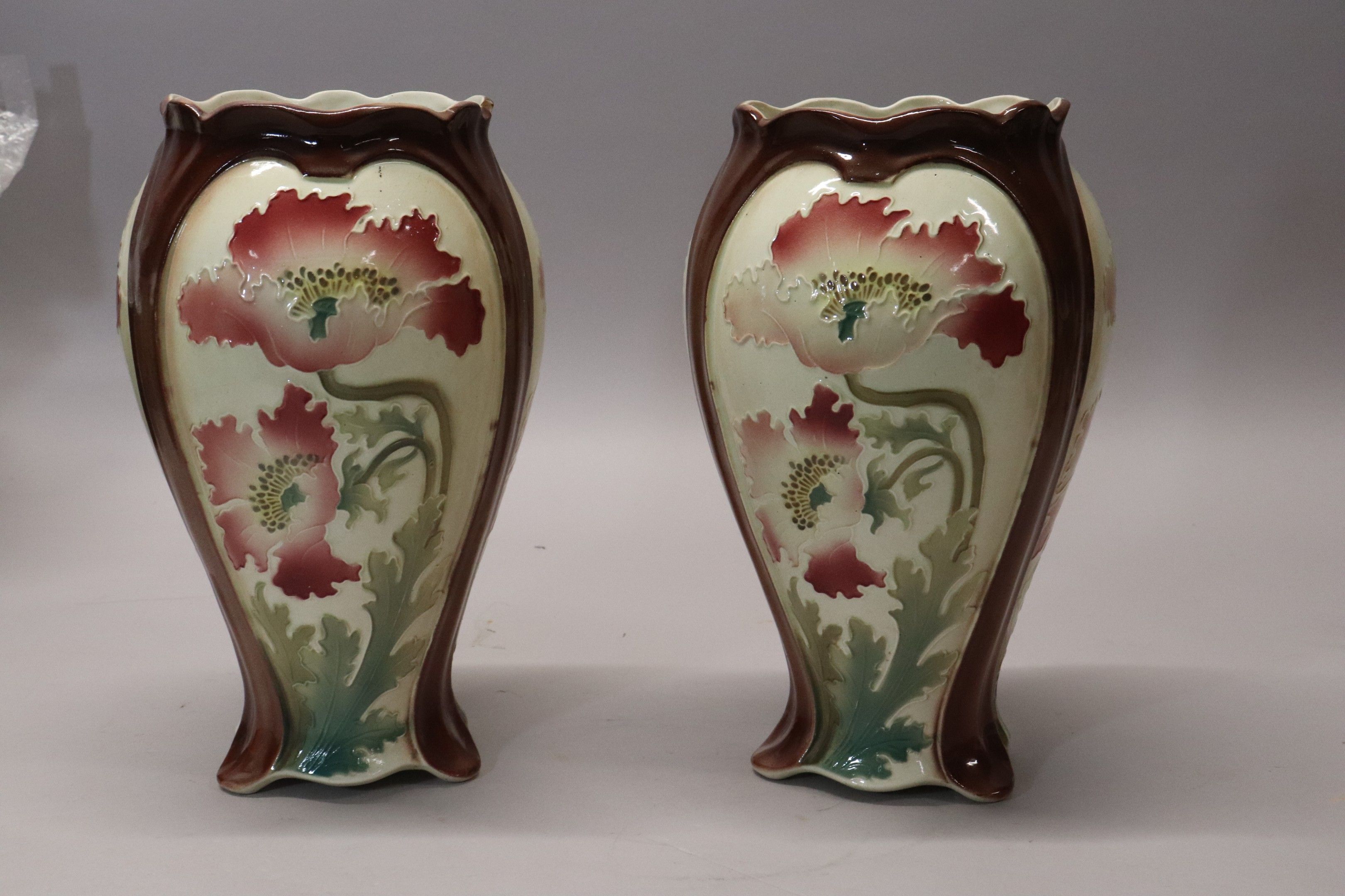 CHOISY LE ROI pair of 1900 barbotine vases with flowers. One is cracked. Height 31 cm