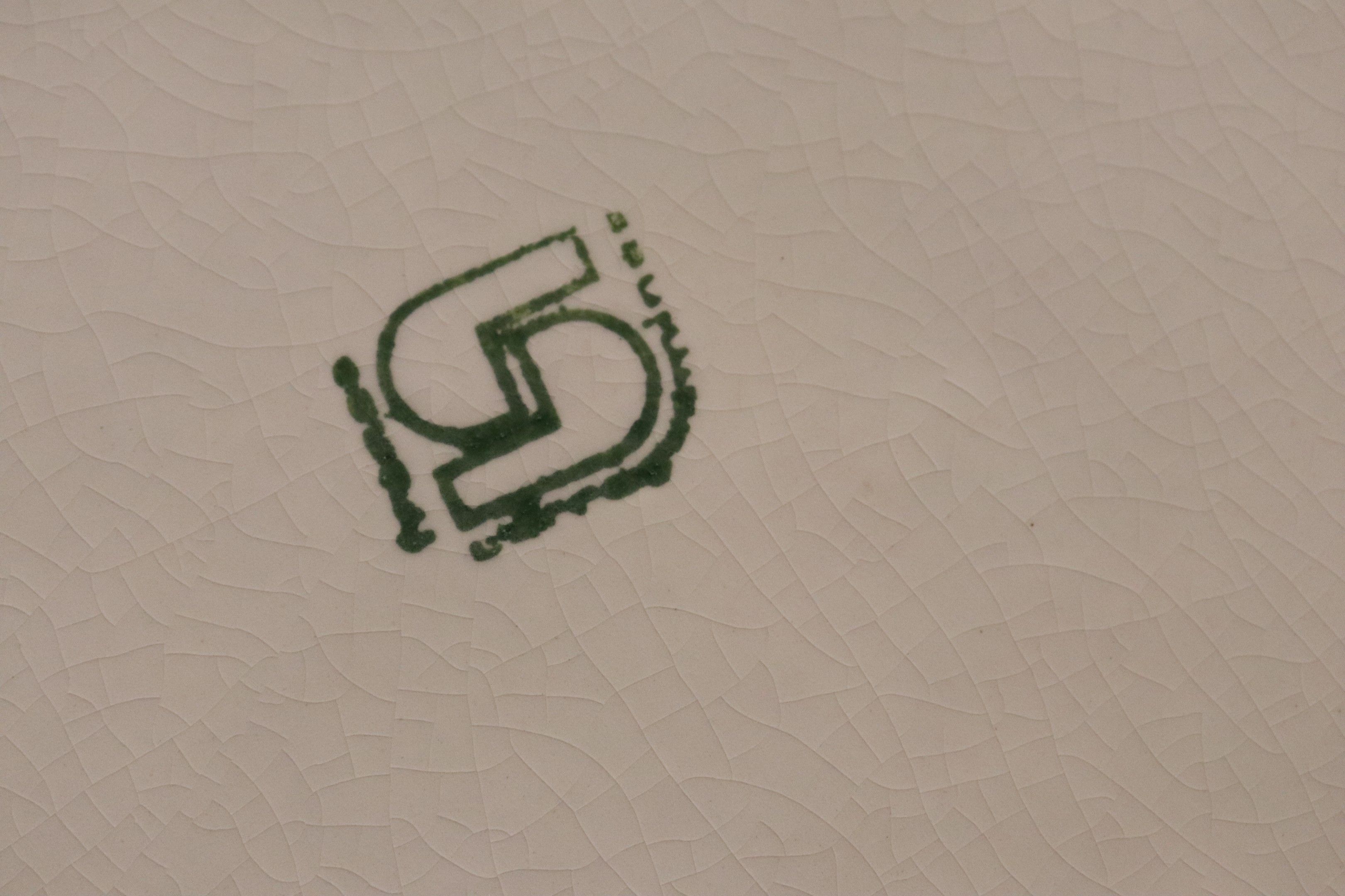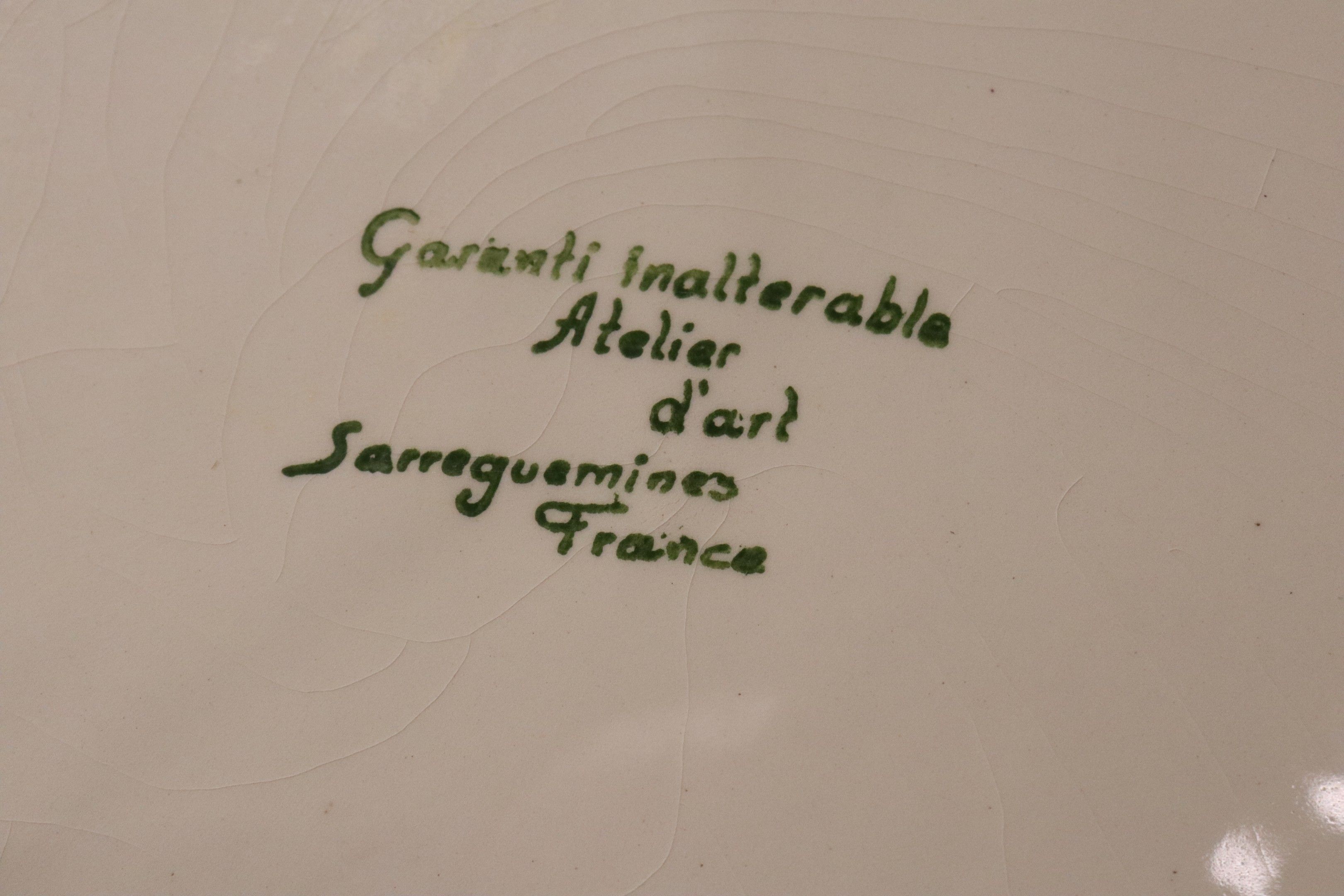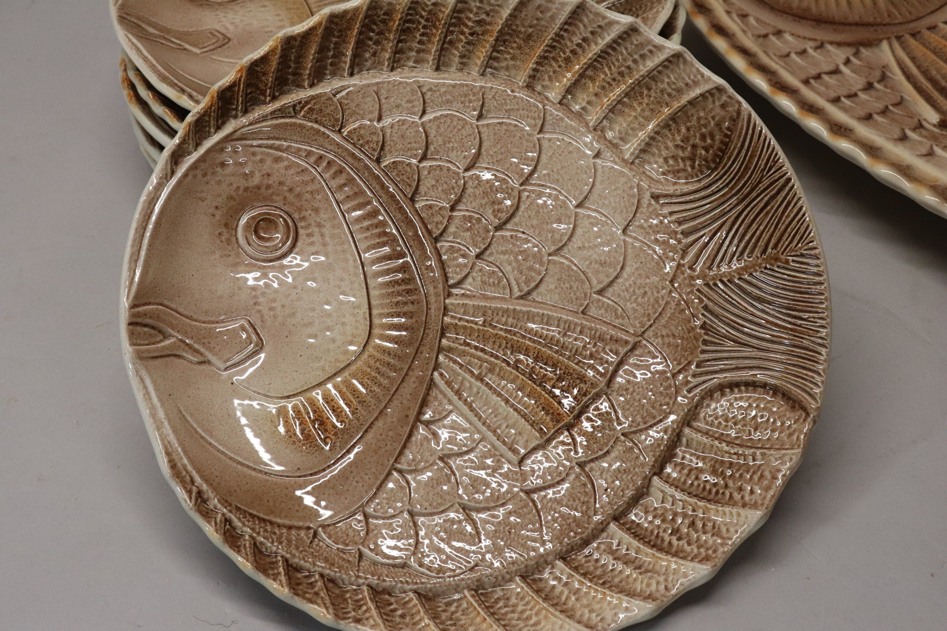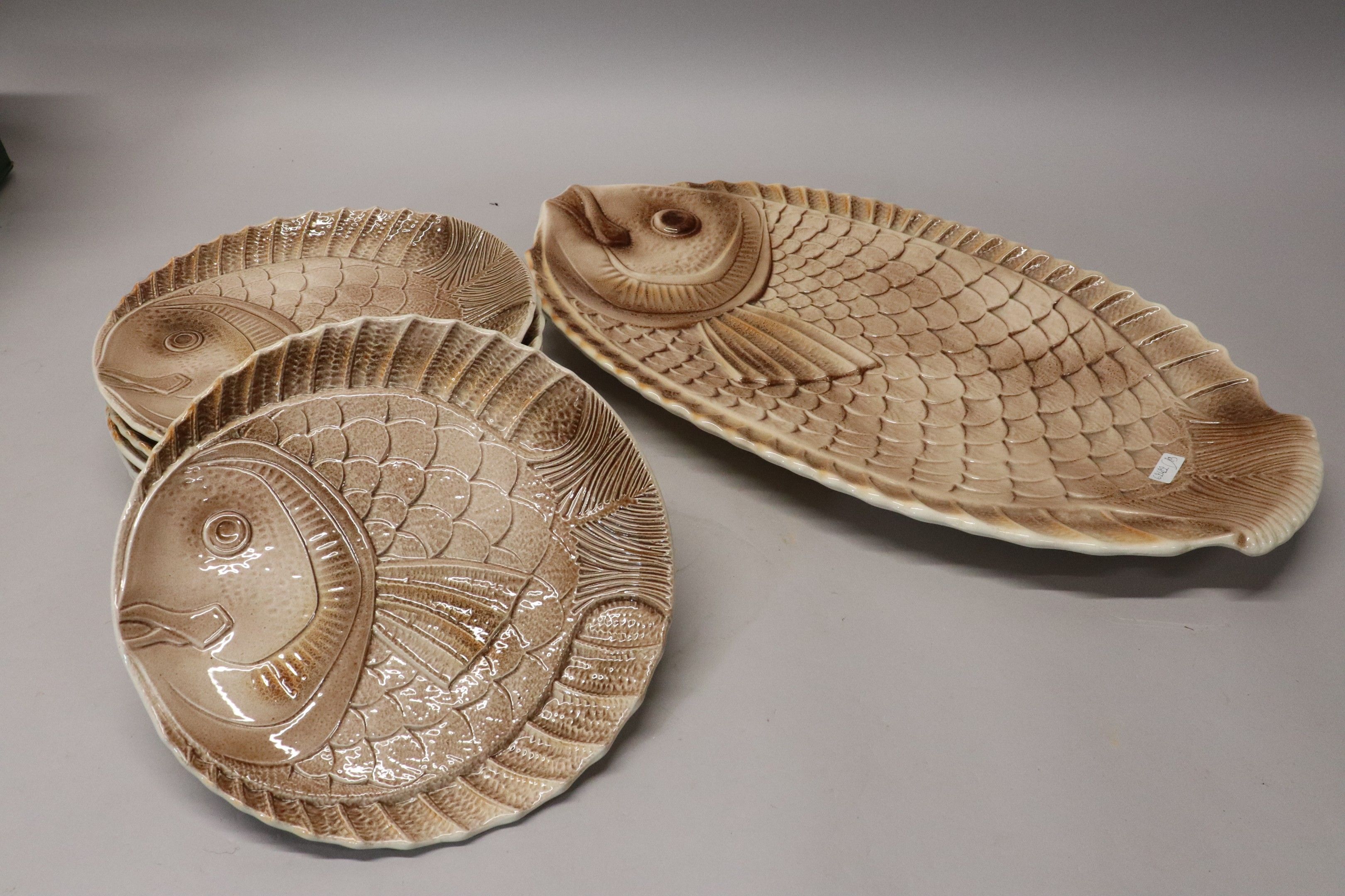 SARREGUEMINES earthenware fish service comprising six plates (diam 25 cm) and a serving dish (55 x 30 cm)