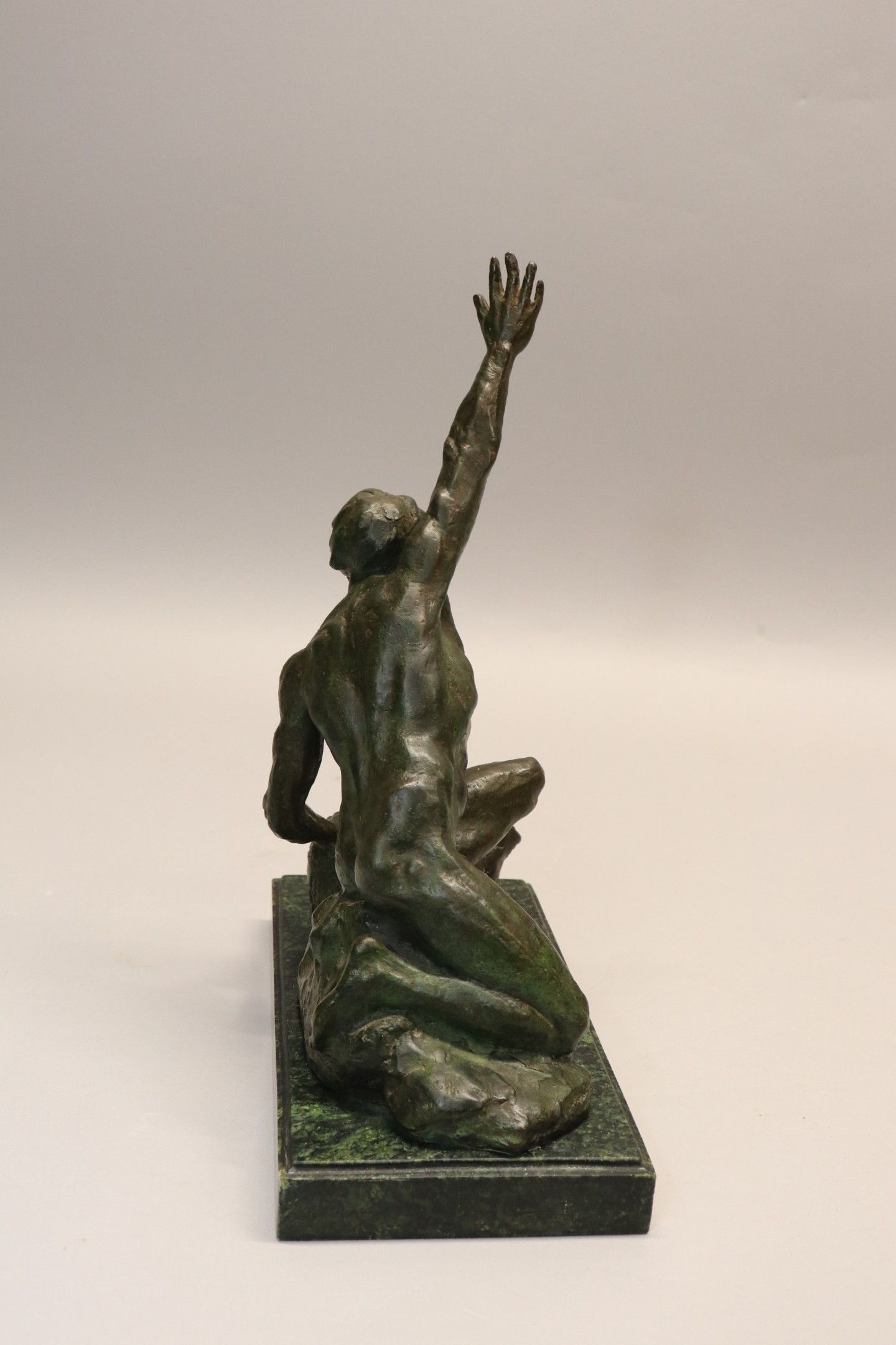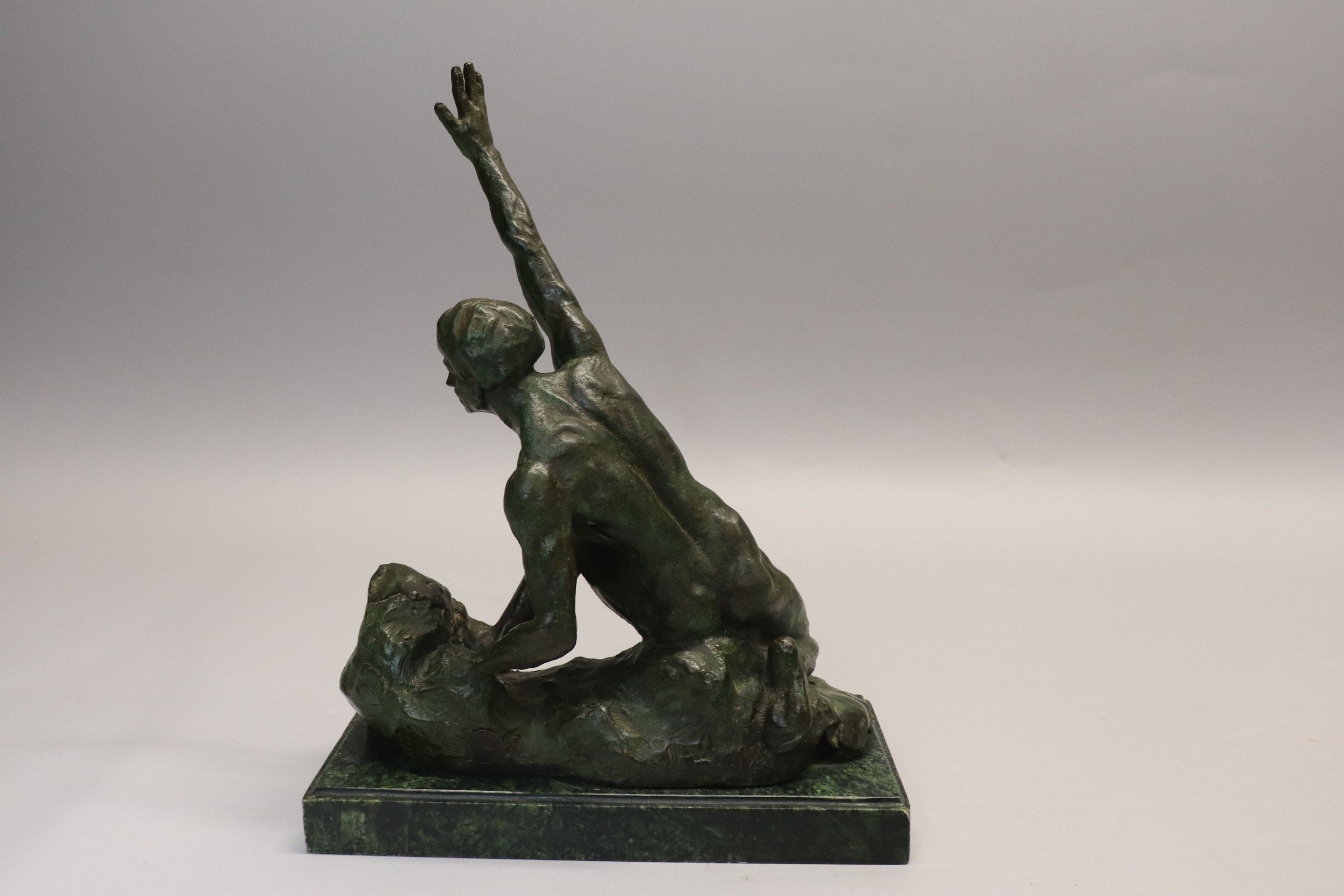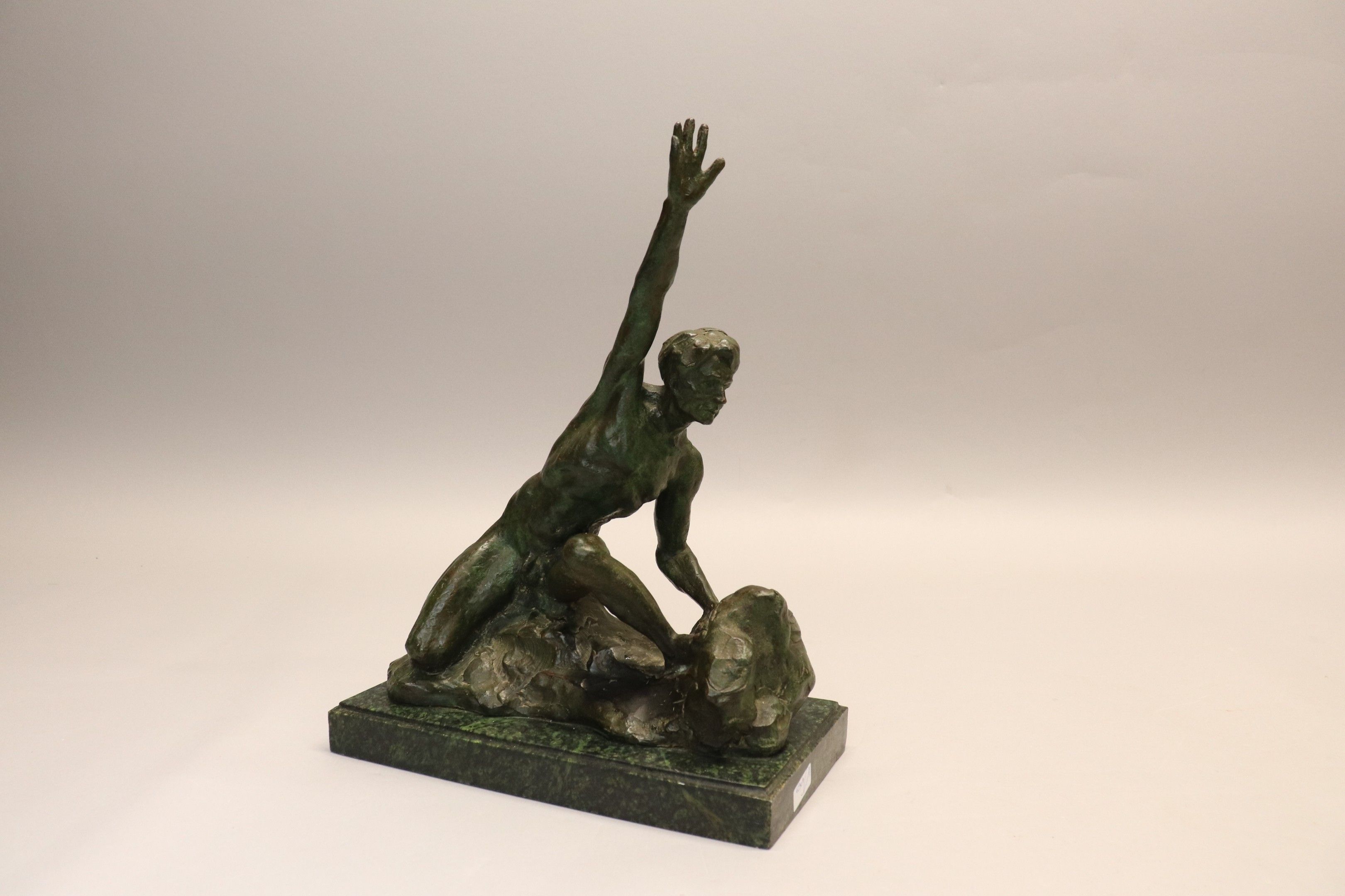 Art Deco green patina bronze subject "Man with outstretched arm", on a rectangular green marble base. 35 x 27 x 14 cm