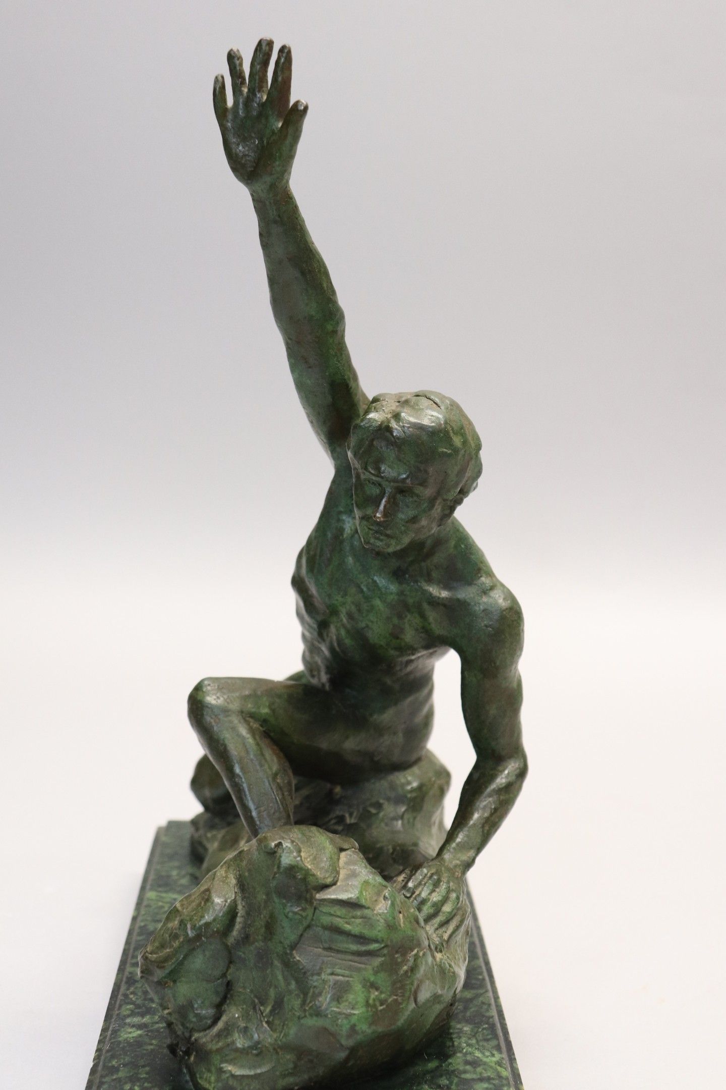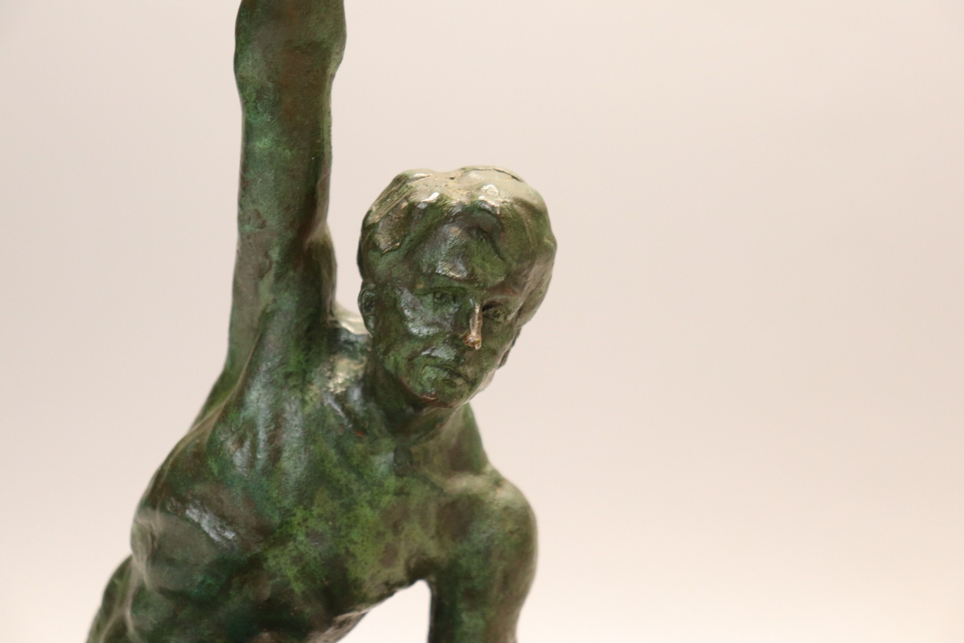 Art Deco green patina bronze subject "Man with outstretched …