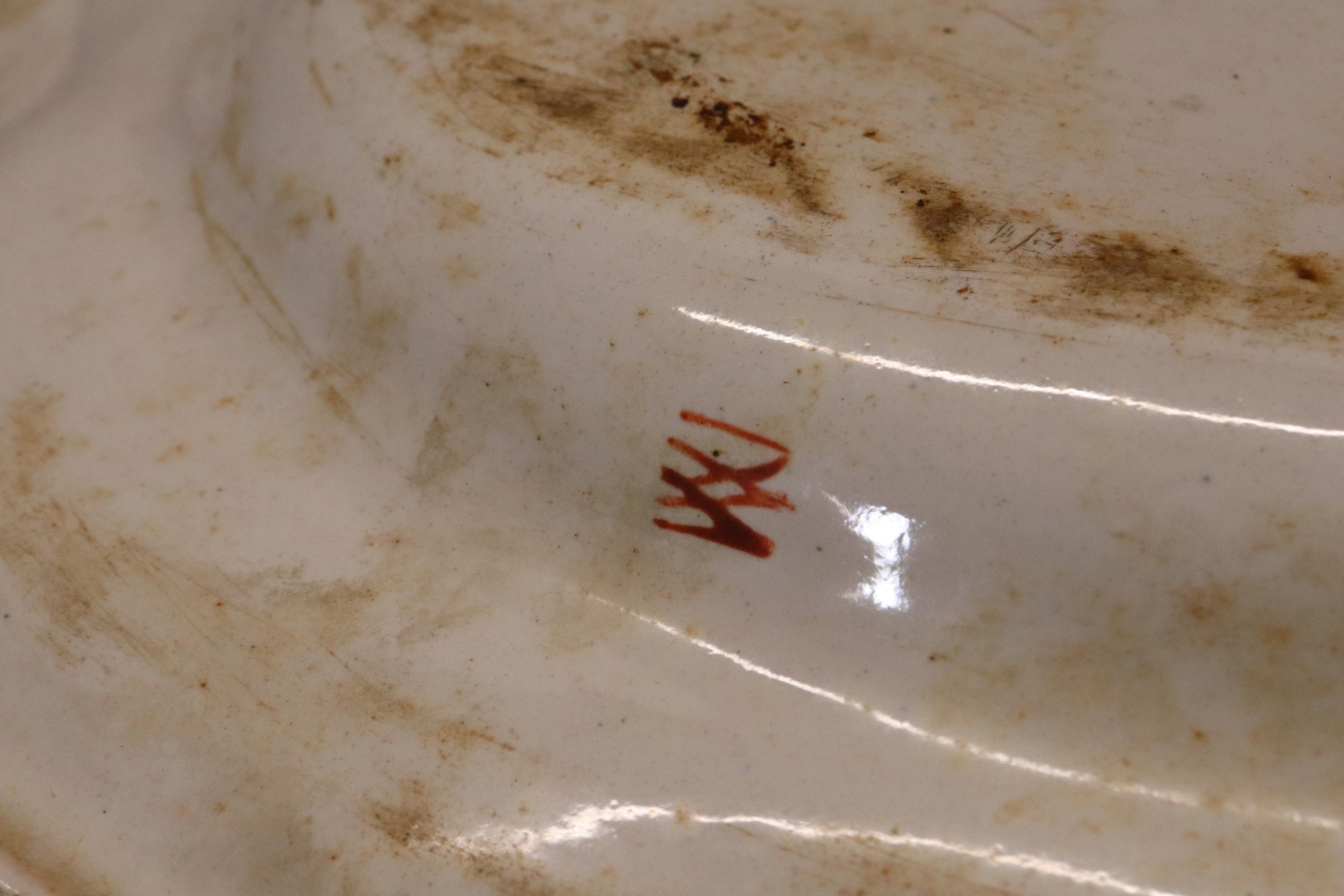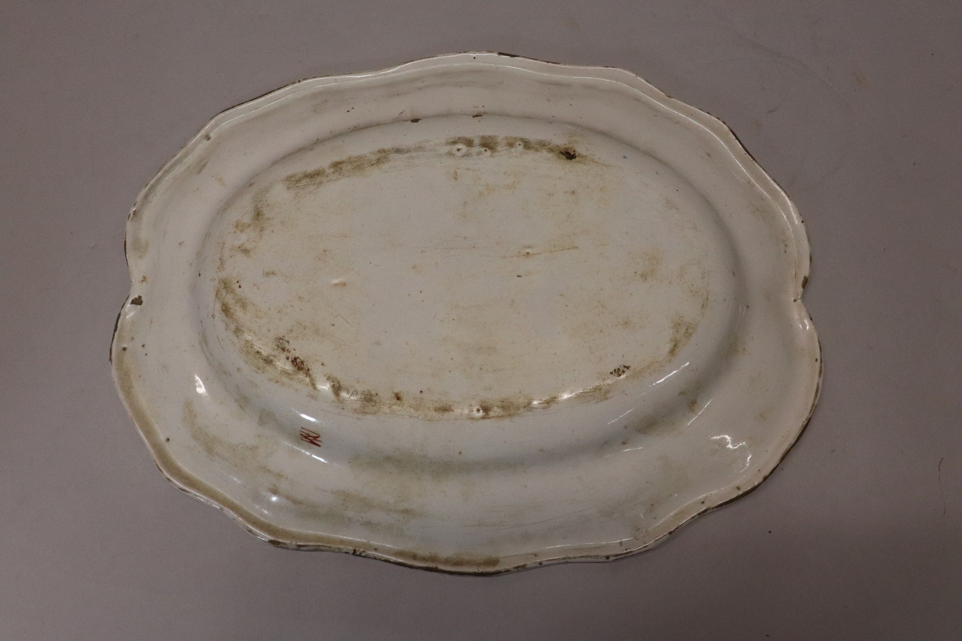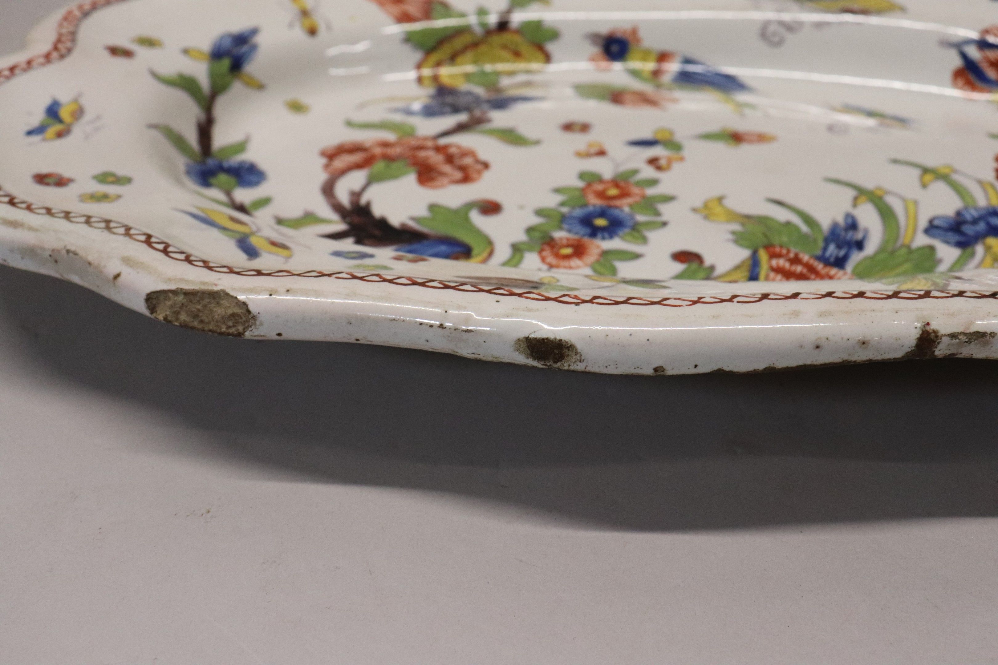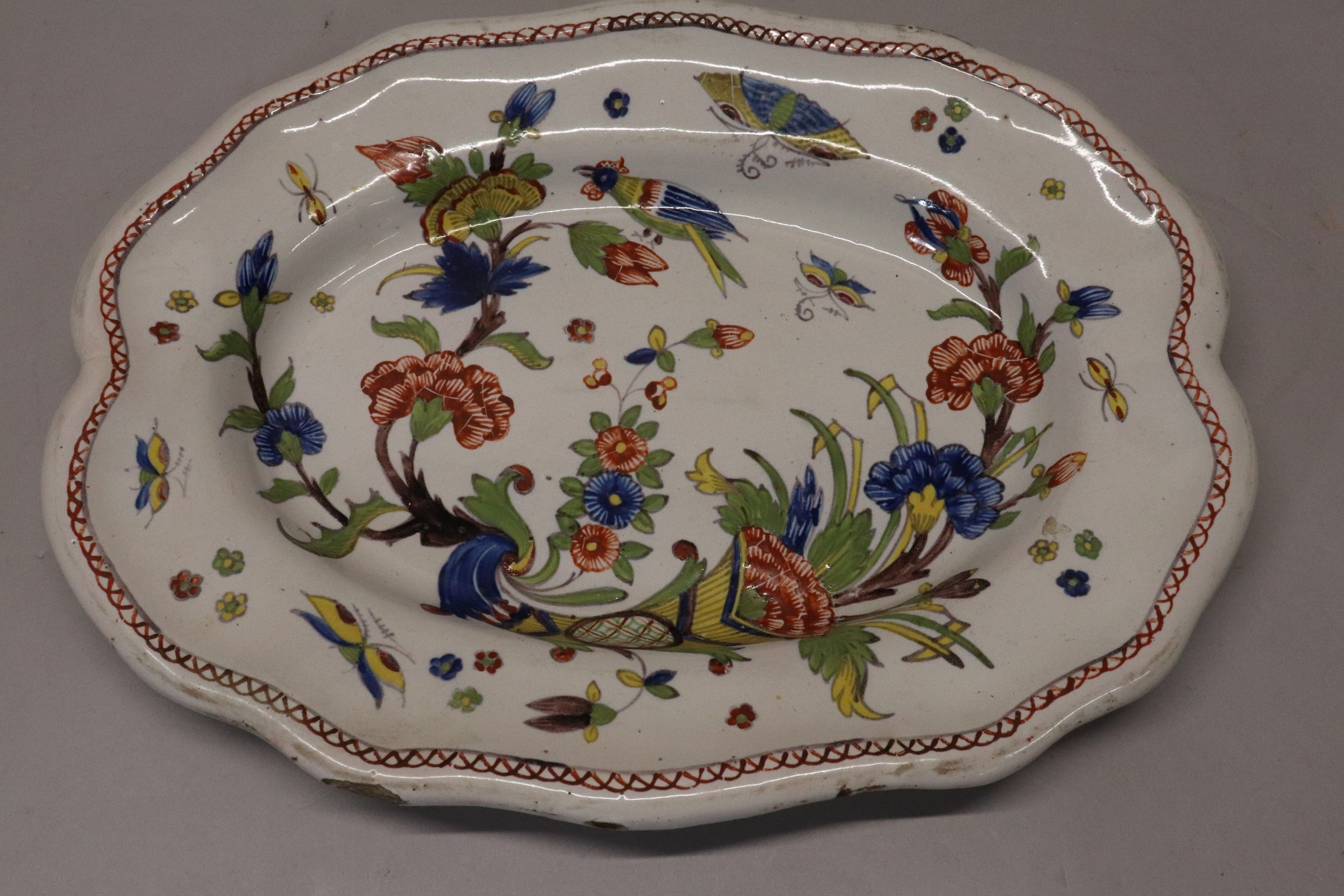 Rouen earthenware dish, ovoid with scalloped edge, polychrome plant and bird decoration, mark on reverse. Chips. 38 x 29 cm
